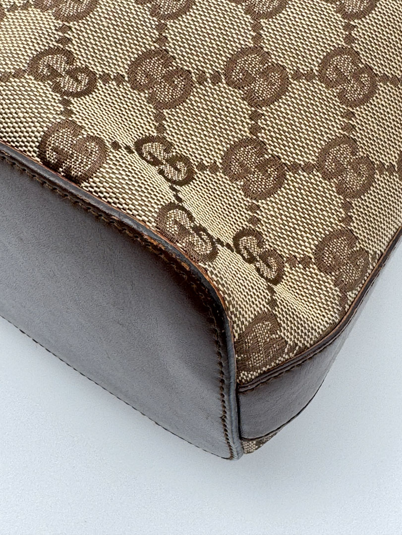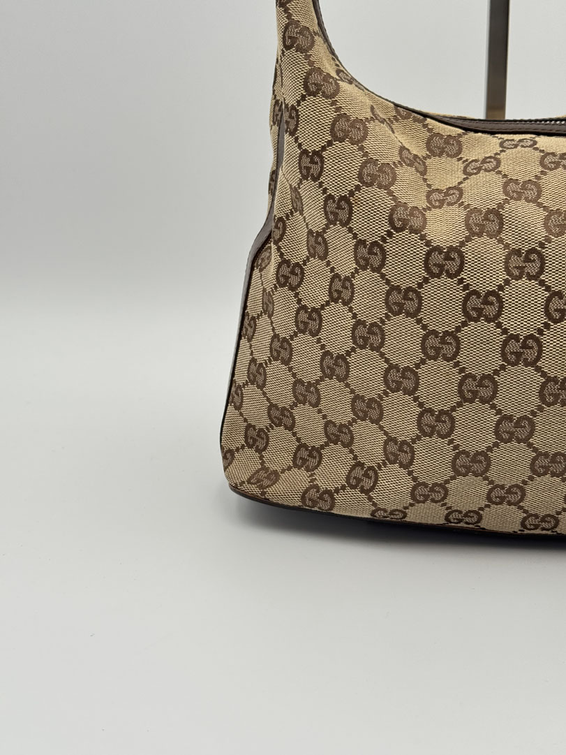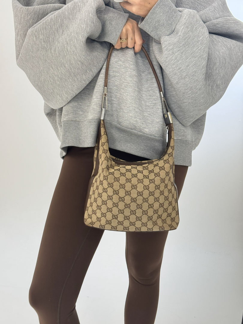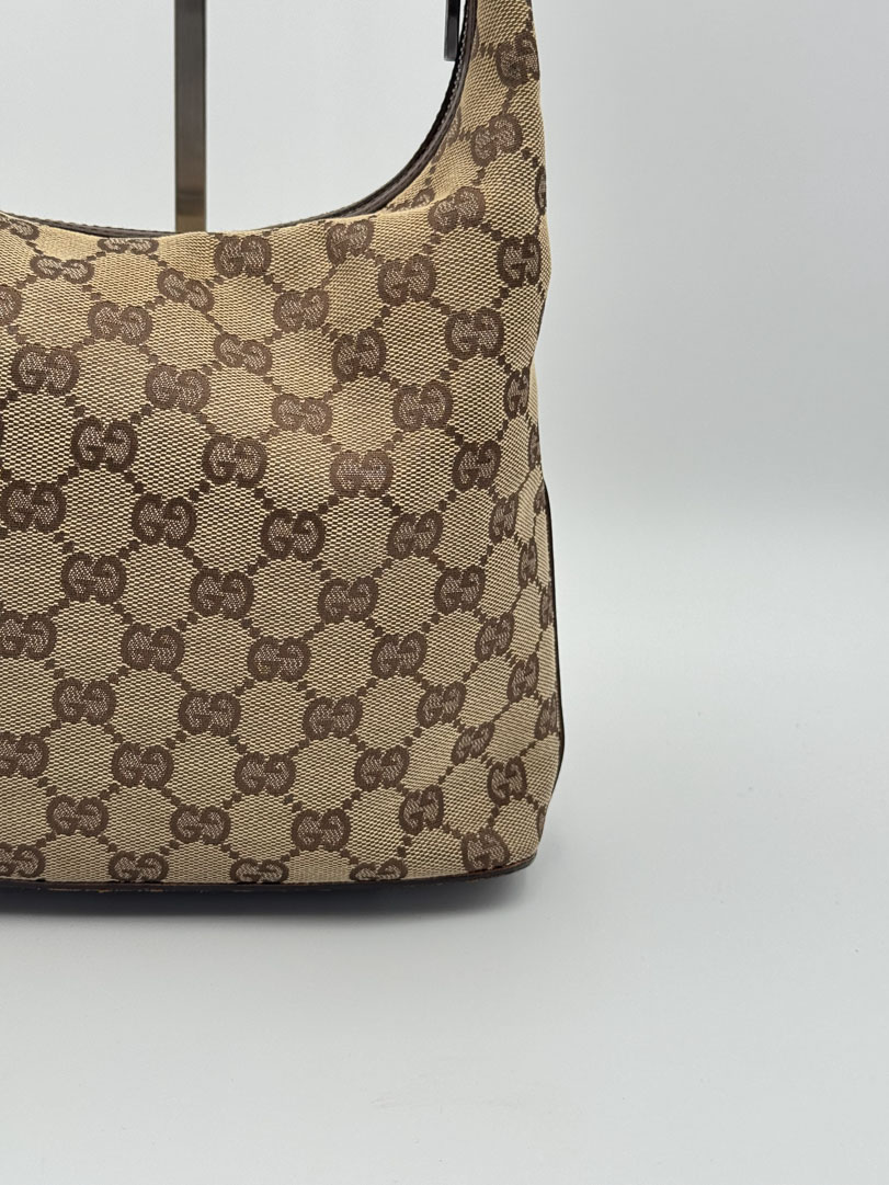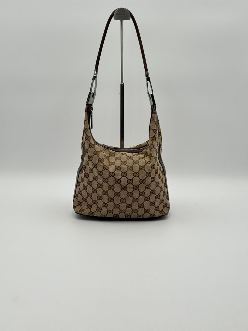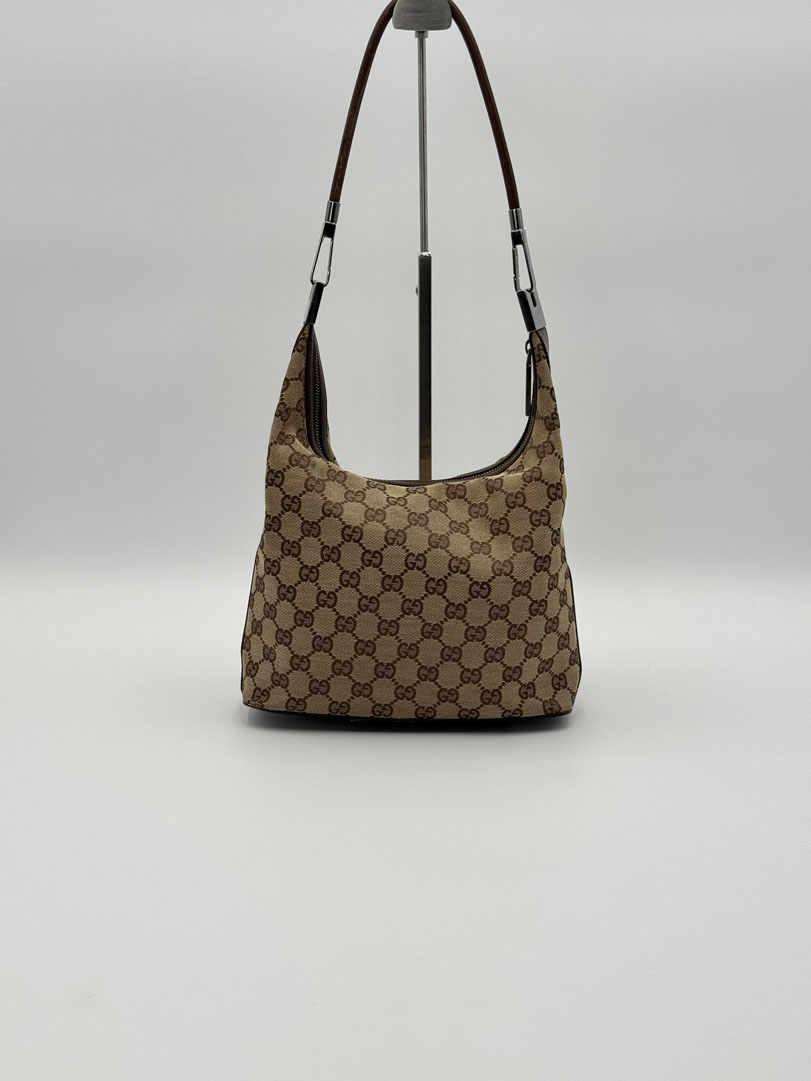 This vintage Gucci GG Canvas Shoulder Bag is a shoulder bag made from brown GG canvas with silver-tone hardware. The item is in very good condition, showing some user signs such as minimal discoloration of the canvas. The interior is clean with an extra pocket, and the zipper functions properly. It comes with a dustbag. The serial number is 001 3814 002122, and the dimensions are 28 x 22 x 11 cm.