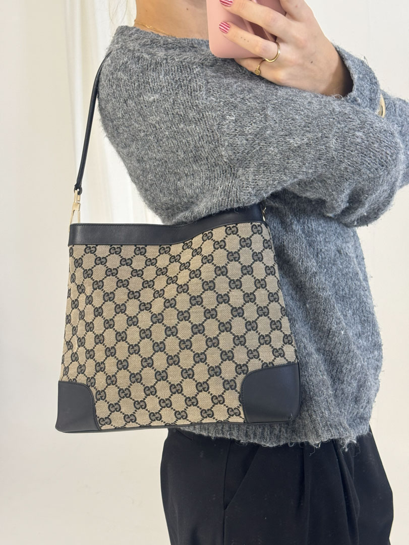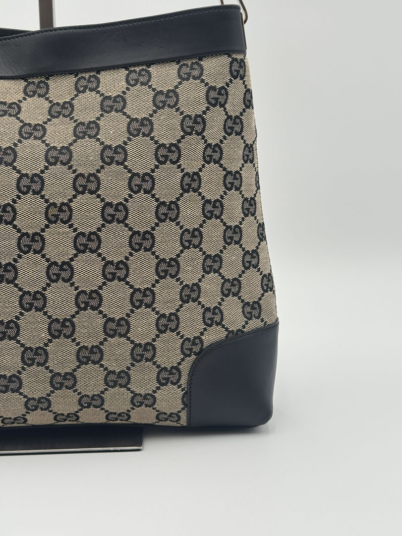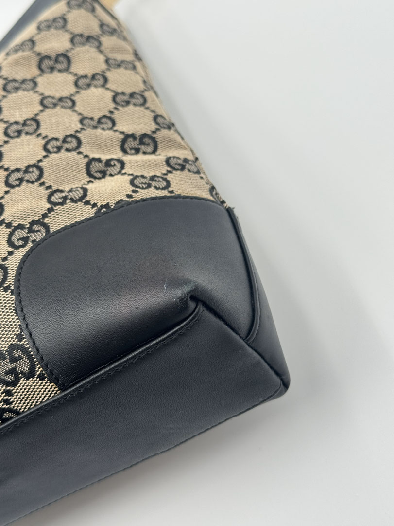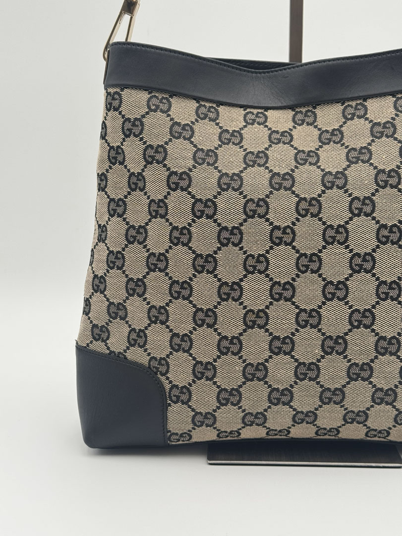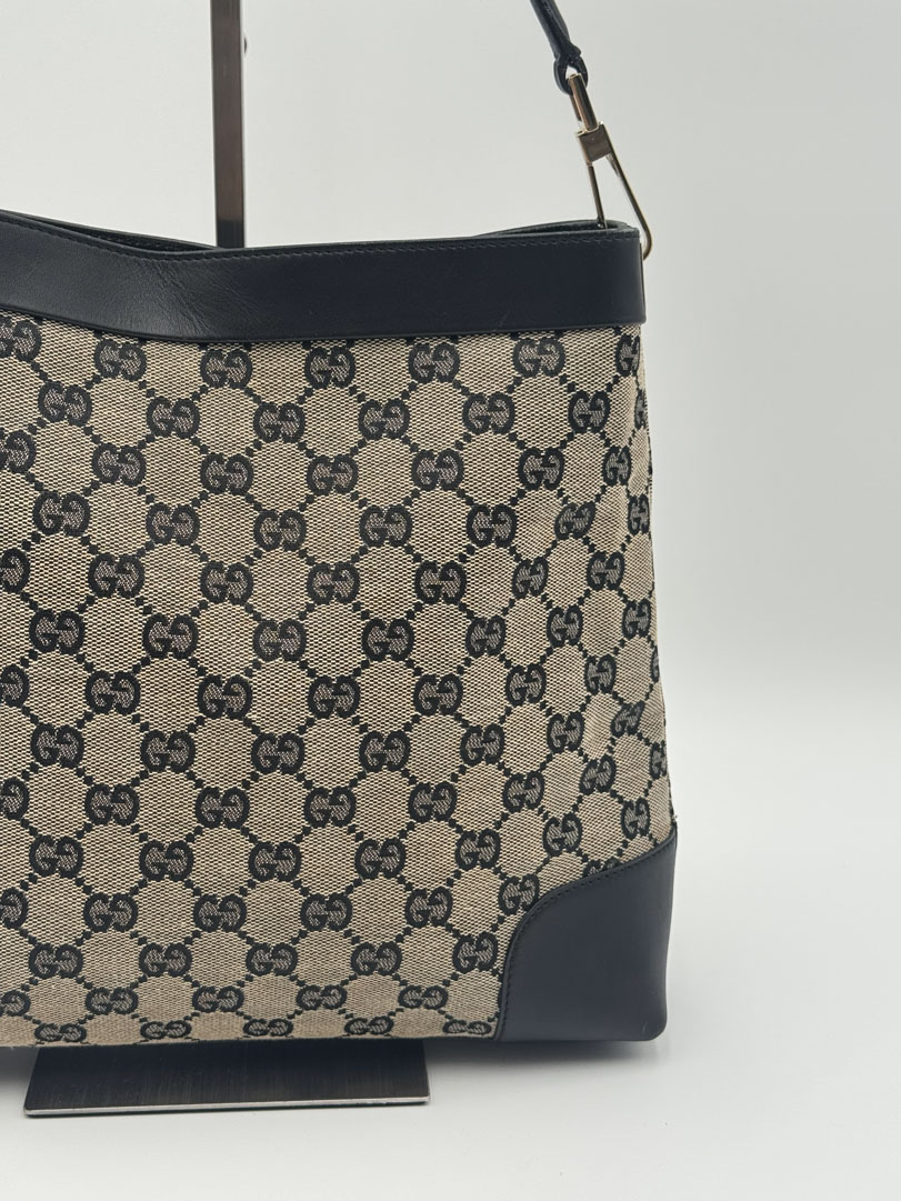 This vintage Gucci GG Canvas Shoulder Bag Black is a shoulder bag made from black GG canvas with champagne-tone hardware. The item is in very good condition, showing some user signs such as minimal wear on the corners. The interior is clean and features an extra pocket. Dimensions are 30 x 26 x 5.5 cm. The serial number is 001 4231 000926.