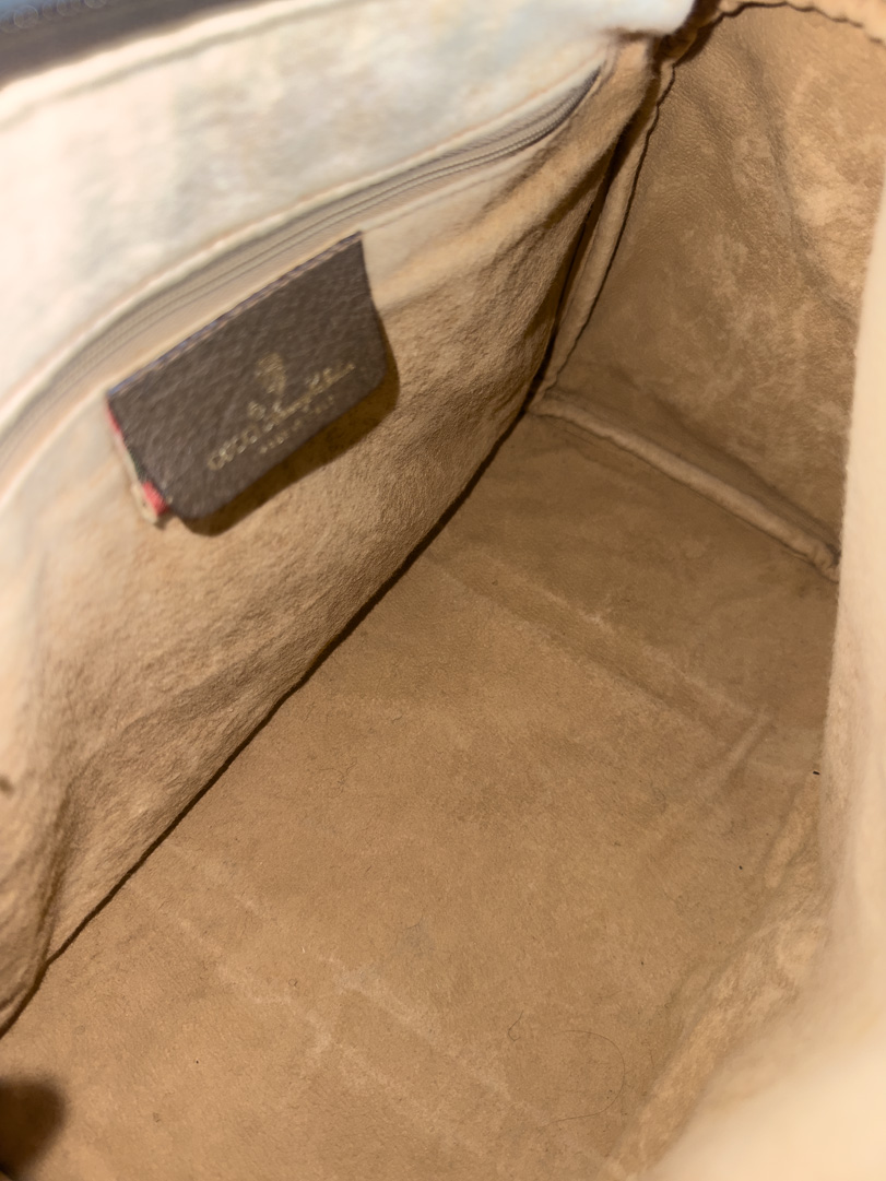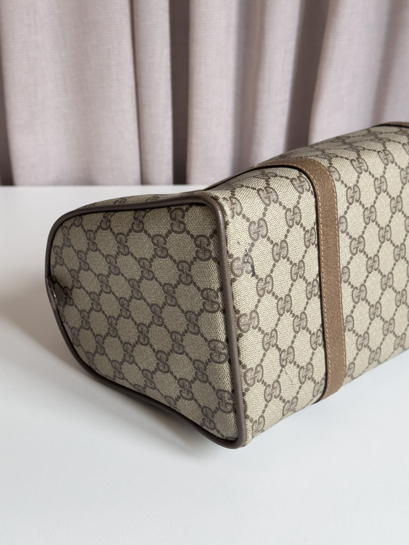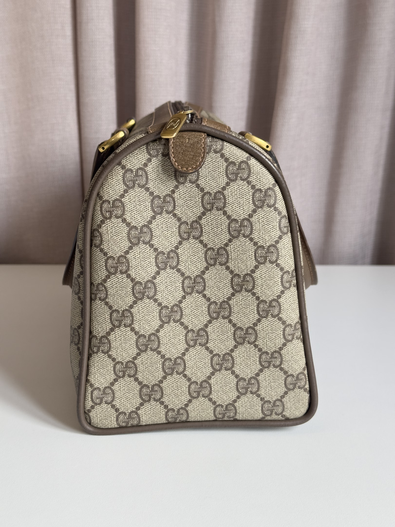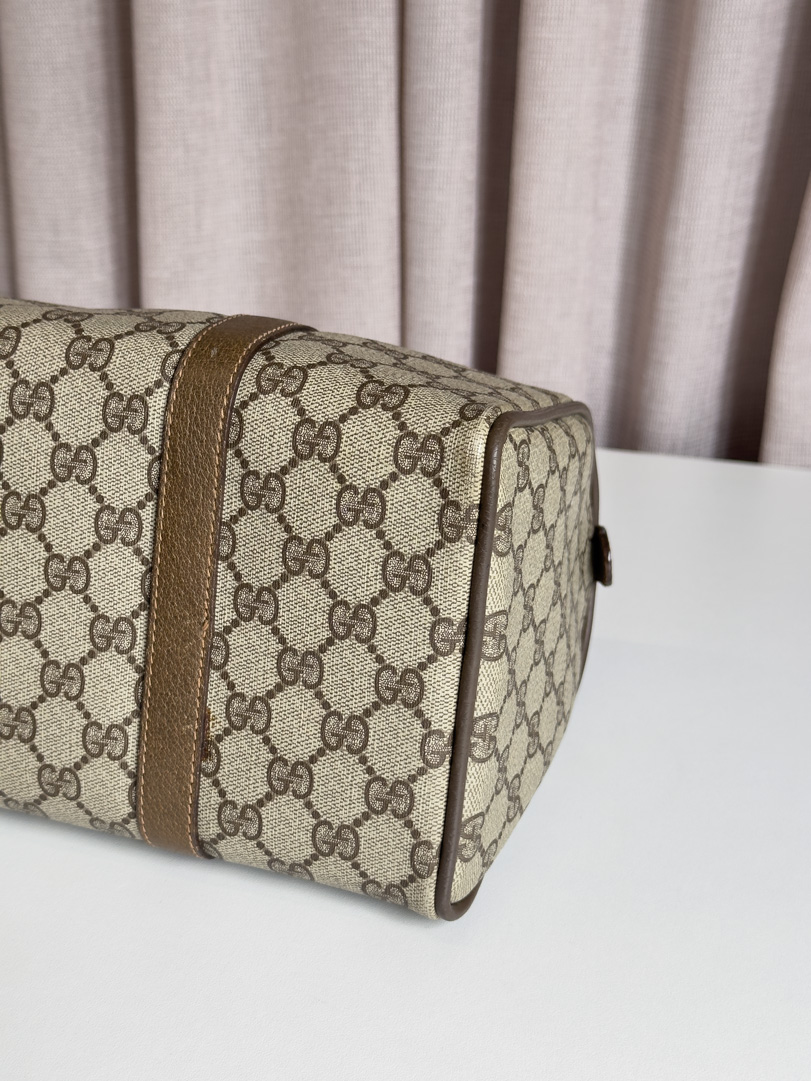 This vintage Gucci GG Supreme Web Sherry Line is a brown handbag crafted from GG Supreme canvas with gold-tone hardware. In very good condition, it has a clean interior with an extra zippered pocket, though the lining has slight peeling that does not transfer. The zipper works well. The serial number is 3902007. Dimensions: 31 x 19 x 14 cm.