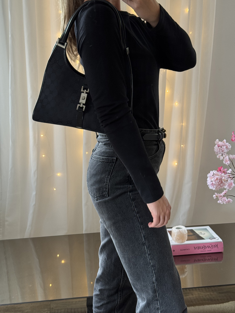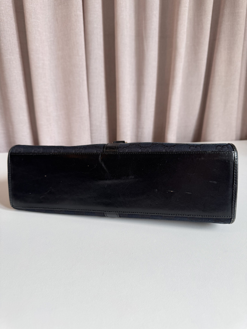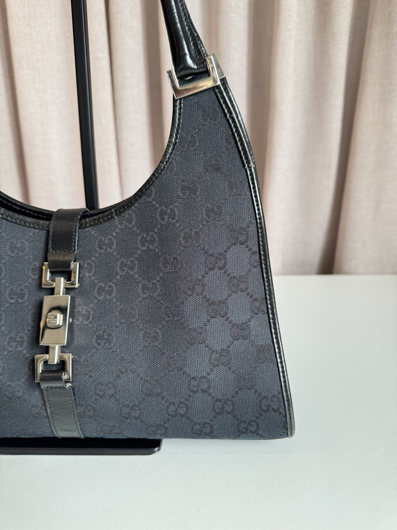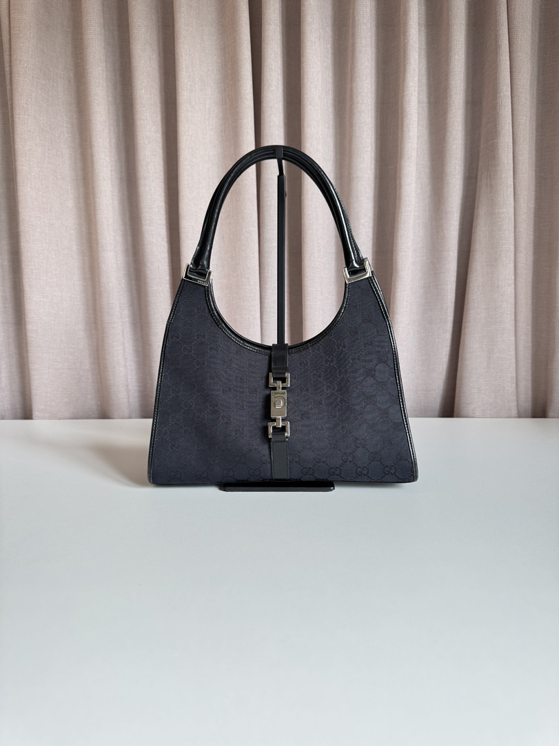 This vintage Gucci Jackie Black is a stylish shoulder bag made from navy GG canvas with black leather and silver-tone hardware. It is in very good condition, with some corner wear but otherwise in great vintage shape. The interior is clean and includes a zippered pocket for extra storage. The serial number is 210672123. Dimensions: 31 x 24 x 10 cm.