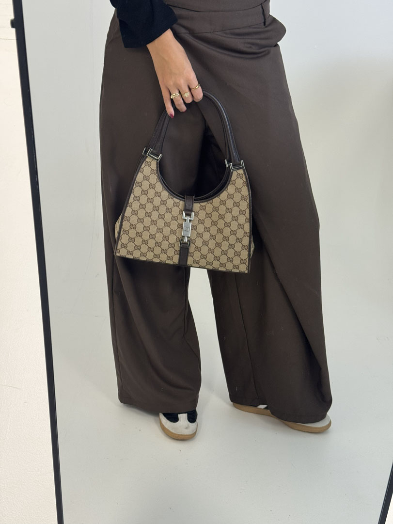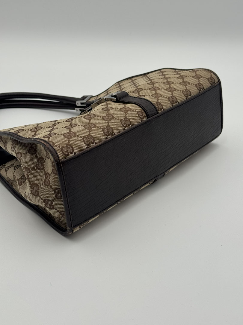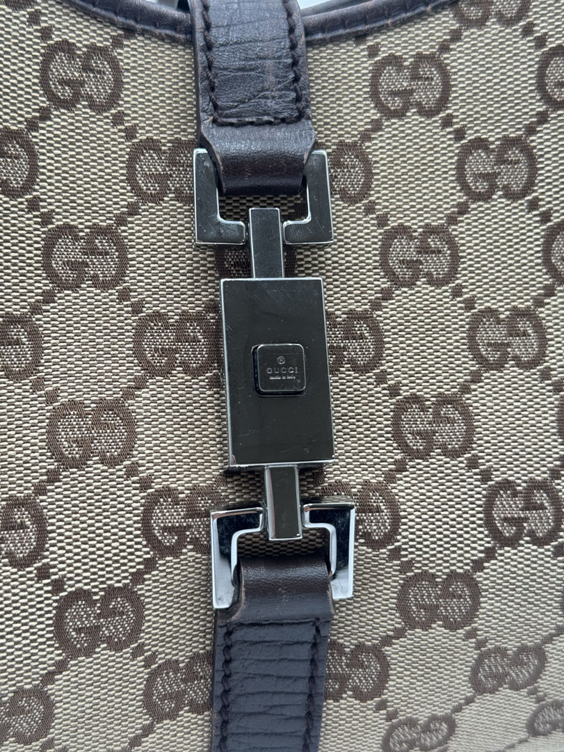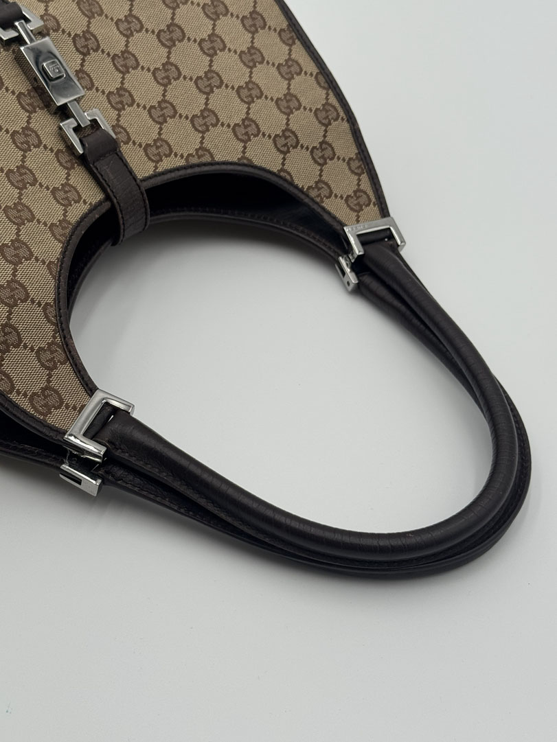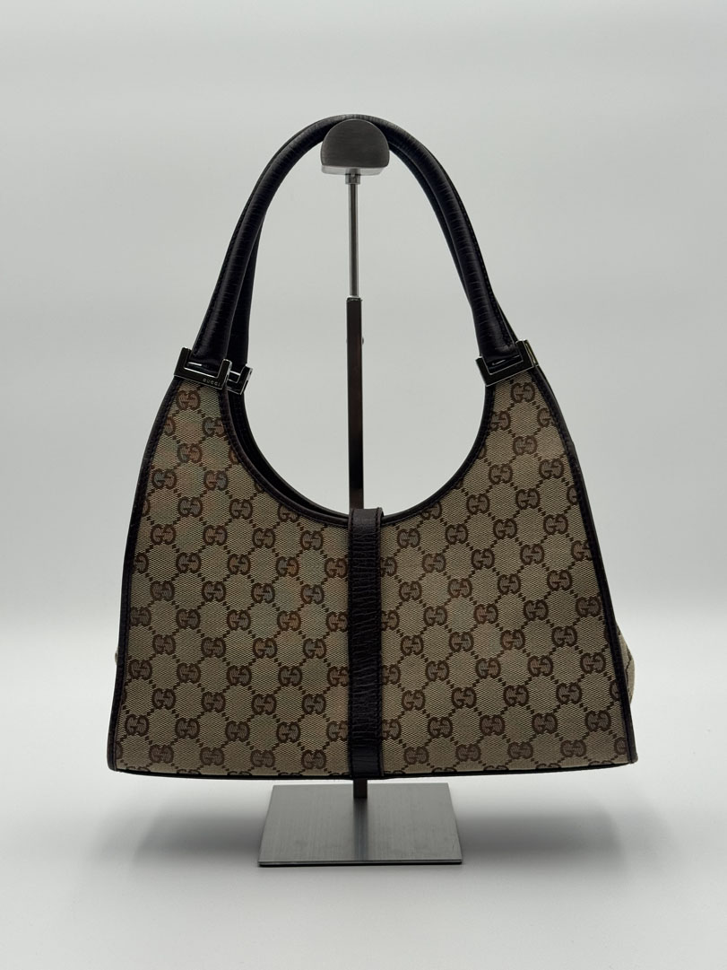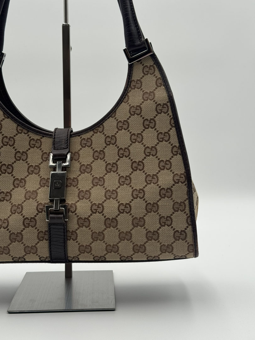 This vintage Gucci Jackie Shoulder Bag is a shoulder bag crafted from brown GG canvas with silver-tone hardware. It is in very good condition, with some wear on the leather corners while the canvas remains clean and intact. The hardware still shines nicely, and the bag closes with the signature front lock. The interior is clean with an extra pocket. The serial number is 1719214397. Dimensions: 30 x 17 x 8 cm.