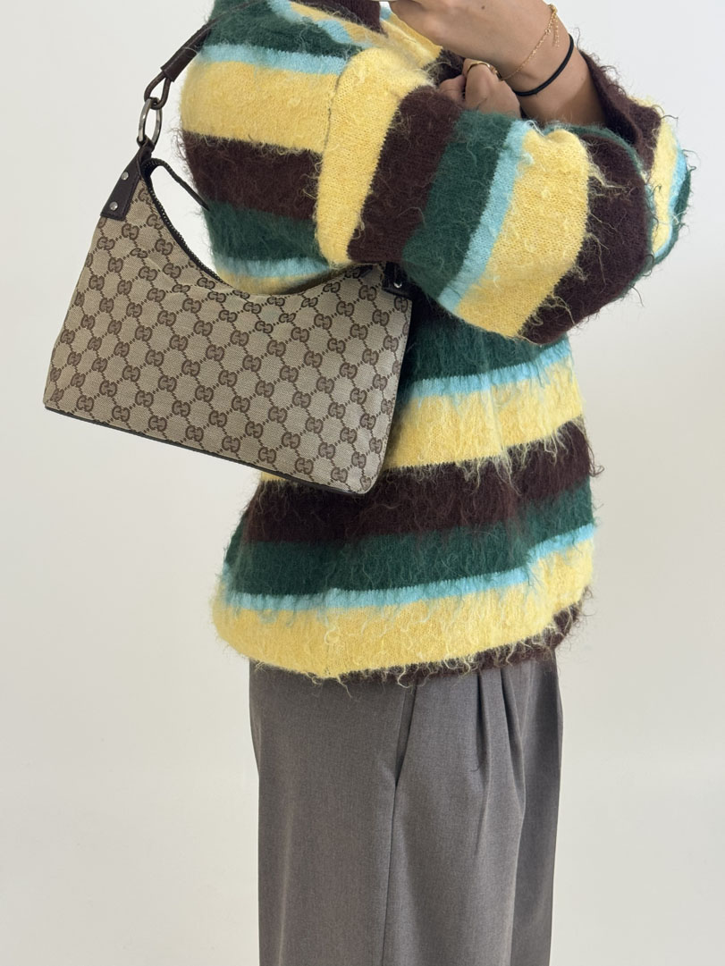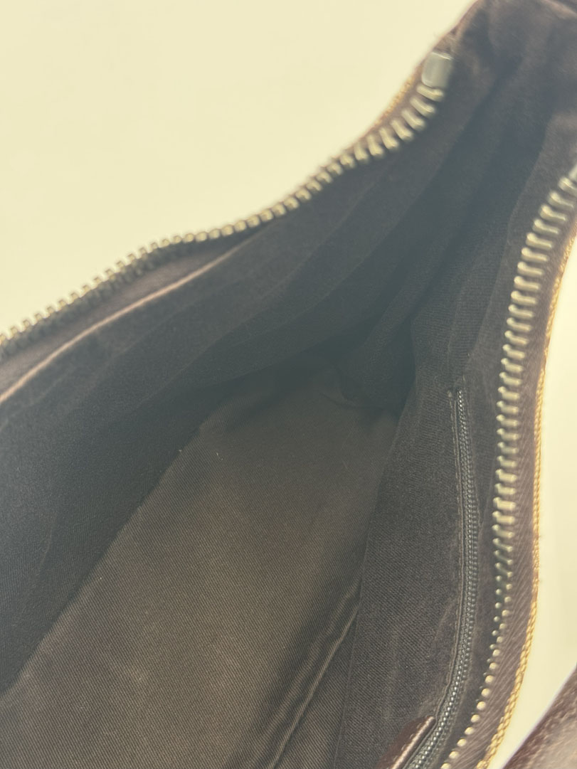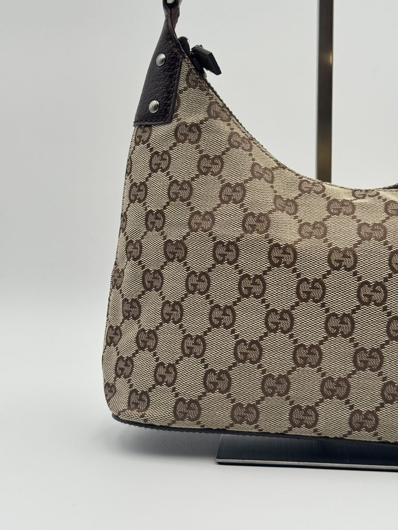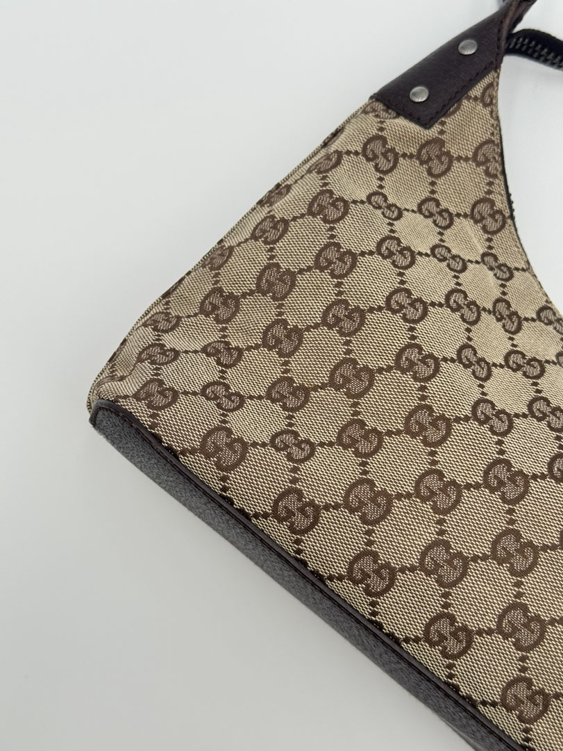 This vintage Gucci Lock GG Canvas Bag is a shoulder bag crafted from brown GG canvas with gold-tone hardware. It is in very good condition, showing light imperfections such as wear on the corners and small scratches on the hardware. The interior is clean with an extra pocket, and the bag closes with a zipper that is still in very good working condition. The serial number is 1150023444. Dimensions: 30 x 14 x 10 cm.