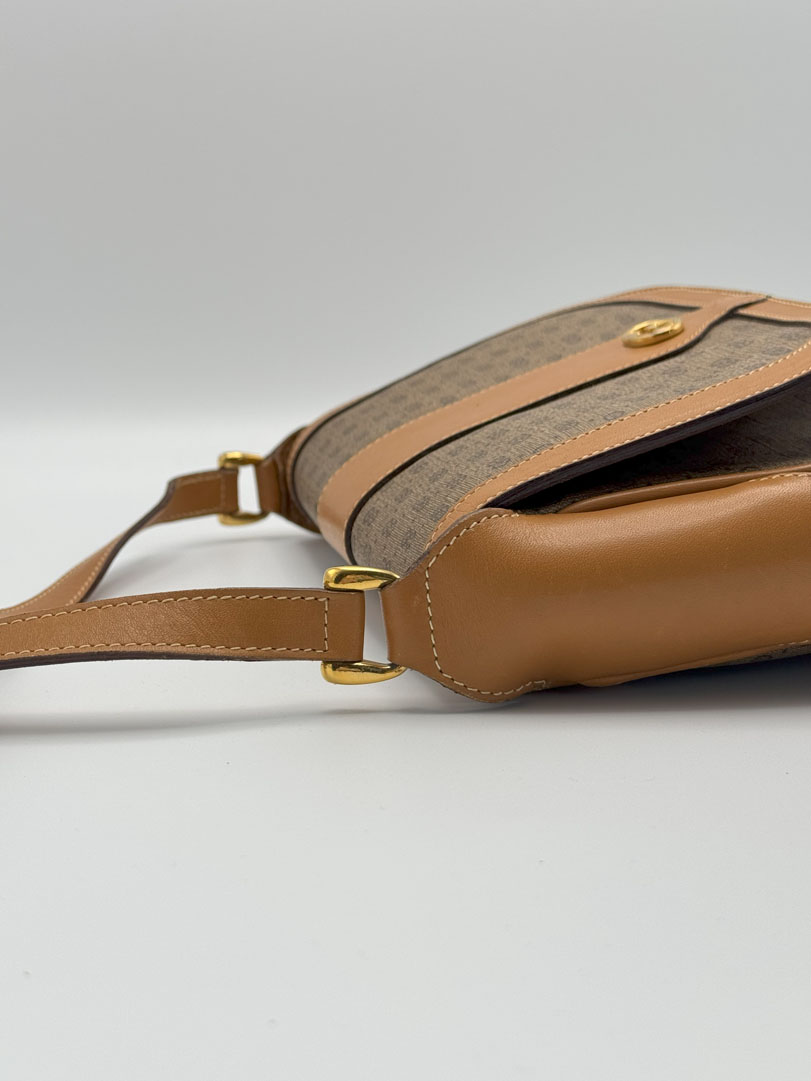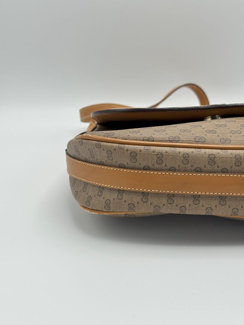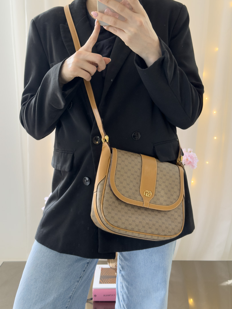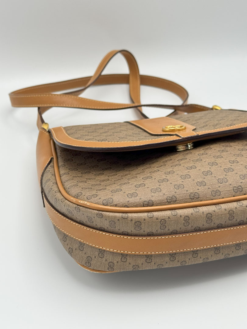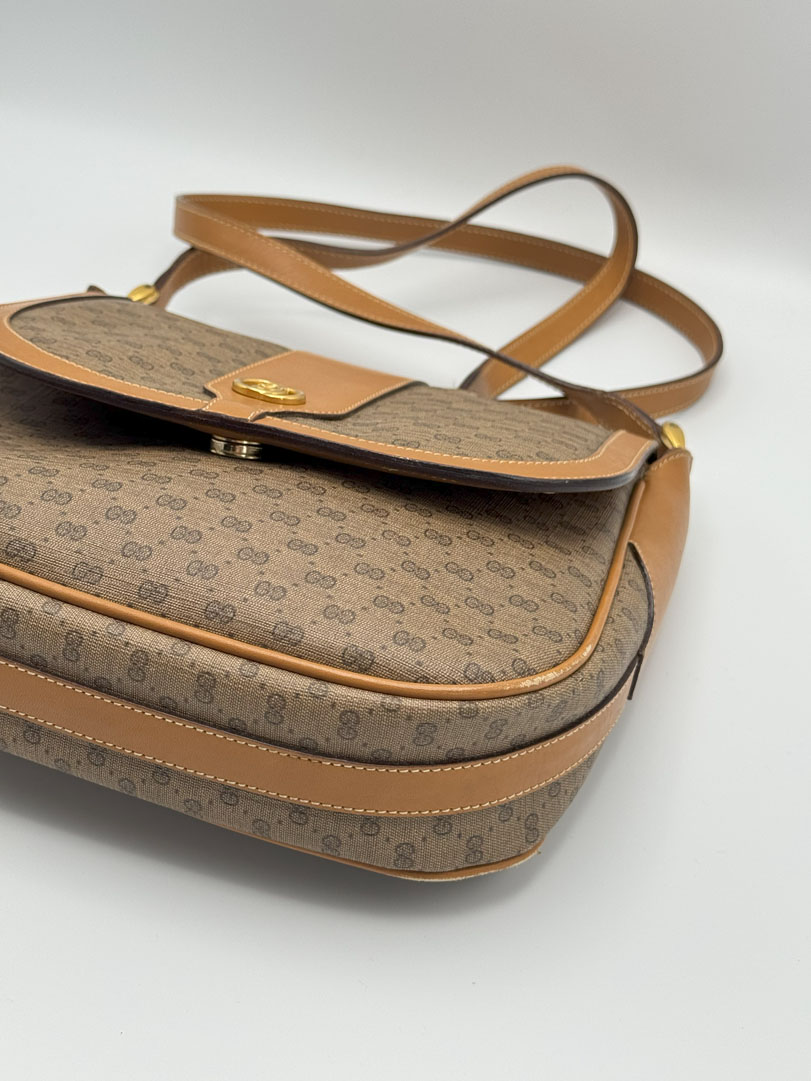 This vintage Gucci Micro GG Supreme Shoulder Bag is a brown crossbody crafted from Supreme canvas with gold-tone hardware. In very good condition, it has a clean interior with an extra zippered pocket, some light corner wear, and minor scratches inside. The strap is adjustable, and the bag closes with a magnetic snap. Dimensions: 23 x 20 x 5 cm.