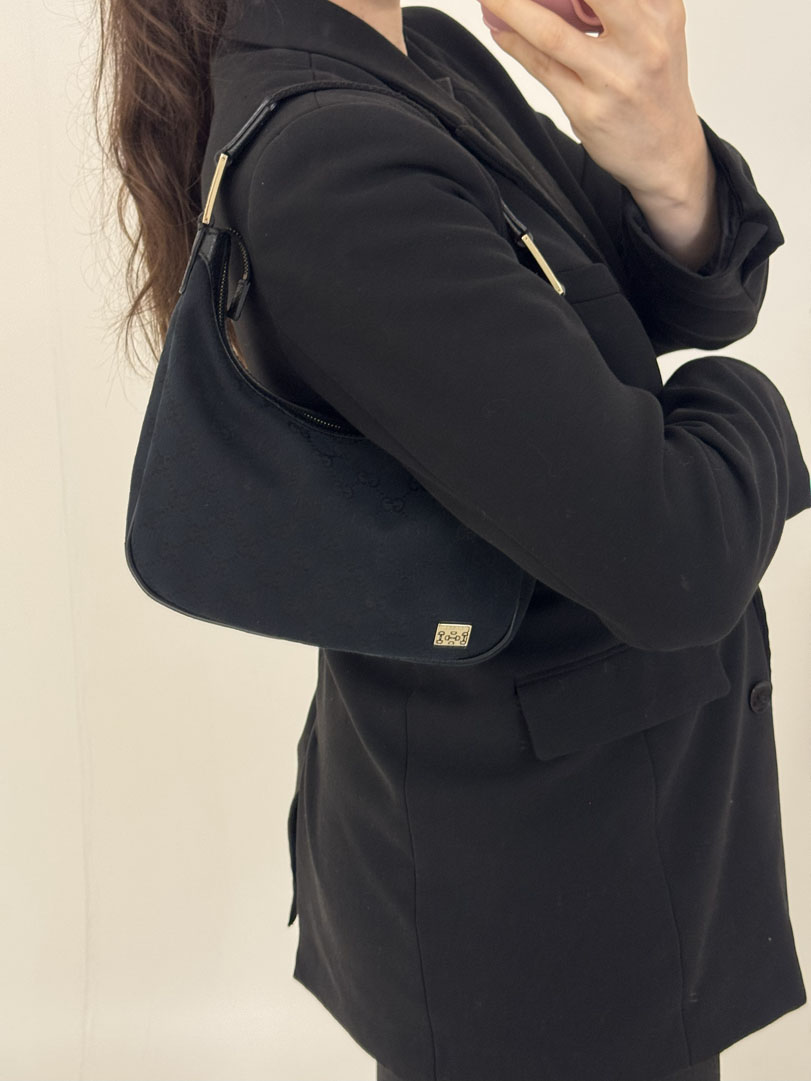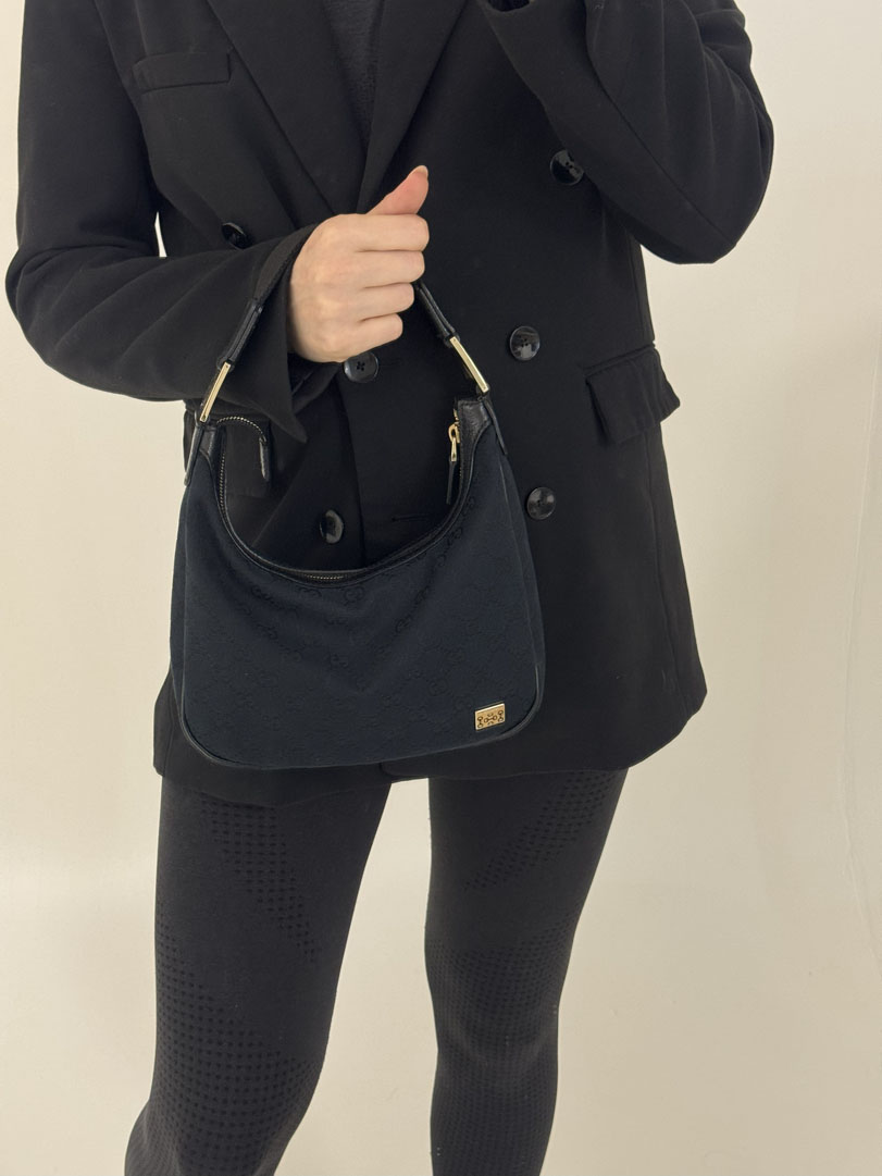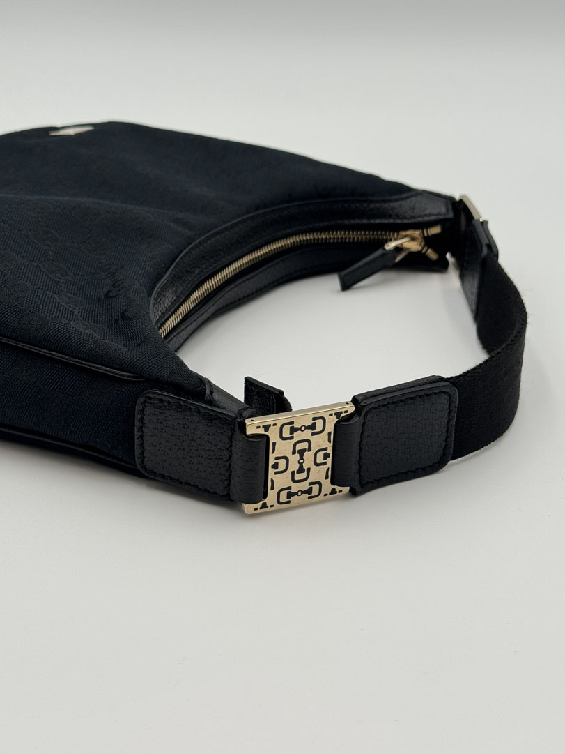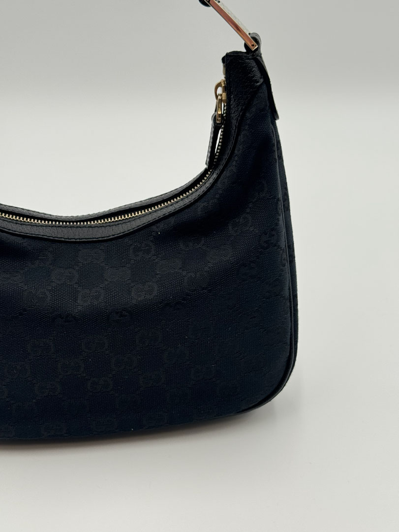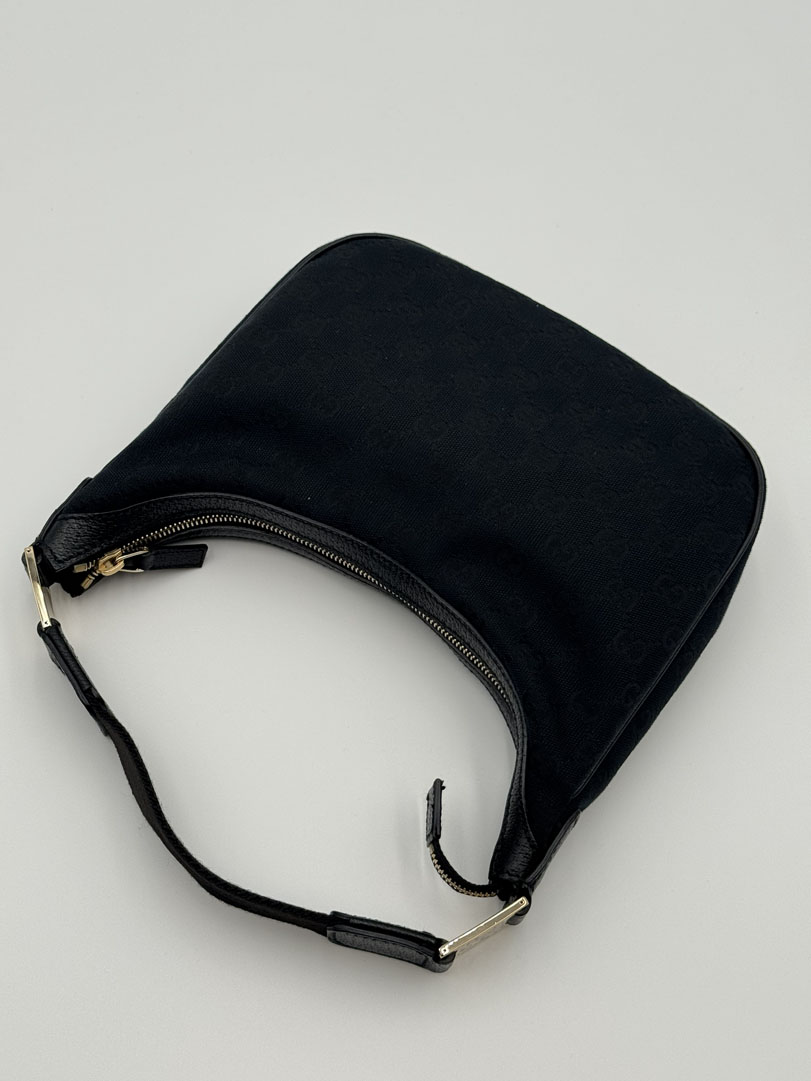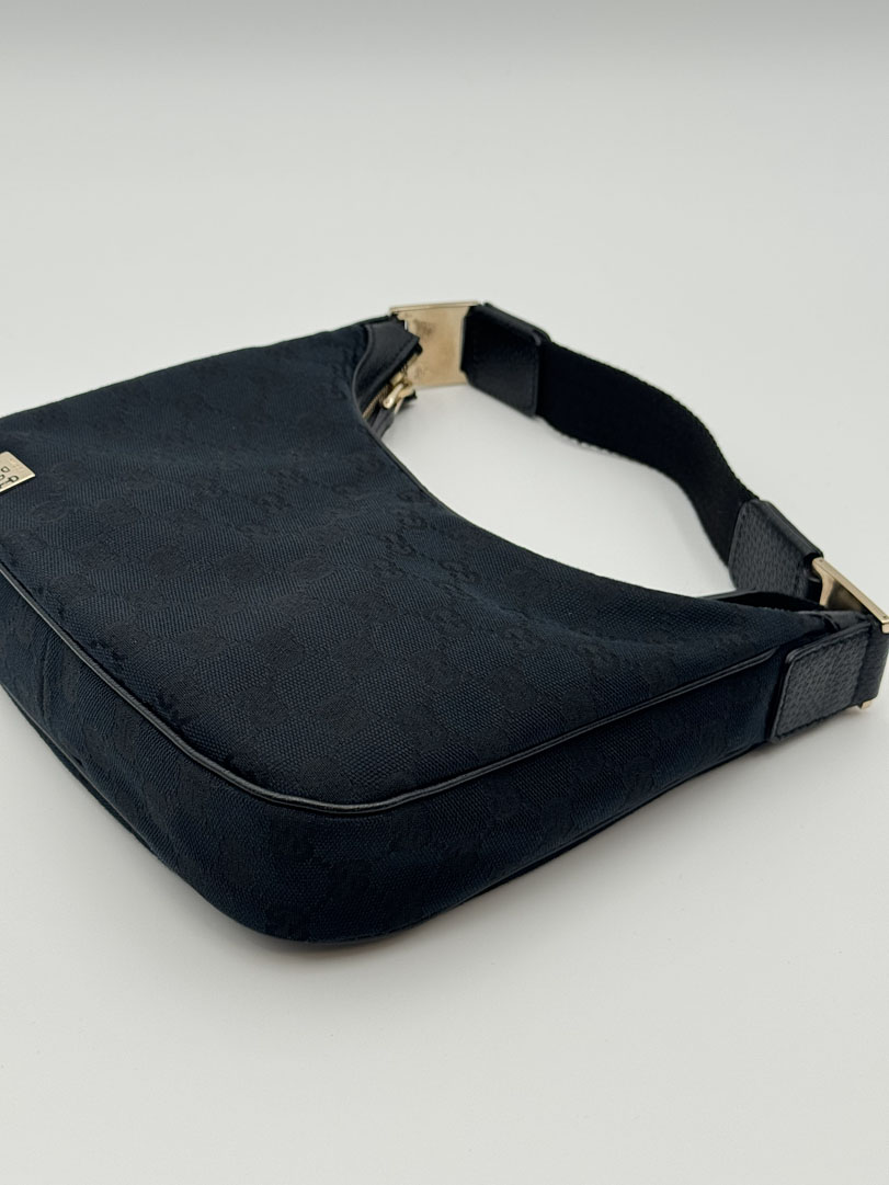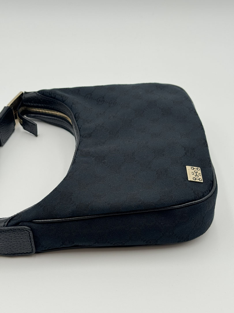 This vintage Gucci Mini Hobo Bag is a shoulder bag crafted from black GG Canvas with silver-tone hardware. It is in very good condition, with minimal to no signs of use. The bag is cute and compact, with a clean interior and an extra pocket. Dimensions: 17 x 24 x 10 cm. Serial number: 1458112684.