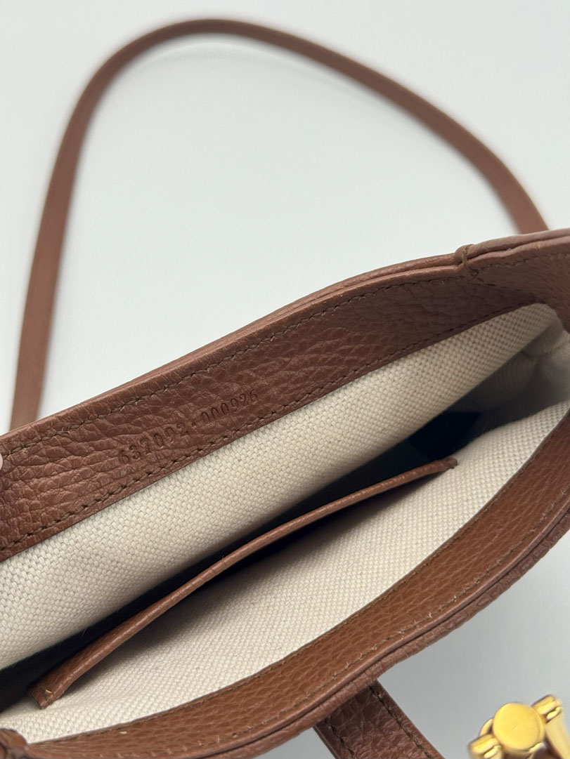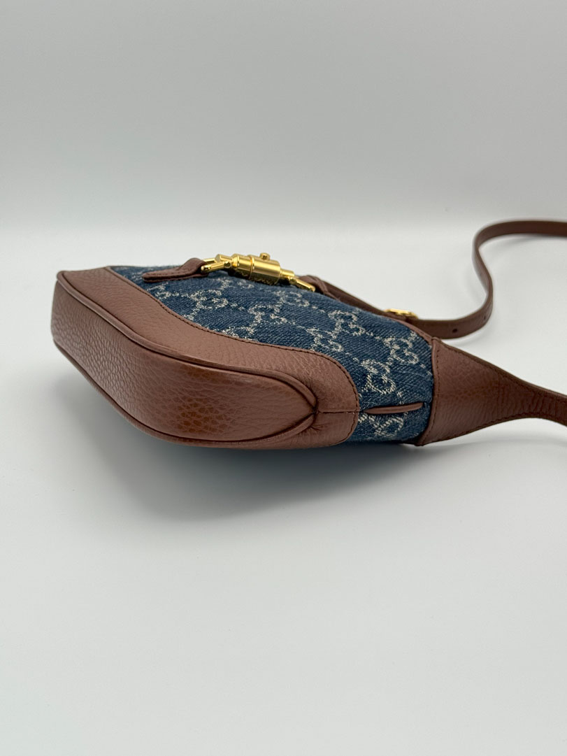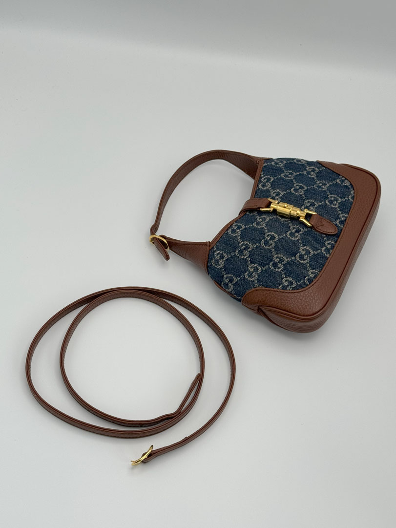 This preloved Gucci Mini Jackie 1961 is a crossbody bag crafted from blue denim with brown leather details and gold-tone hardware. It is in excellent condition, clean with an extra pocket. The bag comes with a long strap for crossbody wear, as well as a dustbag and box. The serial number is 637092000926. Dimensions: 20 x 13 x 4 cm.