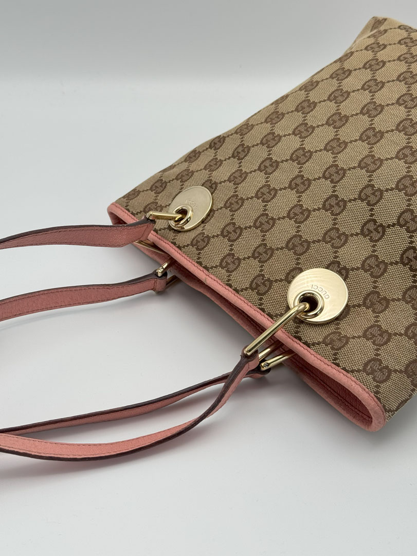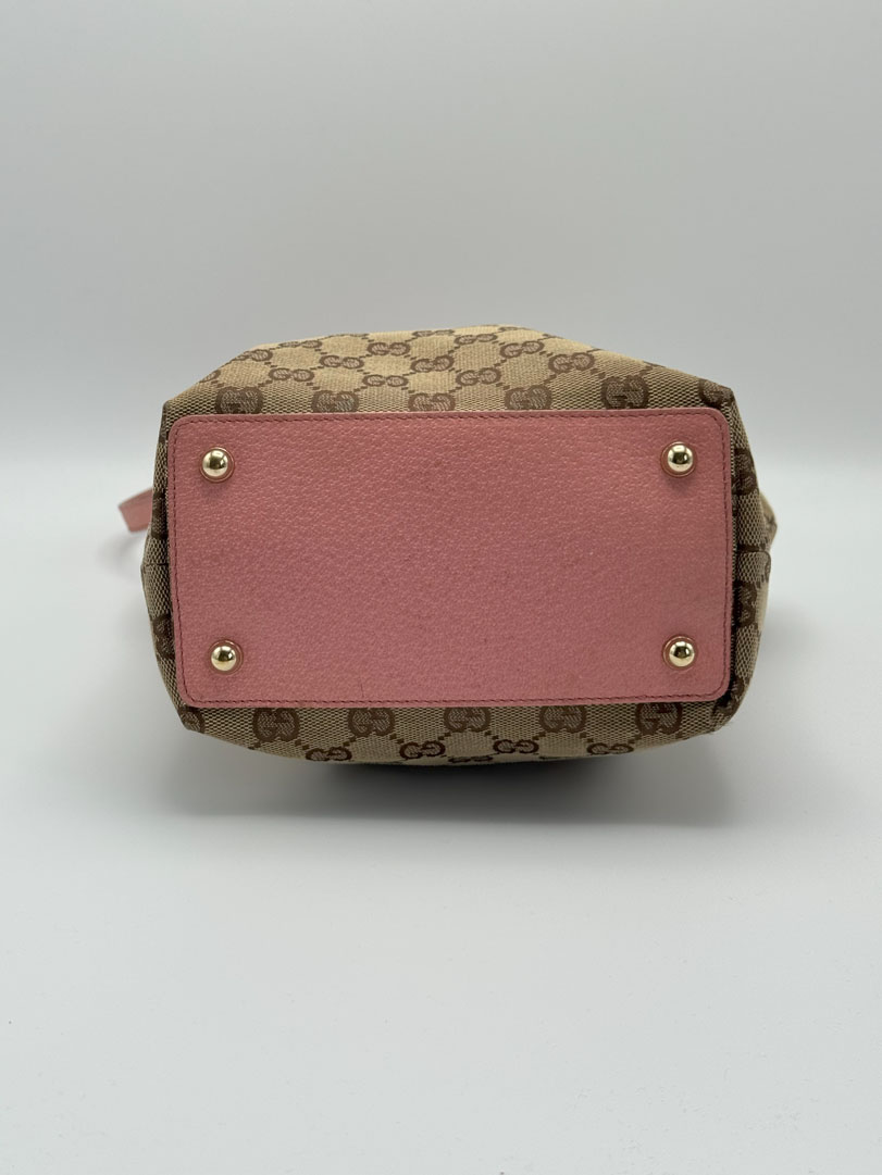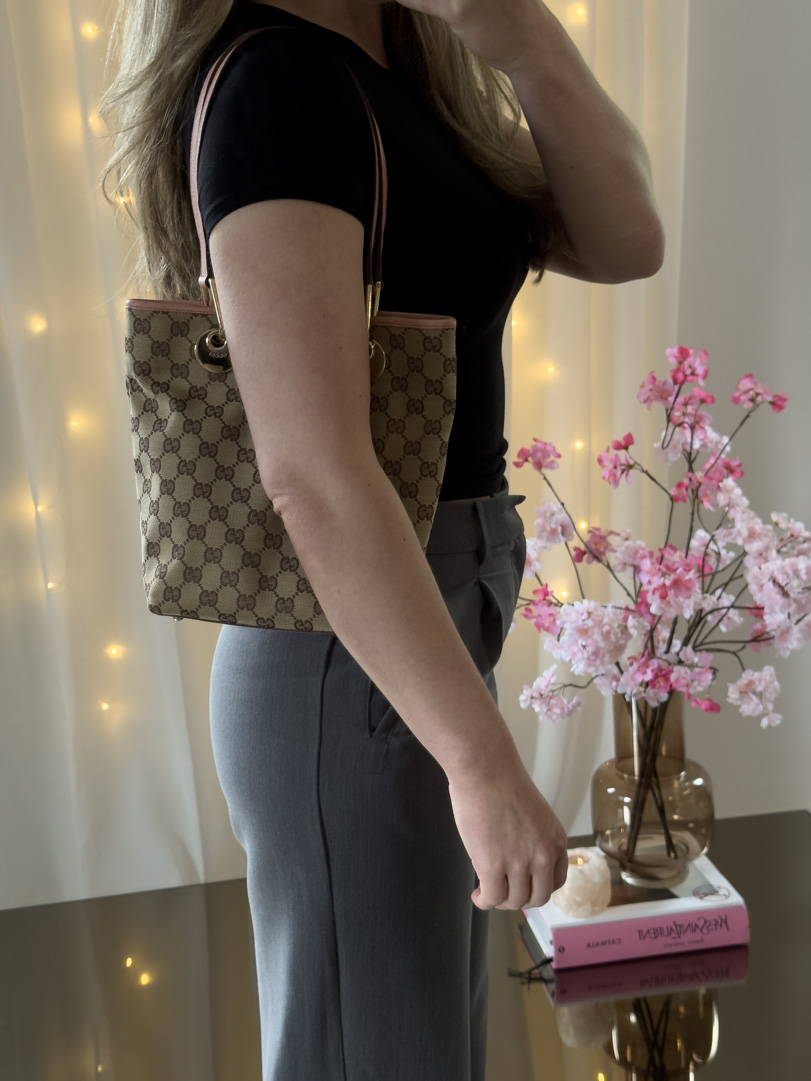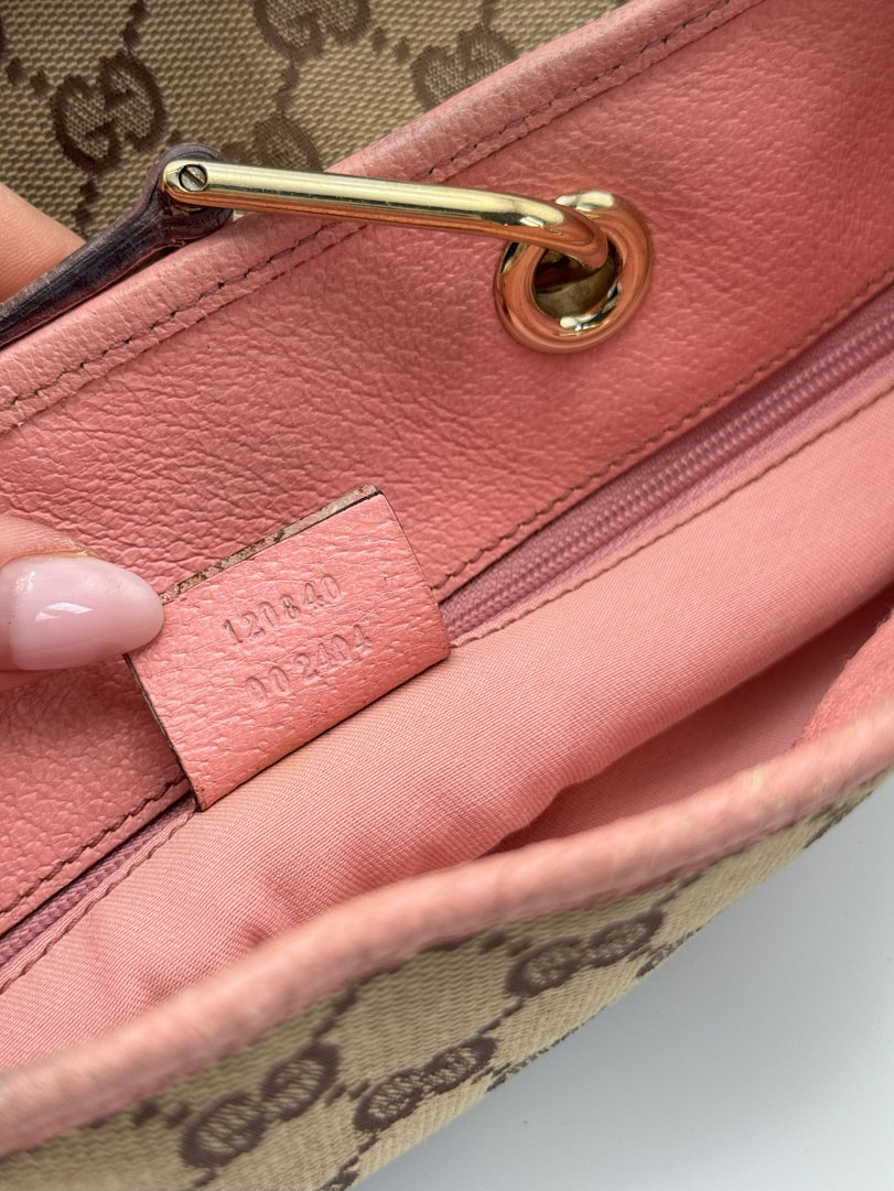 This vintage Gucci Mini Shoulder Bag is crafted from brown GG canvas with pink leather and champagne-tone hardware. It’s in very good condition, with some light wear on the leather and minor imperfections inside. The interior features a small zipped pocket. Comes with a dustbag. Serial number: 120840002404. Dimensions: 17 x 25 x 9 cm.