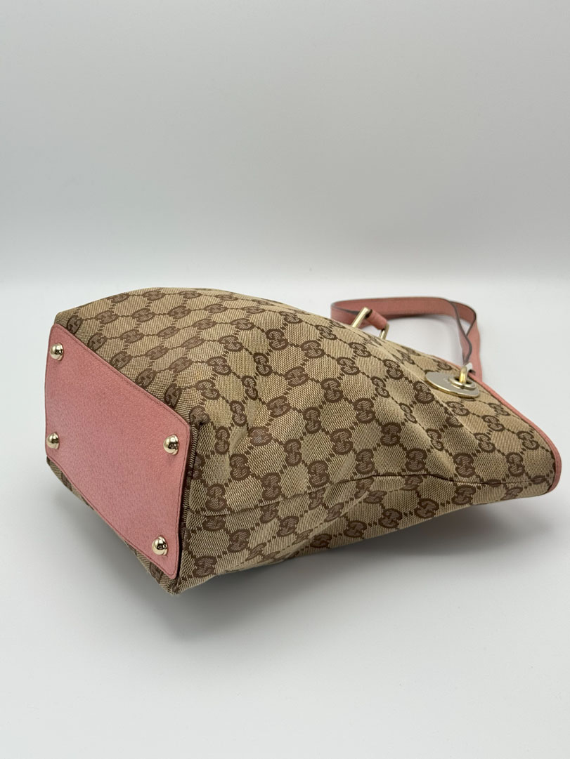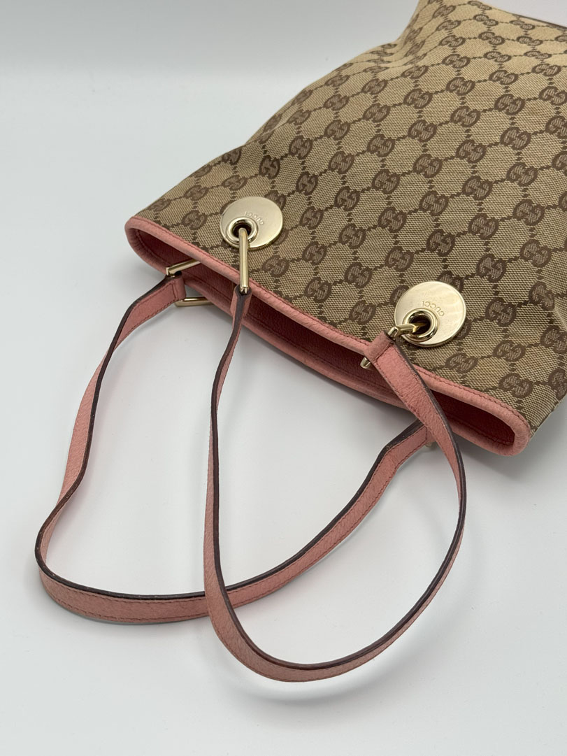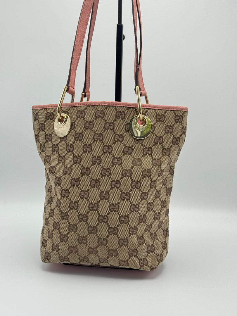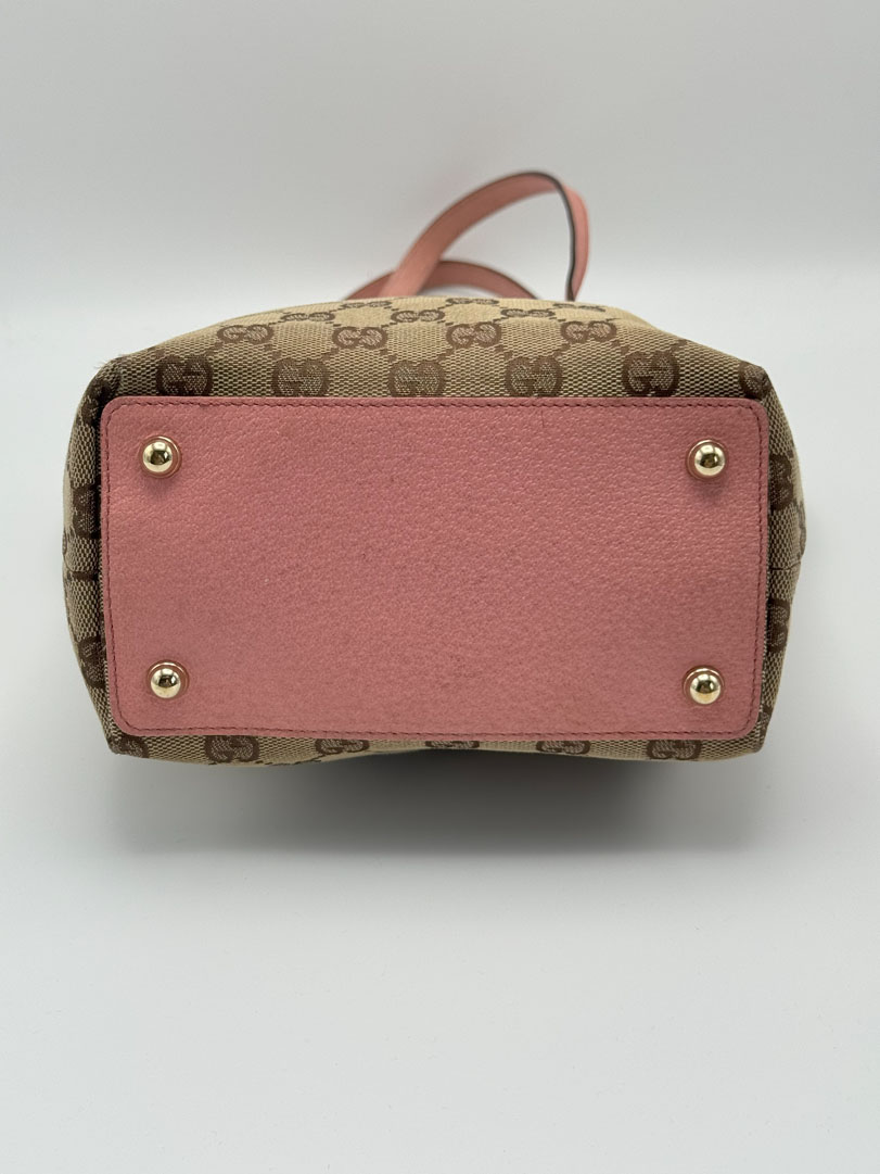 This vintage Gucci Mini Shoulder Bag is crafted from brown GG canvas with pink leather and champagne-tone hardware. It’s in very good condition, with some light wear on the leather and minor imperfections inside. The interior features a small zipped pocket. Comes with a dustbag. Serial number: 120840002404. Dimensions: 17 x 25 x 9 cm.