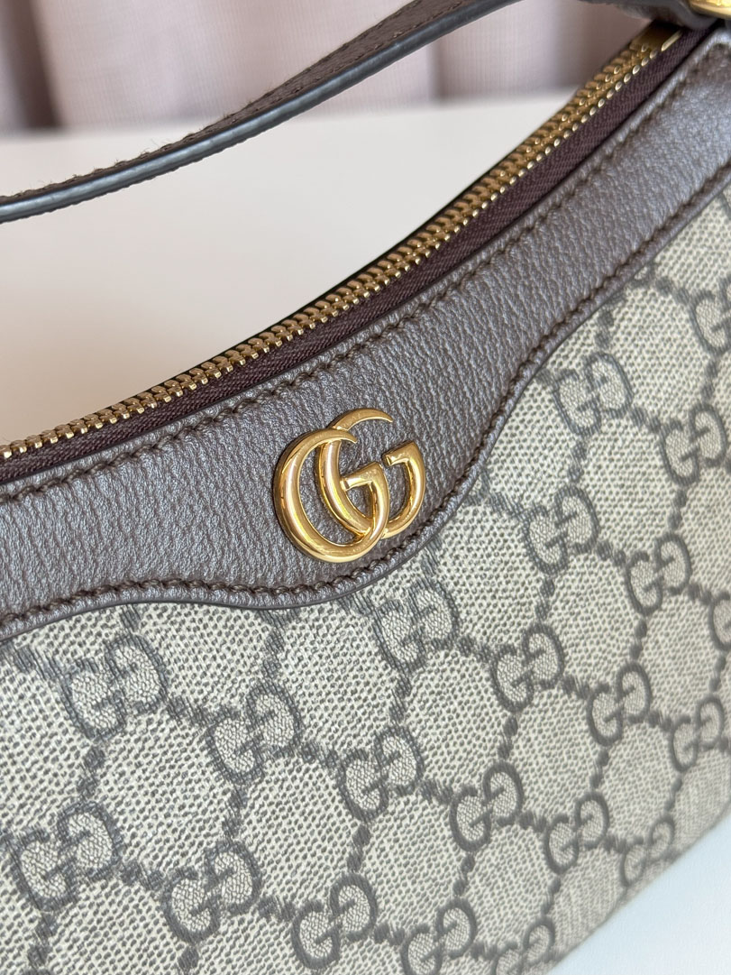 This preloved Gucci Ophidia Bag is a shoulder bag crafted from grey and brown Supreme canvas with gold-tone hardware. It is like new, showing no signs of wear, with a perfectly working zipper and an adjustable strap. The interior is clean with an extra pocket, and the bag comes with a dustbag, box, and receipt. The serial number is 7351452133. Dimensions: 25 x 15 x 7 cm.