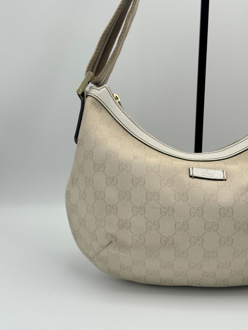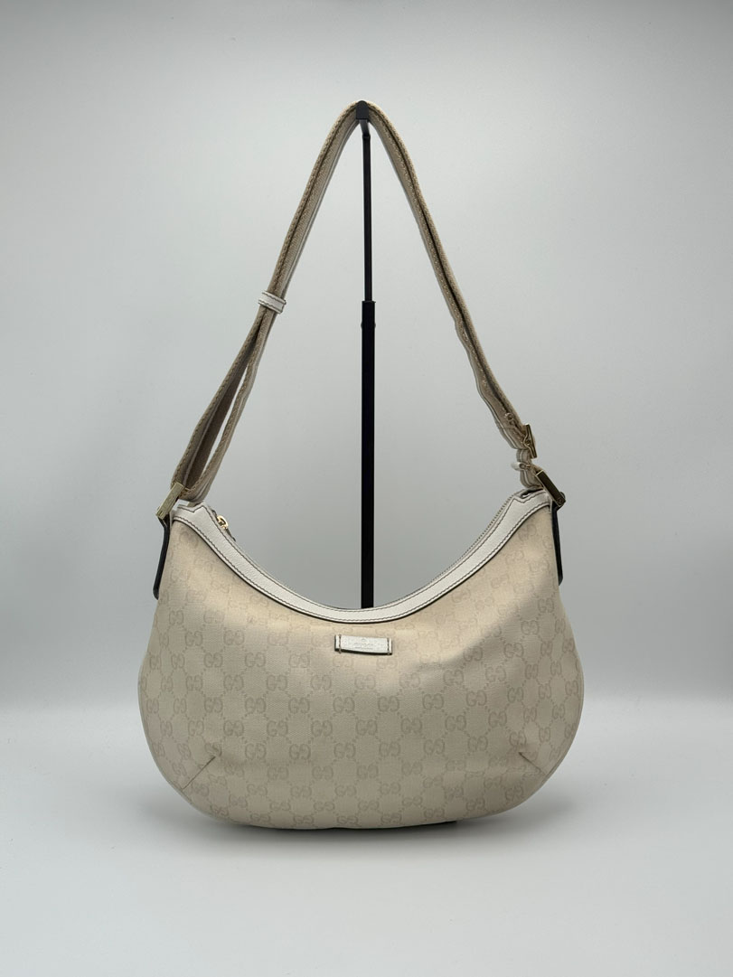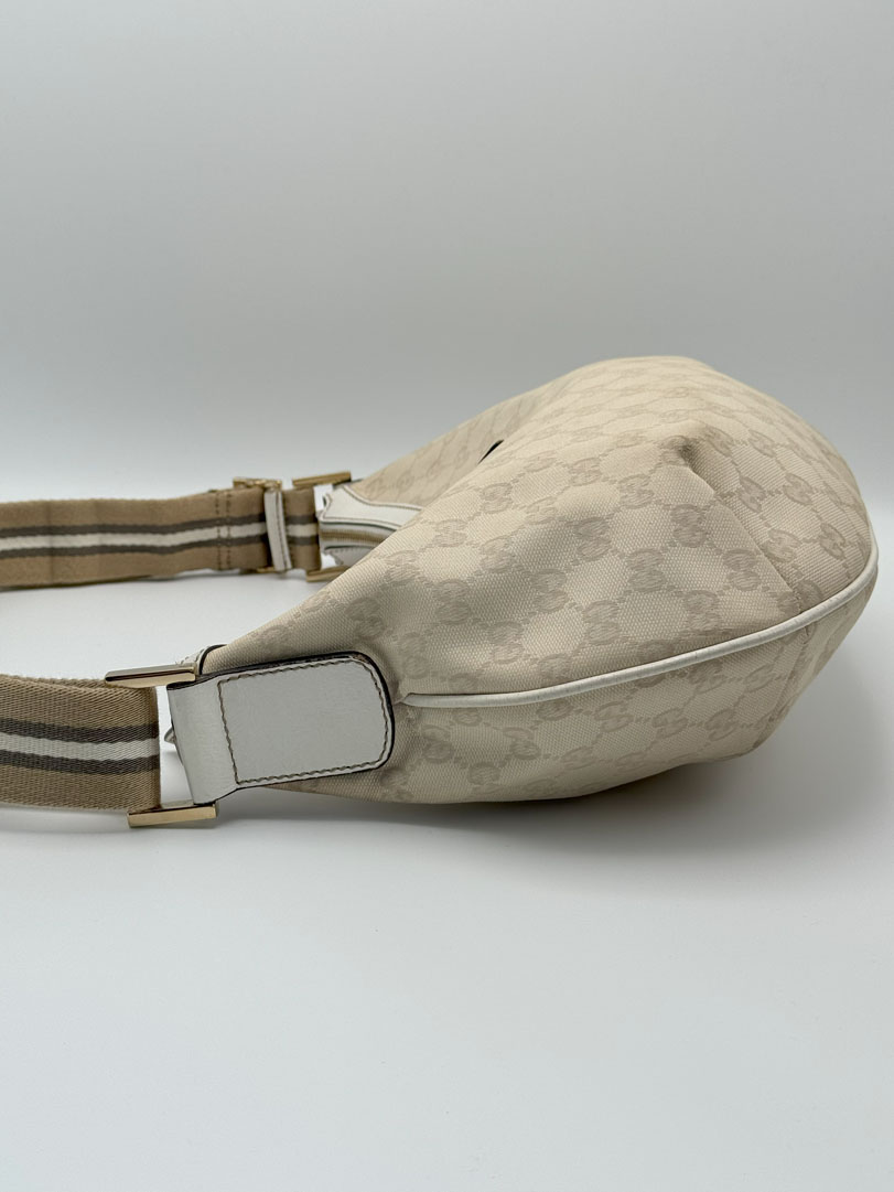 This vintage Gucci Supreme Crossbody is a beautiful bag crafted from white GG Supreme canvas with champagne-tone hardware. It is in excellent condition, with little to no signs of use—only a tiny mark on the front. The zipper works perfectly, and the interior is completely clean, featuring an additional zippered pocket. The adjustable strap allows it to be worn both crossbody and short over the shoulder. The serial number is 1810921669. Dimensions: 33 x 21 x 4 cm.
