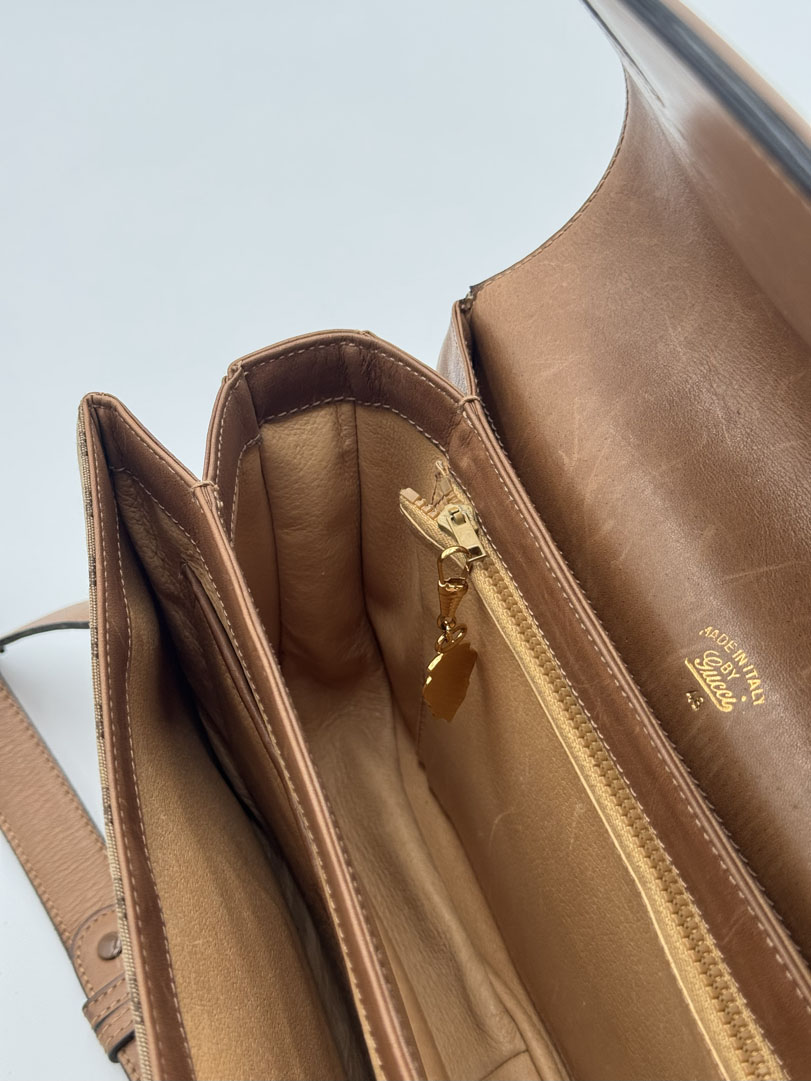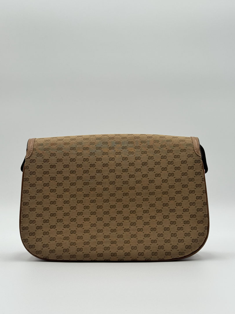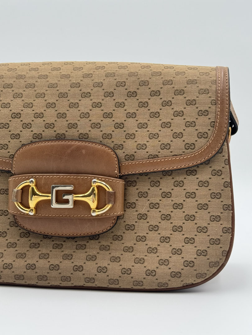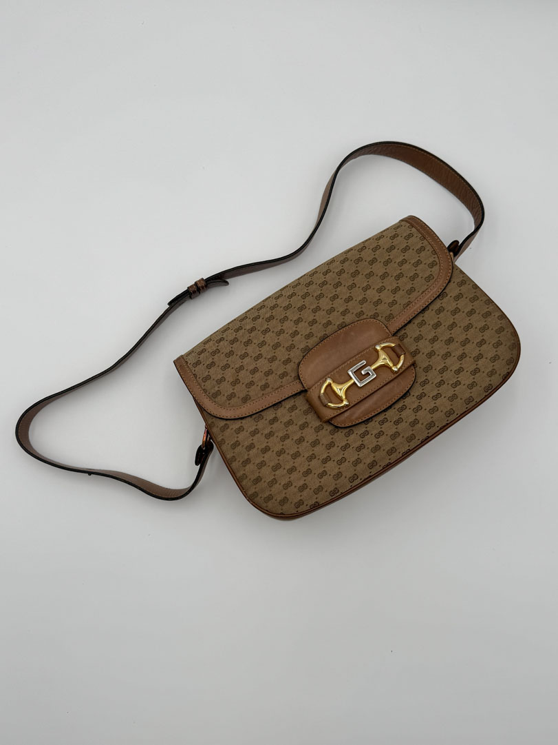 This vintage Gucci Supreme Horsebit Bag is a shoulder and crossbody bag crafted from brown Supreme canvas with gold- and silver-tone hardware. It is in very good condition, with light signs of use such as some discoloration on the hardware and general irregularities like small scratches on the leather. The interior is clean with extra pockets. Dimensions: 27 x 20 x 6 cm.