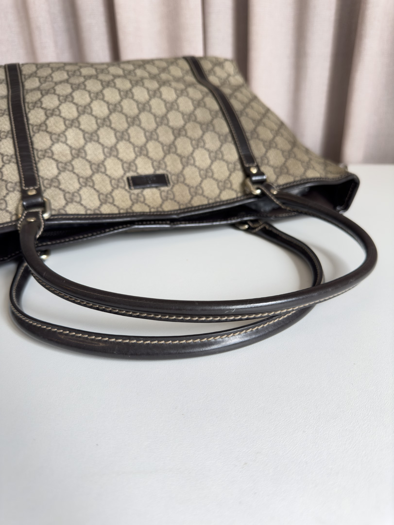 This vintage Gucci Supreme Tote is a spacious shoulder bag made from GG Supreme canvas with silver-tone hardware. It is in very good condition, showing only light wear on the corners. The interior is clean and includes a small pocket for extra storage. A practical and timeless everyday bag. The serial number is 197953493075. Dimensions: 33 x 25 x 15 cm.
