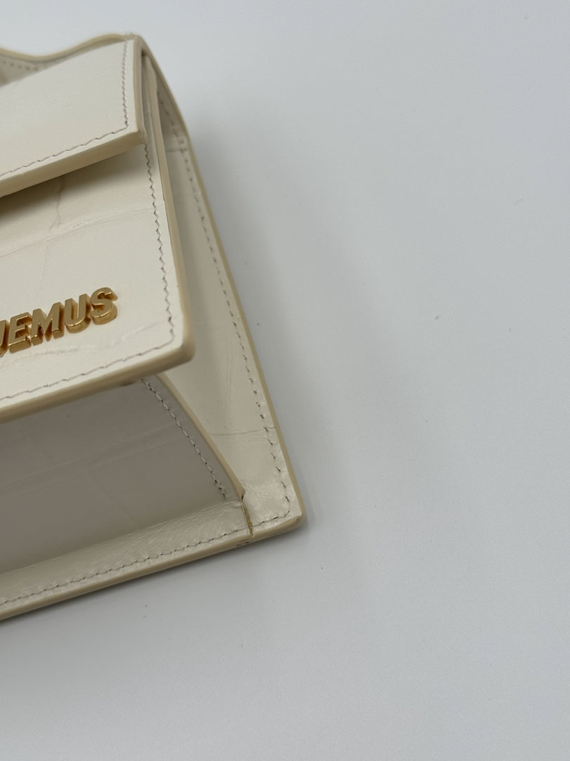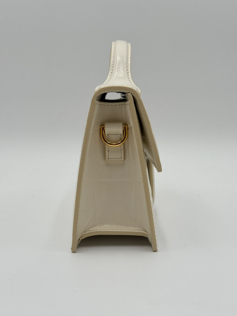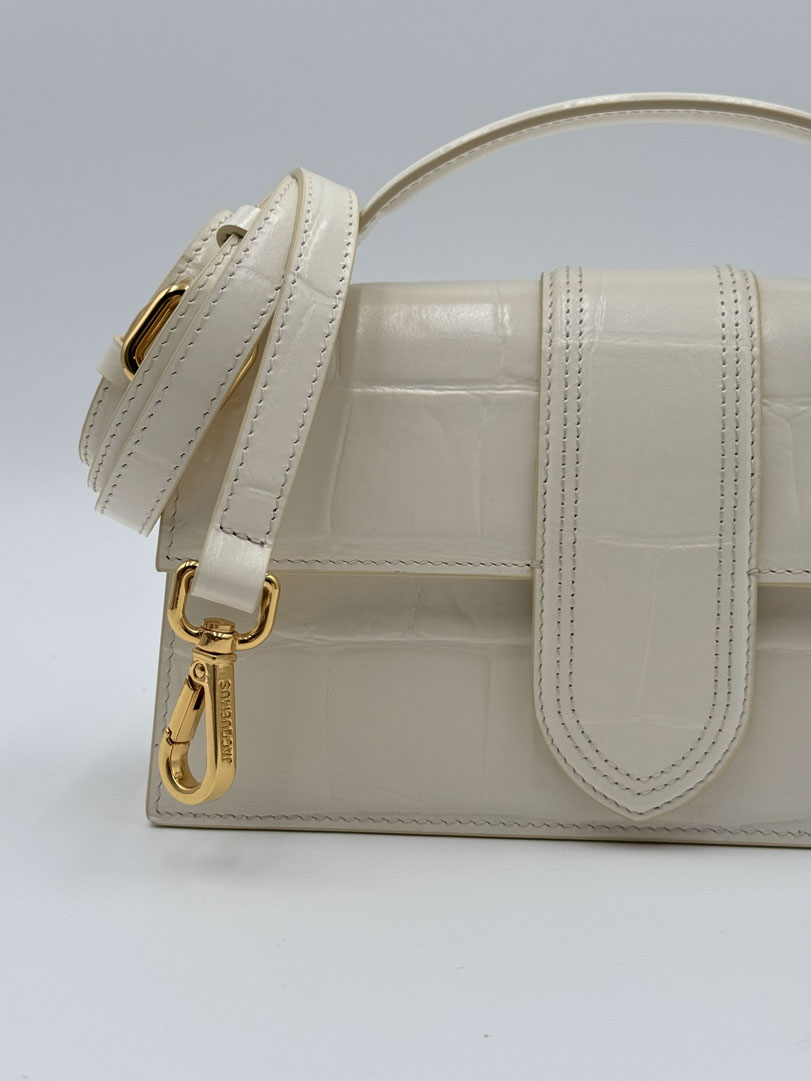This pre-loved Le Grand Bambino White Croc is a crossbody bag made from white leather with gold-tone hardware. The item is in a fantastic condition! New with or without tags. The interior is clean and features an extra pocket. Dimensions are 23.5 x 13 x 7 cm. It comes with a dustbag, tag, and a long strap. The strap is adjustable, and the photo was taken with the strap on the shortest setting.