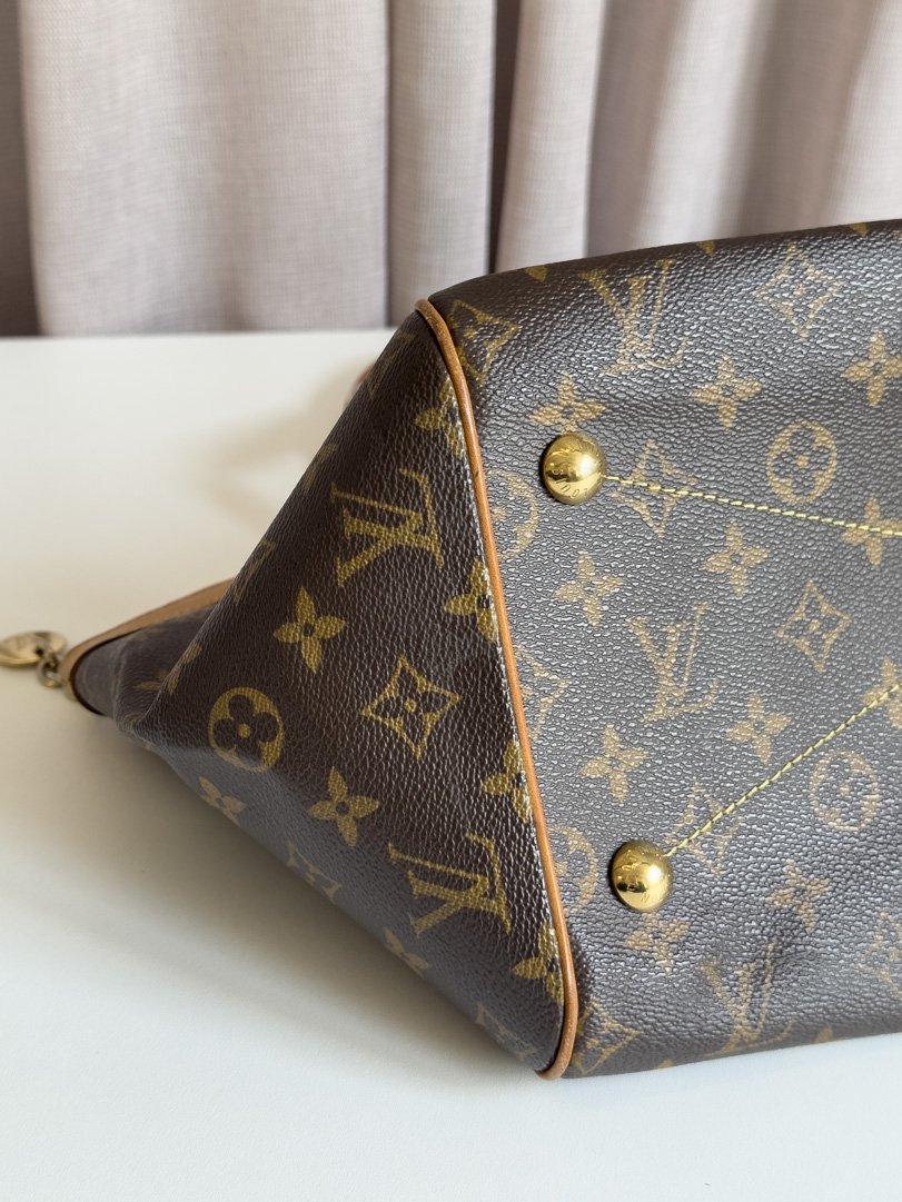 This vintage Louis Vuitton Monogram Tivoli GM is a brown shoulder bag crafted from Monogram canvas with vachetta leather and gold-tone hardware. In very good condition, it has a clean interior with extra pockets, adjustable straps, and a smooth-running zipper. This spacious bag can be carried by hand or worn over the shoulder. The datecode is SP0120. Dimensions: 33 x 25 x 17 cm.
