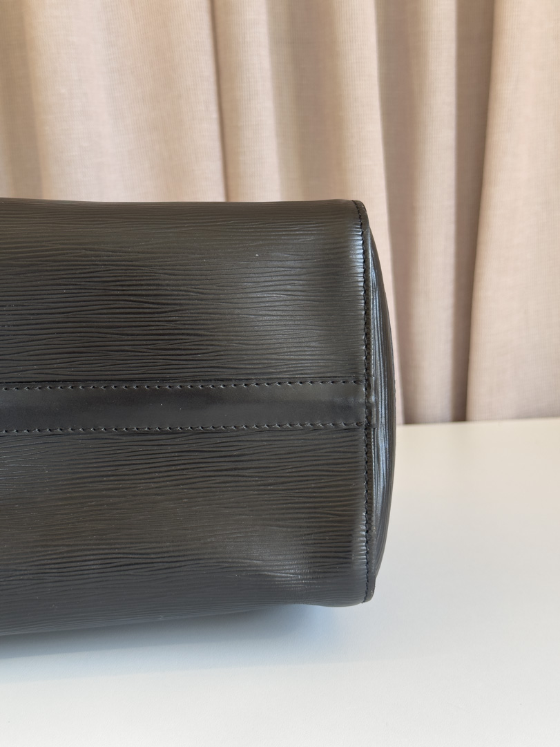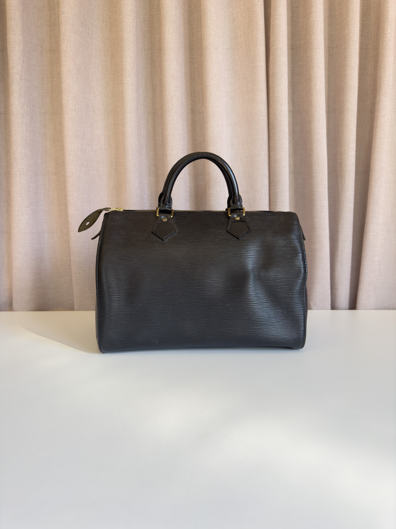 This pre-loved Louis Vuitton Black Epi Speedy is a sophisticated vintage handbag in stunning condition. Crafted from black Epi leather with gold-tone hardware, it is in very good condition with minimal imperfections. The interior is clean, and the zipper works perfectly. A timeless and elegant piece. The datacode is VI0965 (1995). Dimensions: 32 x 21 x 18 cm.