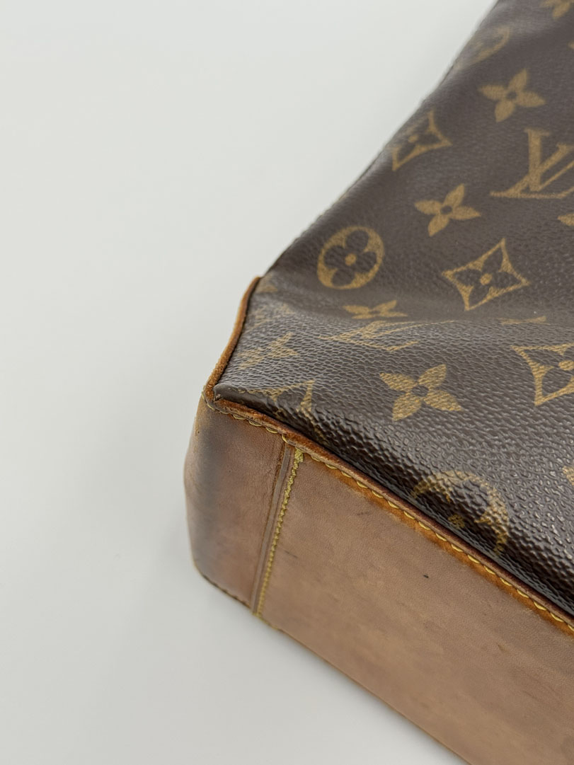 This vintage Louis Vuitton Cabas Piano is a shoulder bag crafted from brown monogram canvas with gold-tone hardware. It is in very good condition, showing some light imperfections and signs of use, such as discoloration on the hardware including the zipper and some stains on the bottom. The interior is clean and features an extra pocket. The datacode is VI0091 from 2001. Dimensions are 35 x 24 x 13 cm.