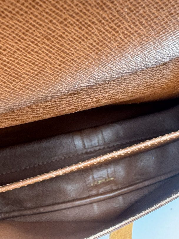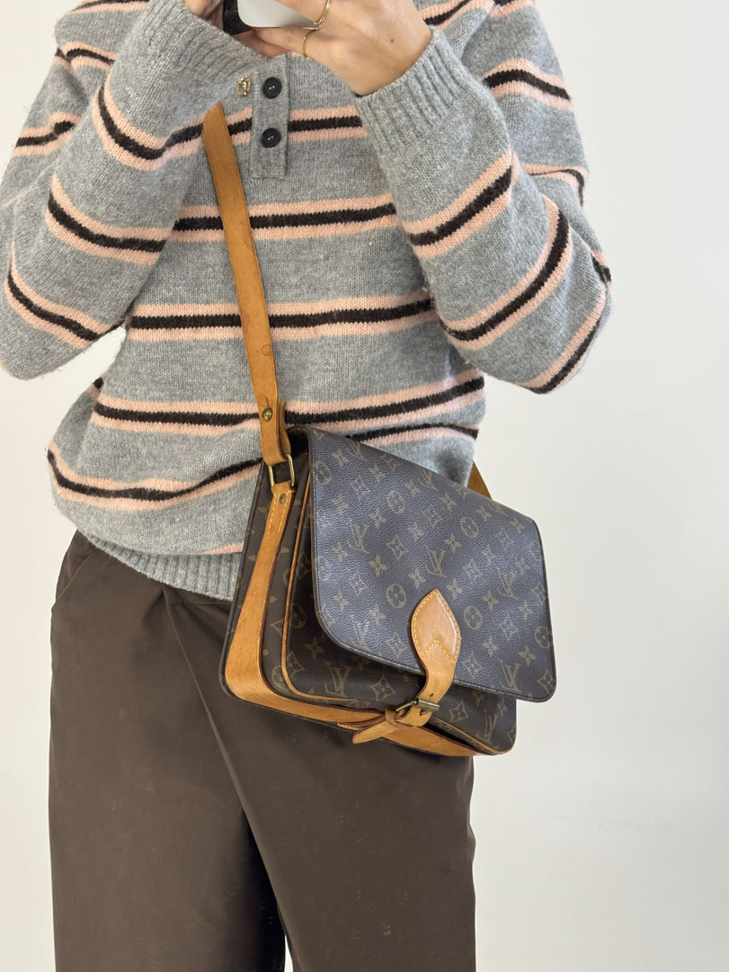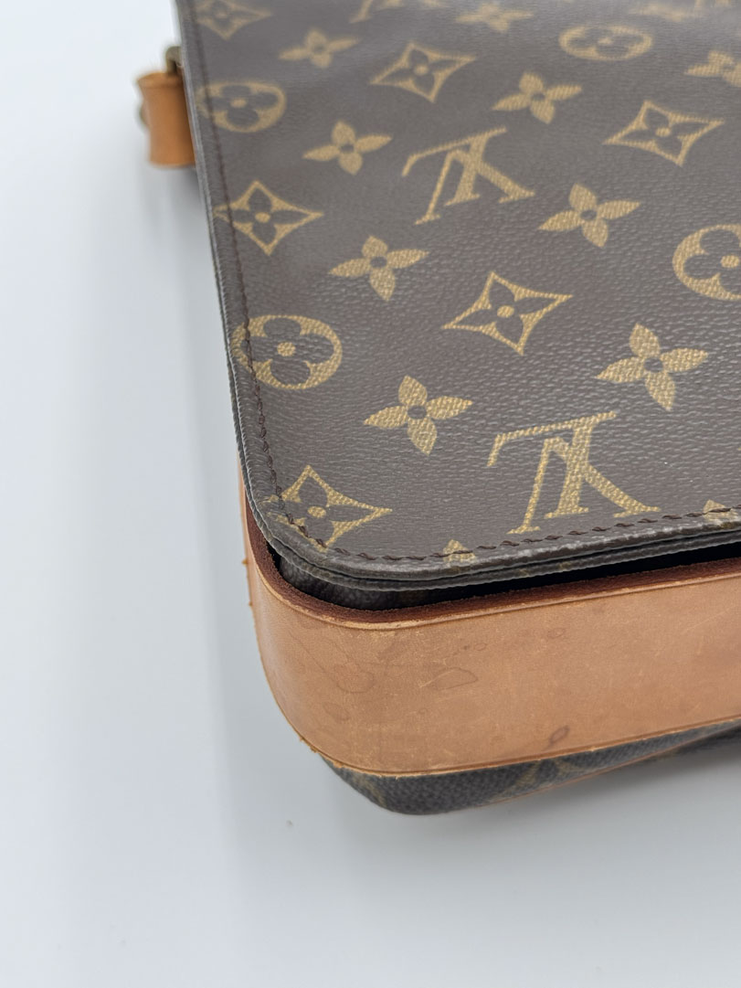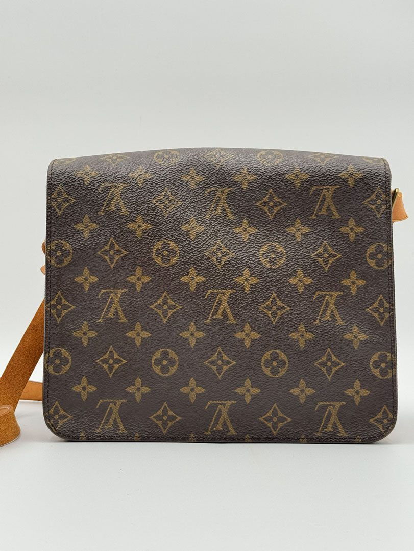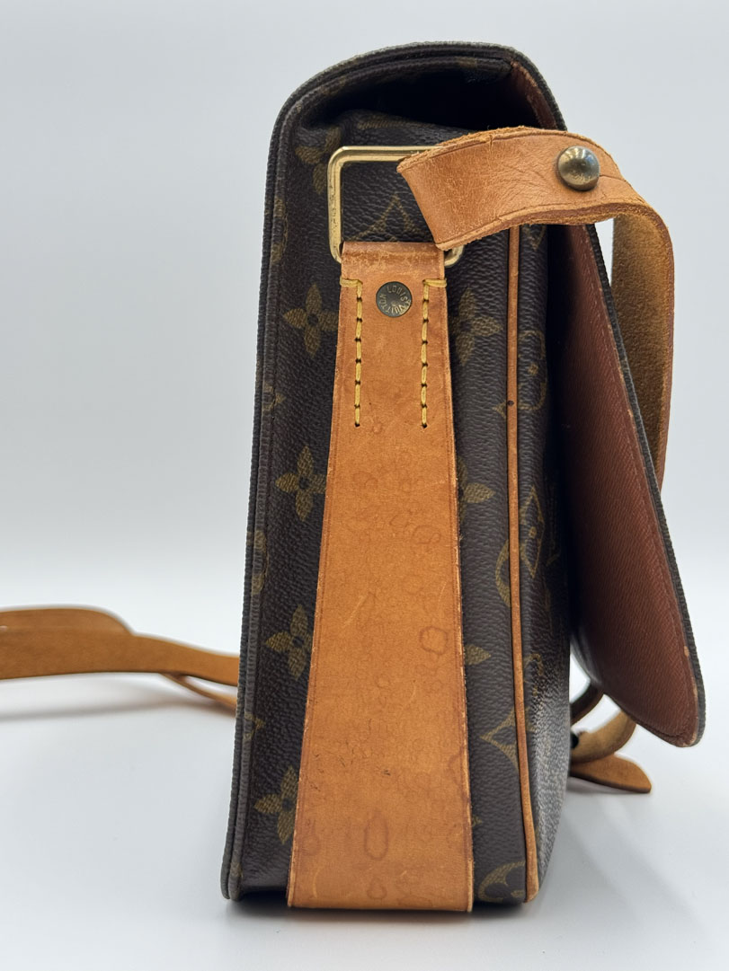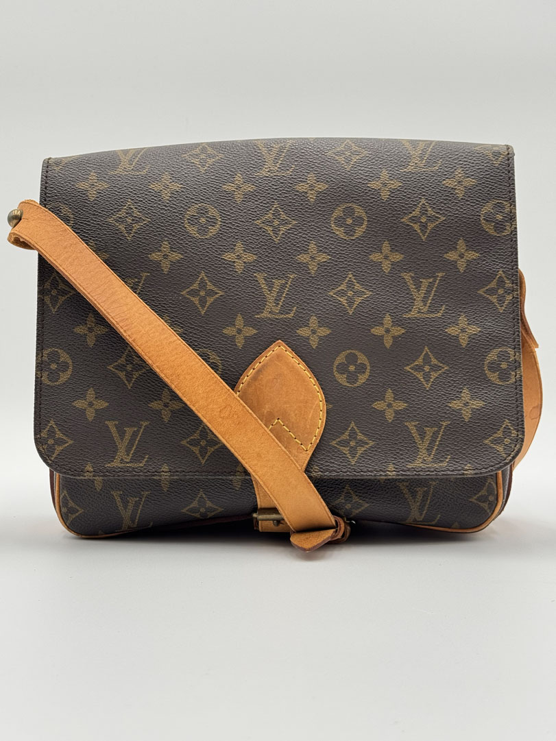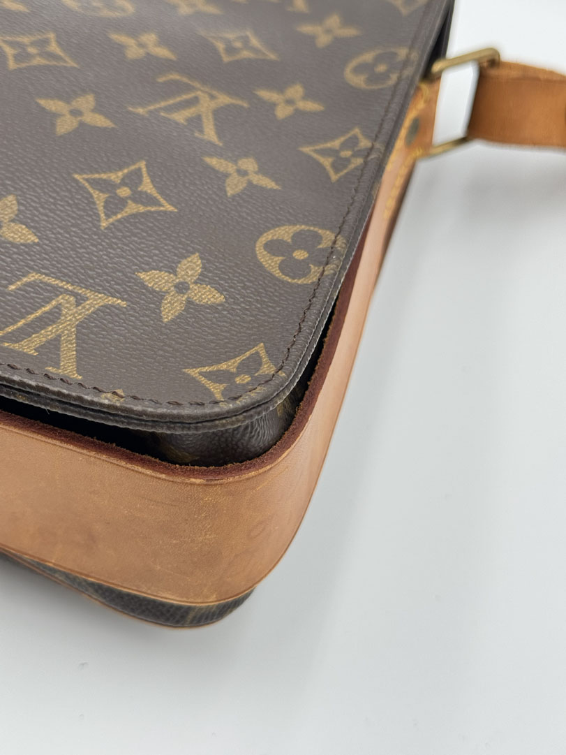 This vintage Louis Vuitton Cartouchiere GM is a crossbody bag made from brown Monogram Canvas with gold-tone hardware. The item is in very good condition, showing some user signs such as discoloration of the hardware. The interior is clean and features an extra pocket. Dimensions are 25 x 21 x 8 cm. The datacode is SL 1900, from the year 1990.
