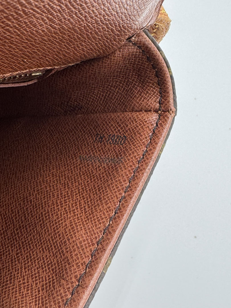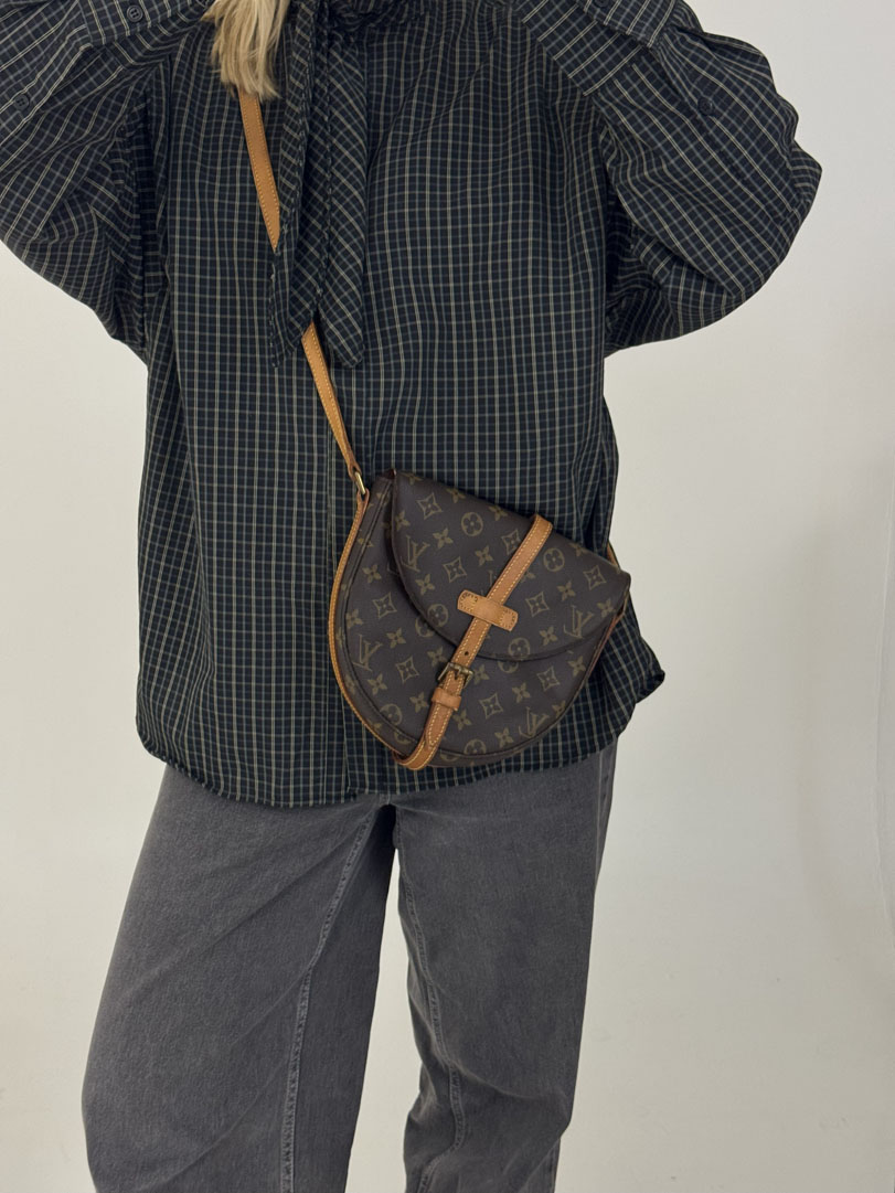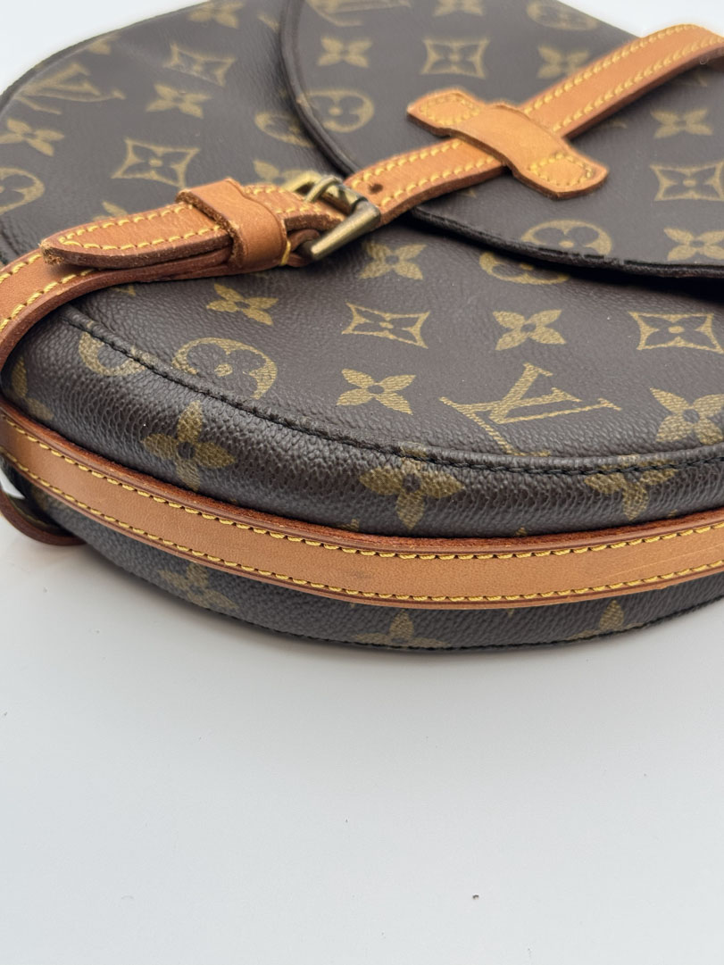 This vintage Louis Vuitton Chantilly MM is a crossbody bag crafted from brown Monogram canvas with gold-tone hardware. It is in very good condition, showing minimal signs of use. The hardware is slightly discolored, and the interior zippered pocket has peeling and is not usable. The bag includes an adjustable strap. The interior is clean with an extra zippered pocket. Dimensions: 22 x 23 x 6 cm. The datacode is TH1900, from 1990.