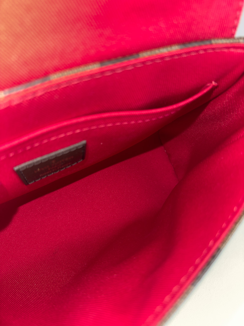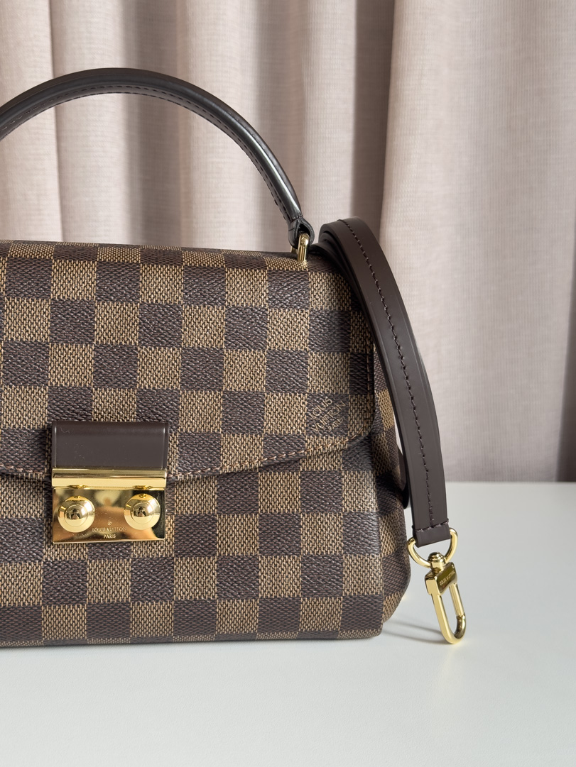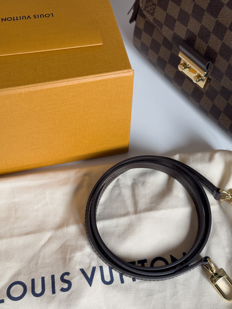 This pre-loved Louis Vuitton Croisette is a stunning handbag in excellent condition, made from brown Damier Ebene canvas with gold-tone hardware. The interior is perfectly clean, and the bag can be carried both crossbody and by hand. Comes with original receipt, dustbag, and box. Dimensions: 24 x 17 x 9 cm.