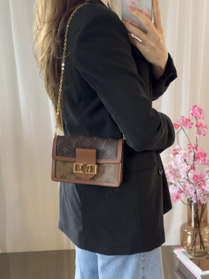 This Louis Vuitton Dauphine Chain Wallet in monogram canvas is in very good condition. The gold-tone hardware shows light scratches, while the rest of the bag is in great shape with a clean interior. Can be worn as a clutch, over the shoulder or crossbody thanks to the versatile chain strap. Interior includes a main compartment, a zipped pocket, and five card slots. Comes with dustbag, box and original receipt. Dimensions: 18.5 x 12 x 5 cm.