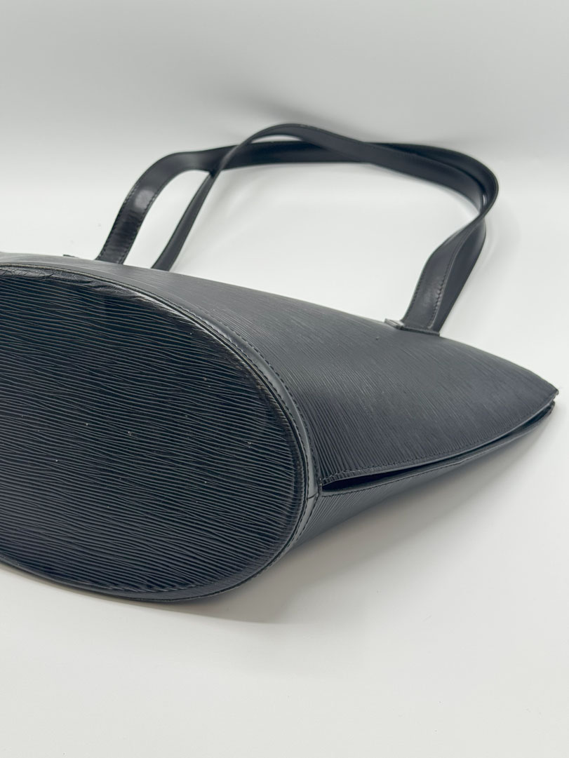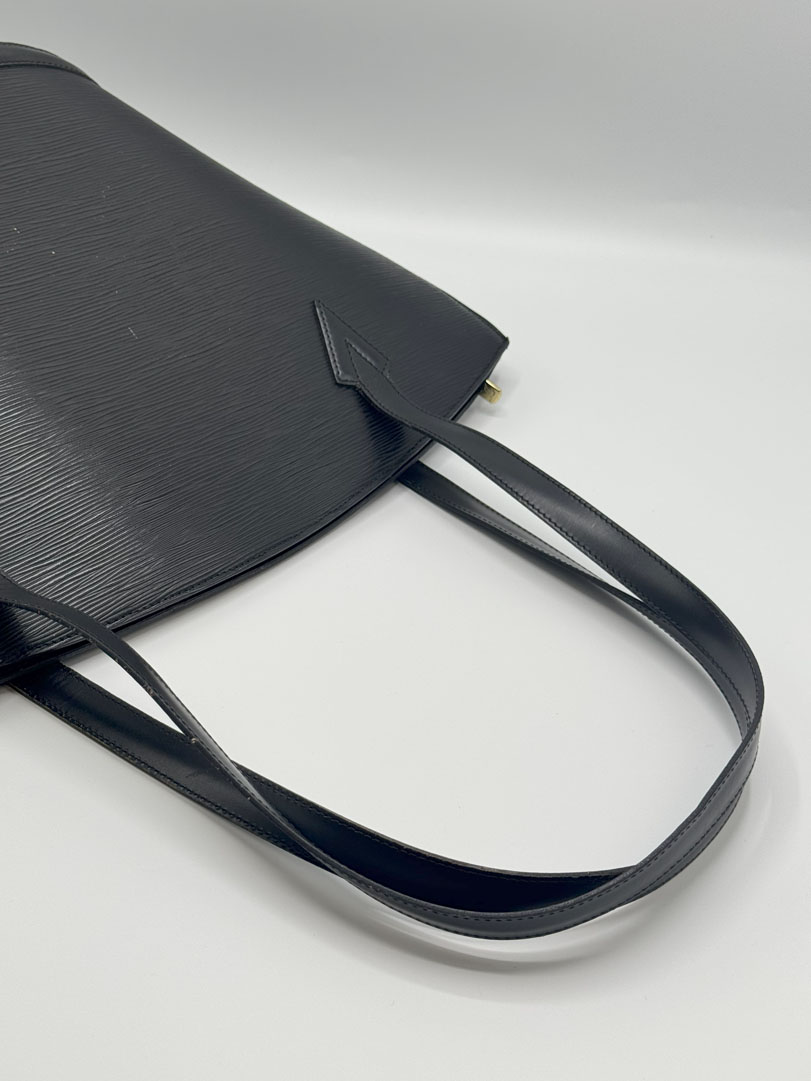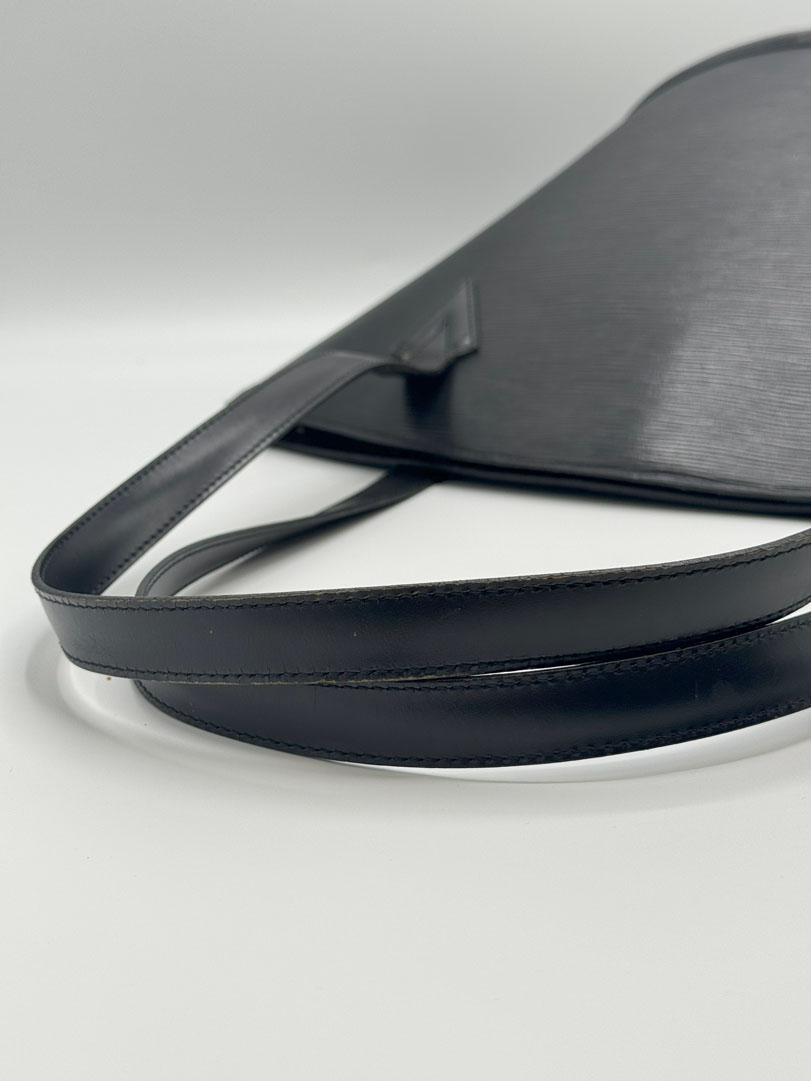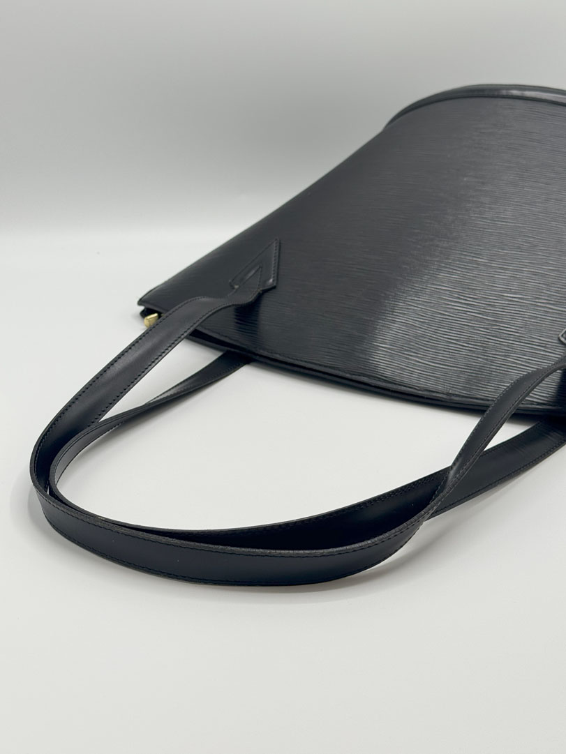 This vintage Louis Vuitton Epi Saint Jacques is a shoulder bag crafted from black Epi leather with gold-tone hardware. It is in very good condition, with a clean interior featuring an additional zippered pocket. The bag shows wear and scratches on the leather, while the hardware retains its shine and the zipper works well. The strap drop measures approximately 26 cm. Dimensions: 26 x 30 x 17 cm.