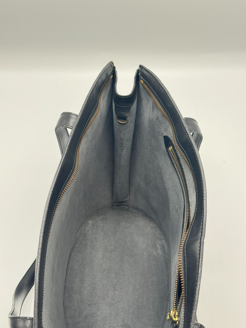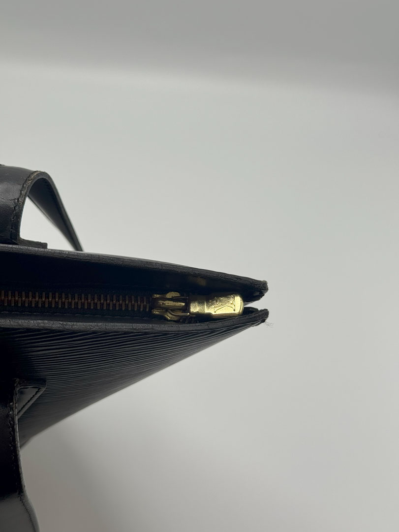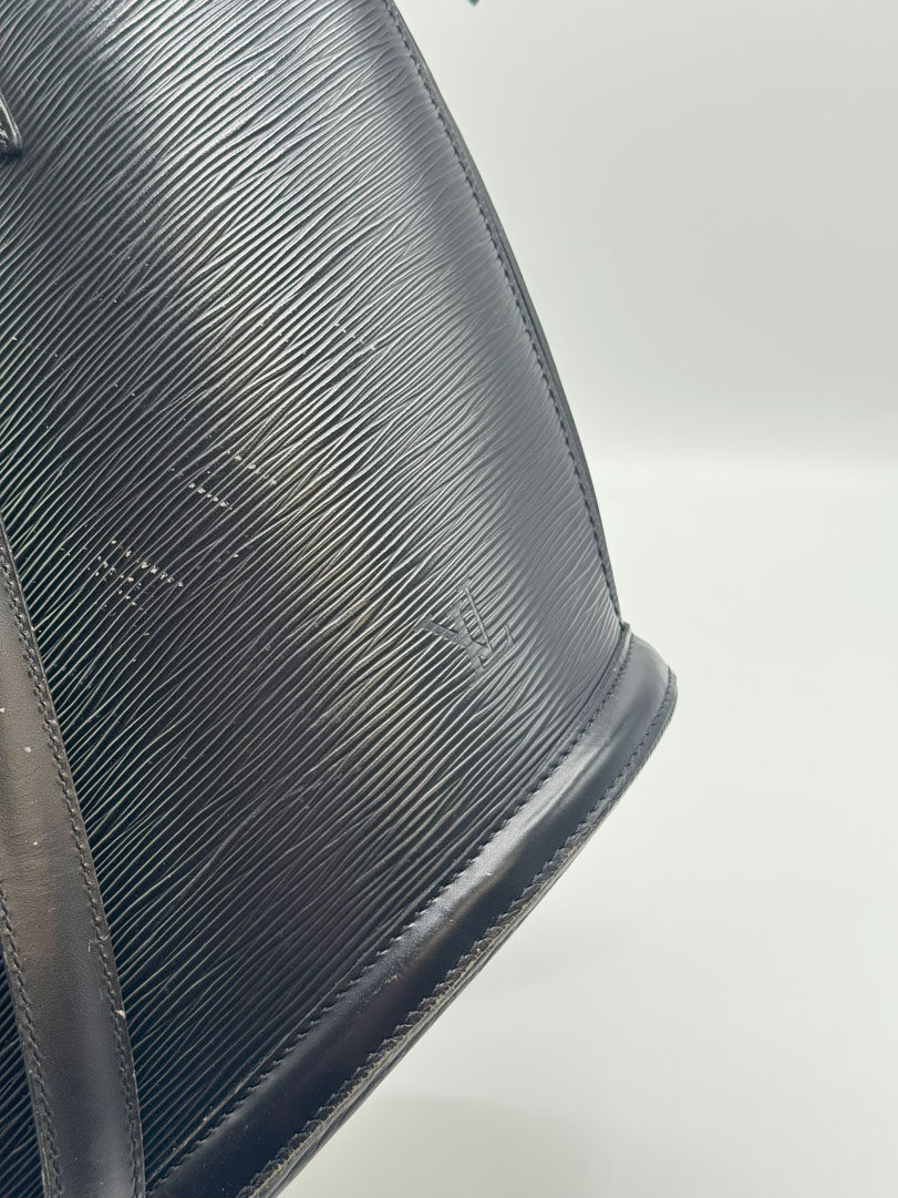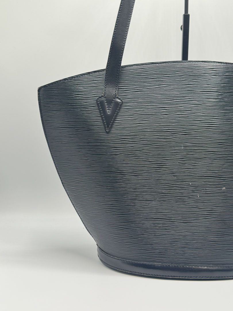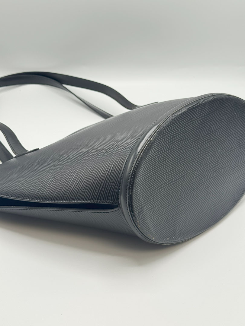This vintage Louis Vuitton Epi Saint Jacques is a shoulder bag crafted from black Epi leather with gold-tone hardware. It is in very good condition, with a clean interior featuring an additional zippered pocket. The bag shows wear and scratches on the leather, while the hardware retains its shine and the zipper works well. The strap drop measures approximately 26 cm. Dimensions: 26 x 30 x 17 cm.