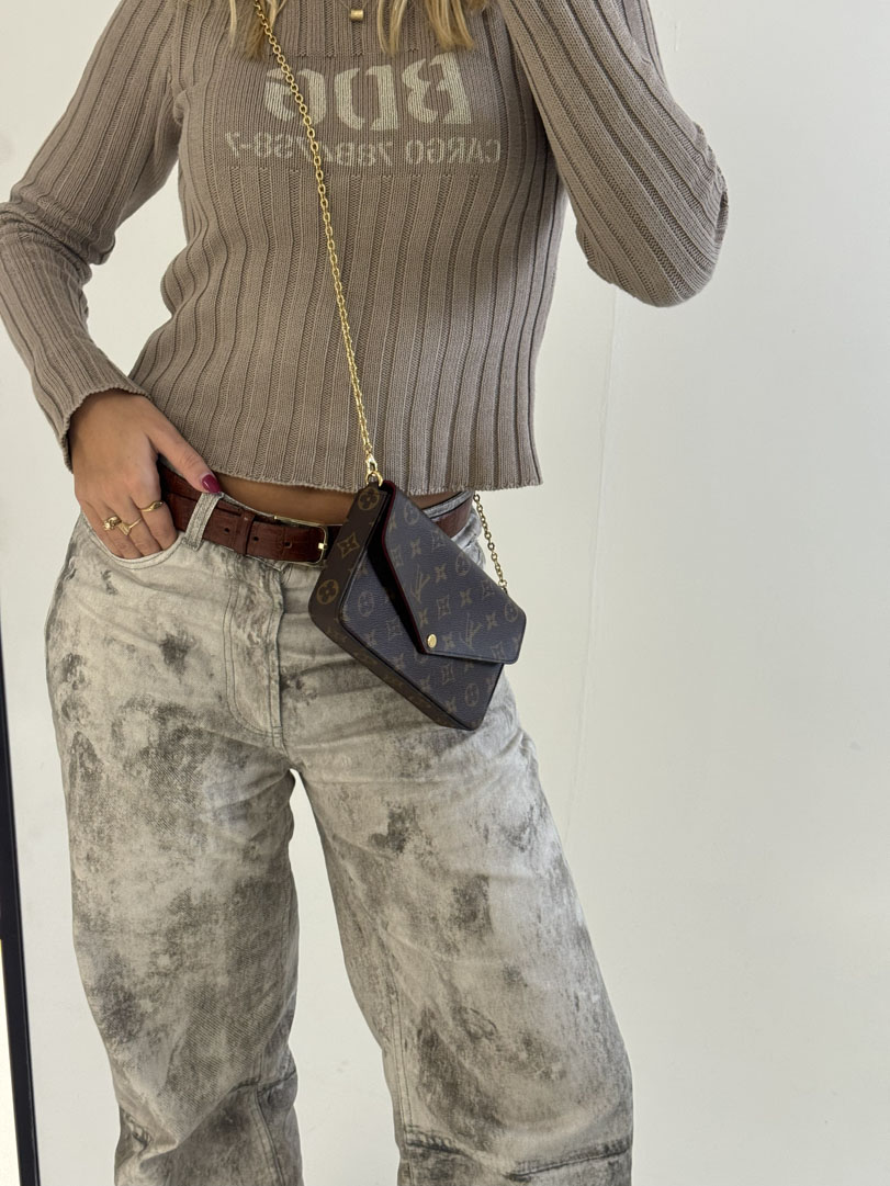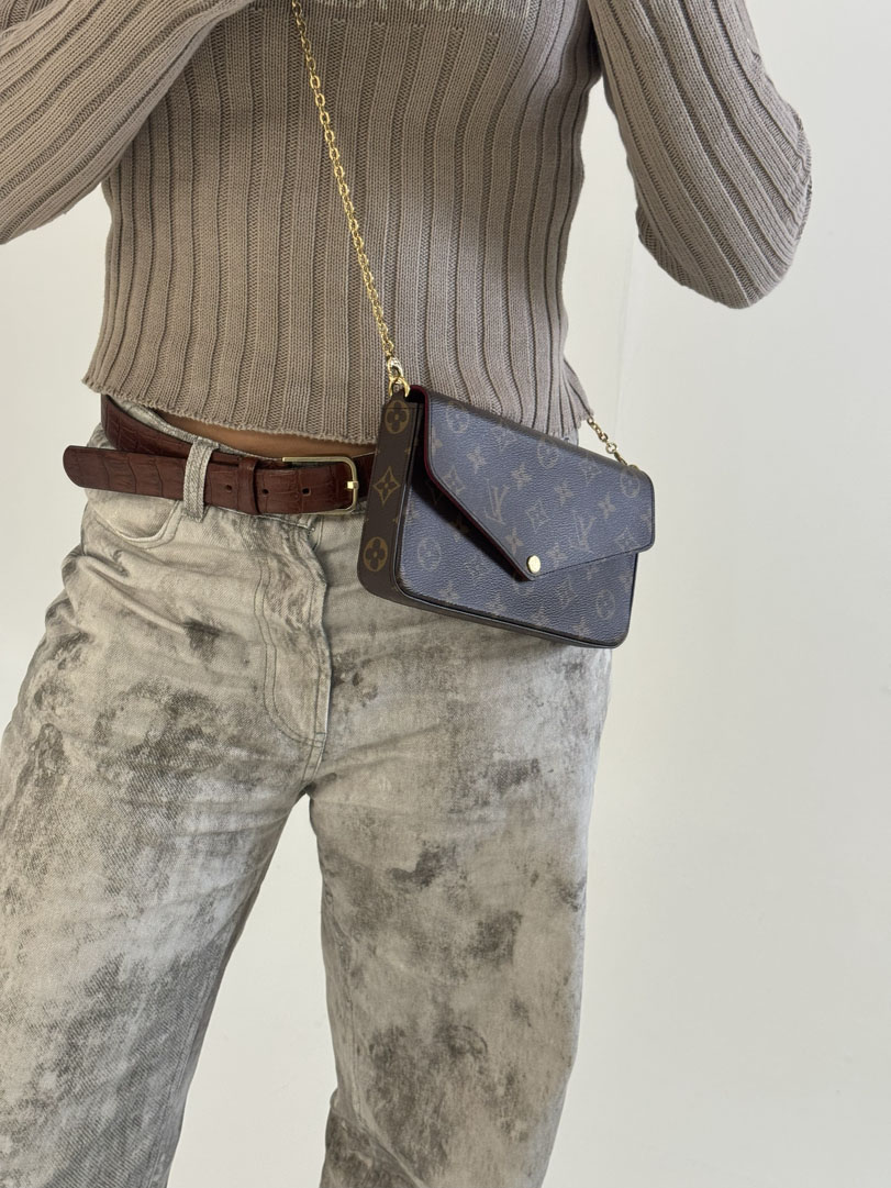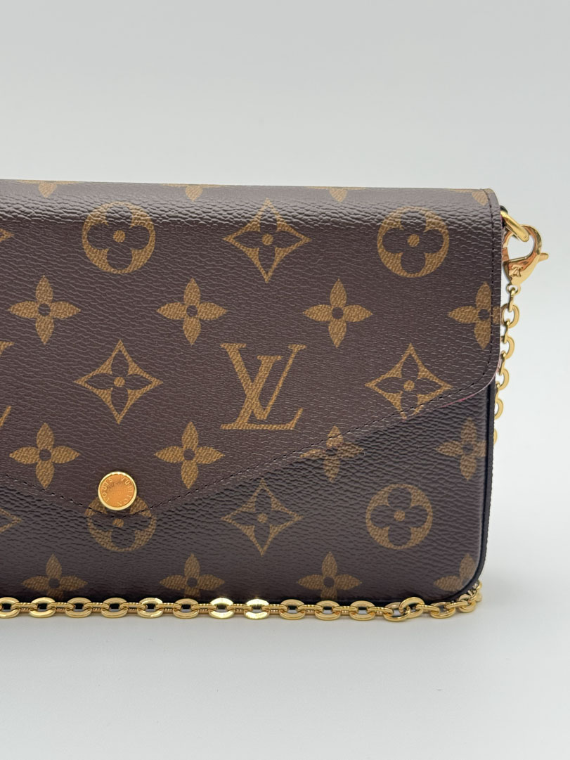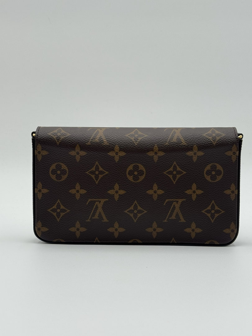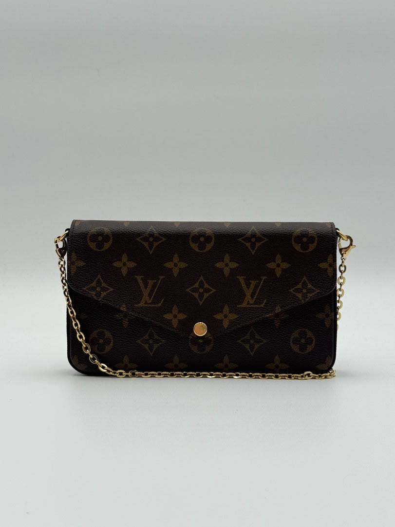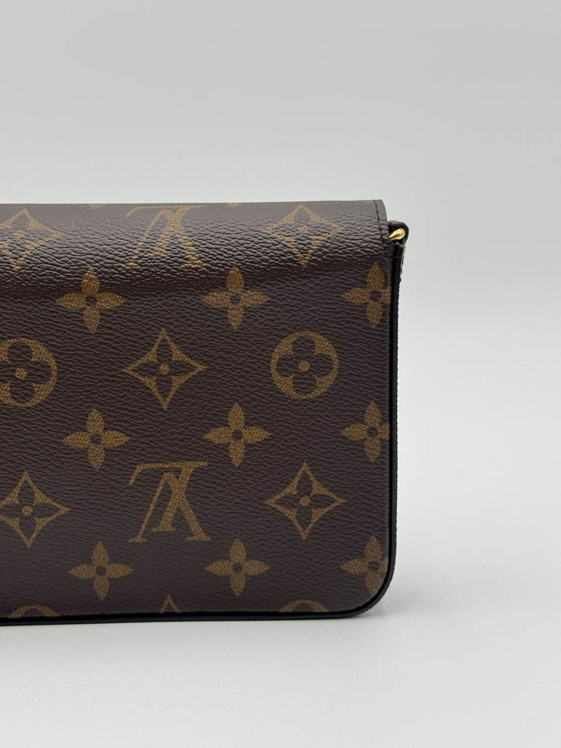 This pre-loved Louis Vuitton Félicie is a crossbody bag crafted from brown Monogram Canvas with gold-tone hardware. It is in excellent condition, lightly used with almost no noticeable flaws. The interior is clean, and the detachable strap allows for multiple carrying options. It is compact and fits a phone. Dimensions: 21 x 12 x 3 cm. It comes with the box, dustbag, and receipt. The bag is from 2023.