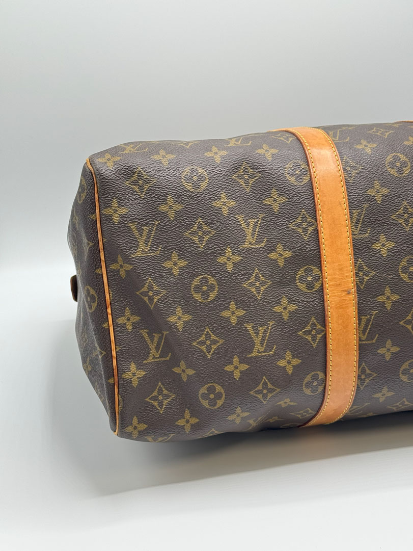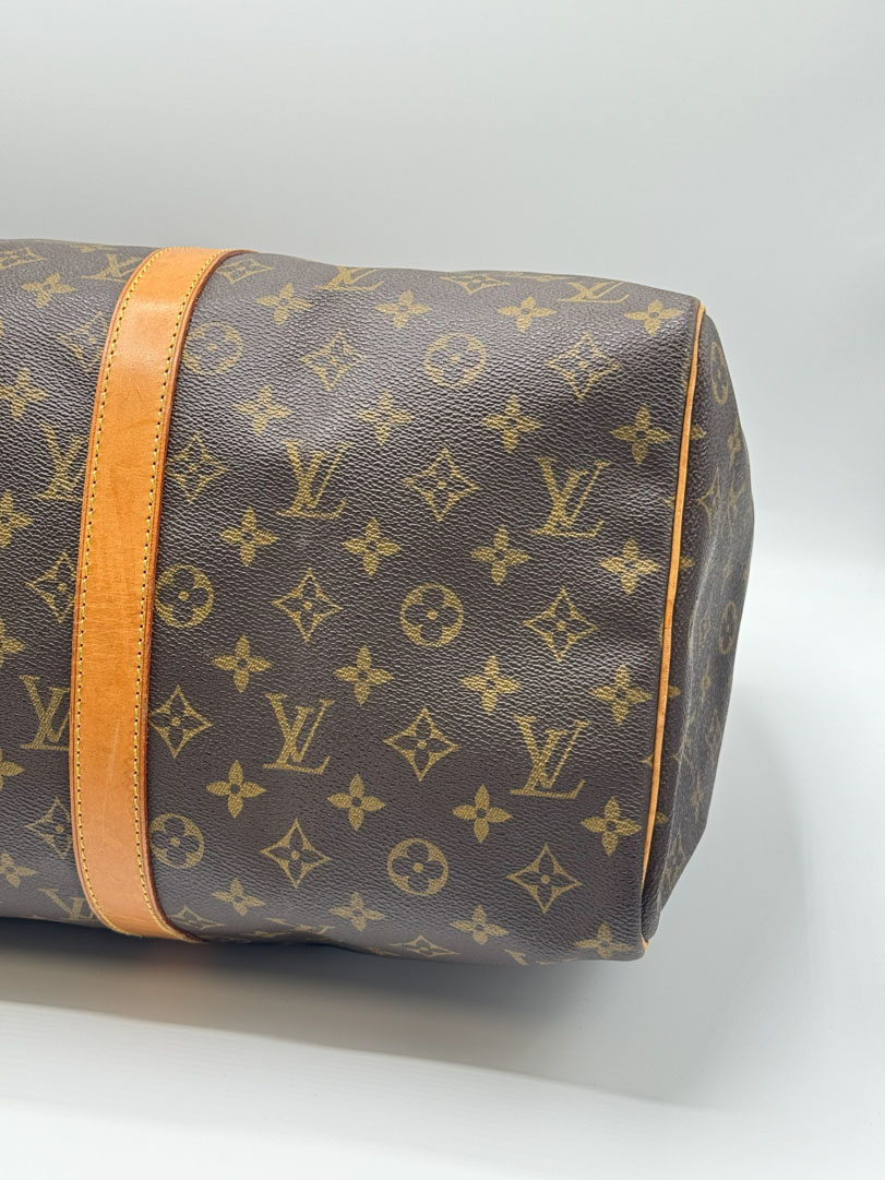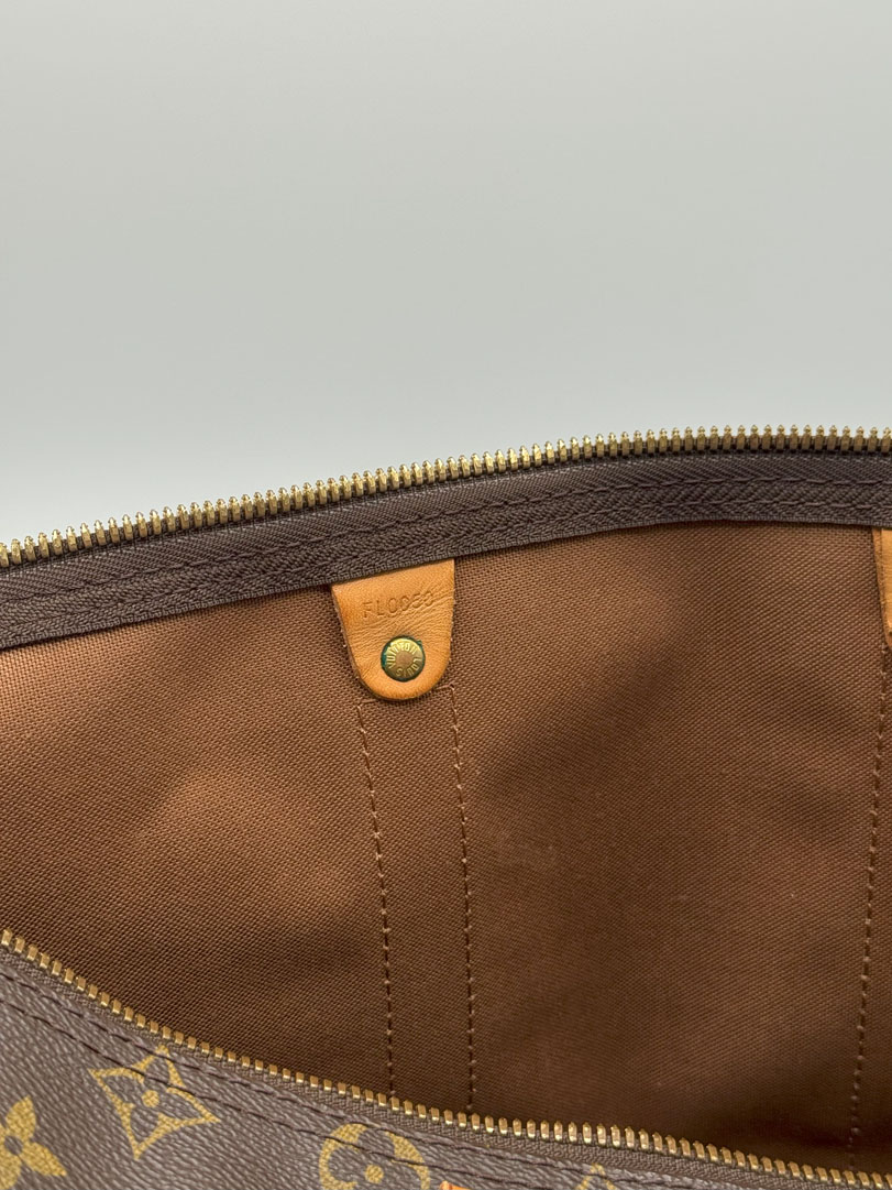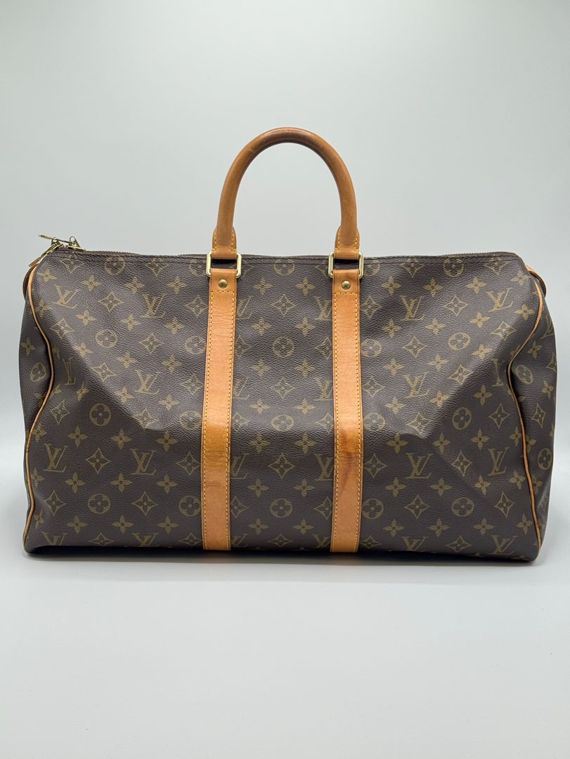 This vintage Louis Vuitton Keepall 45 is a travel bag crafted from brown Monogram canvas with gold-tone hardware. It is in very good condition, with some small imperfections. The hardware still shines, the zipper works well with a double closure, and the bag is suitable as carry-on luggage on a plane. The datacode is FL0050. Dimensions: 45 x 27 x 20 cm.
