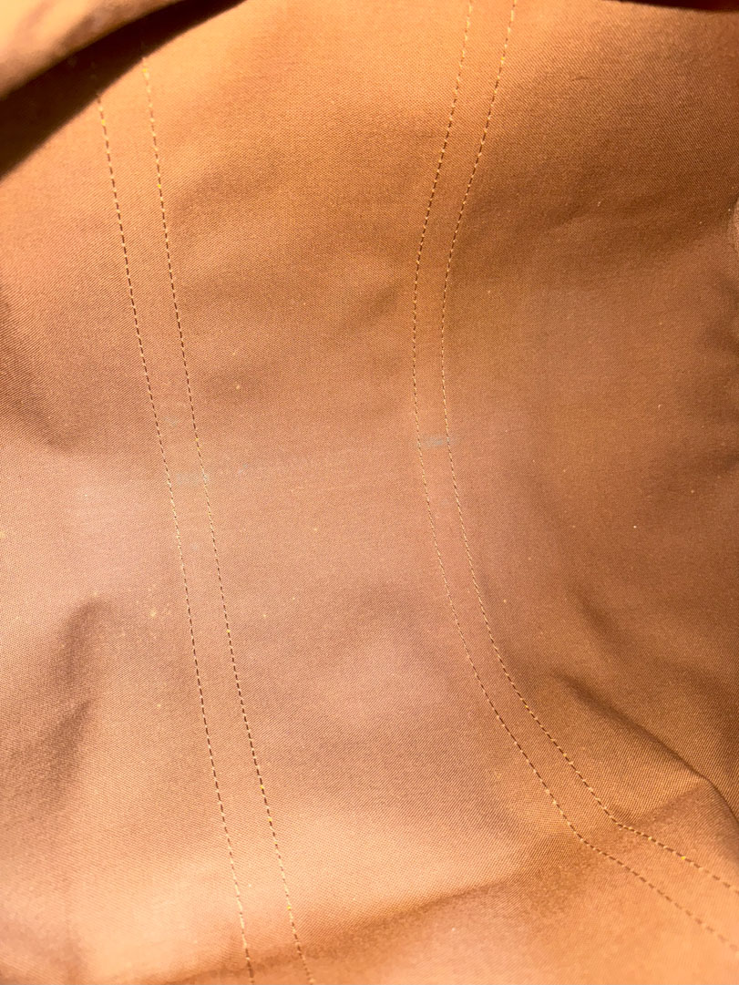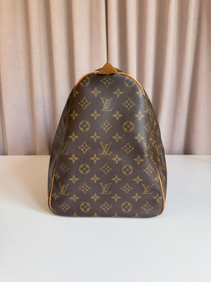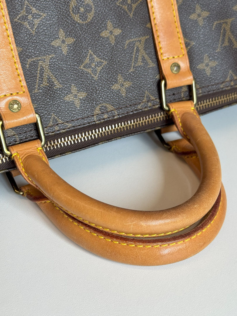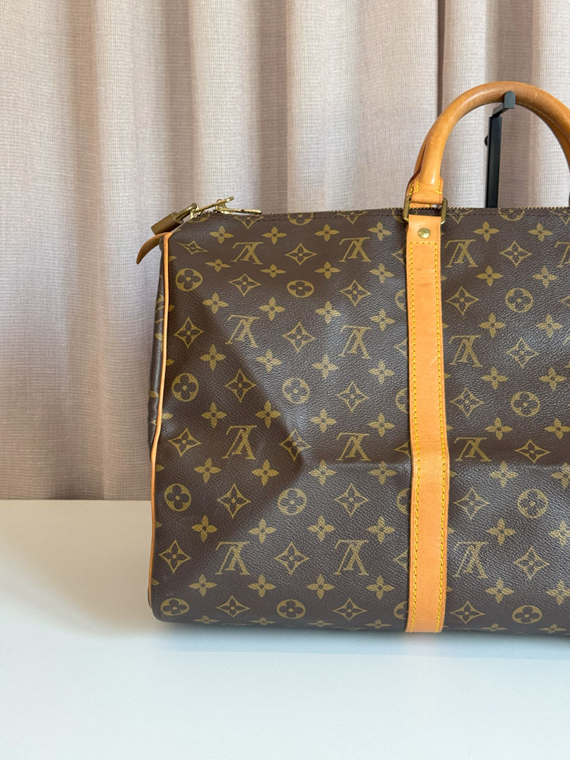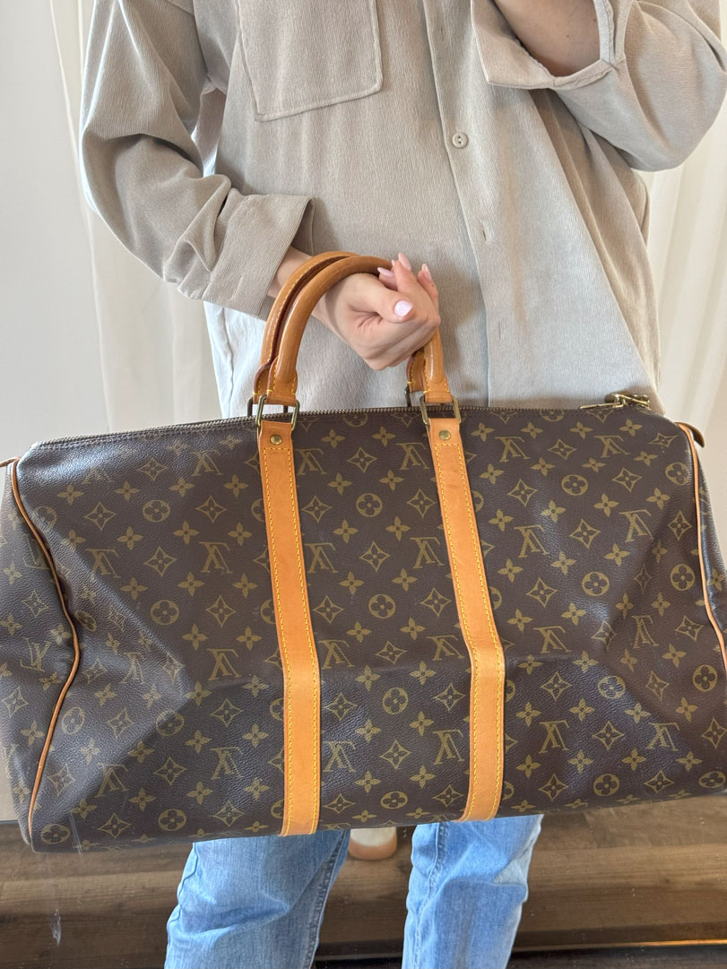 This vintage Louis Vuitton Keepall 50 is a travel bag crafted from brown Monogram canvas with vachetta leather details and gold-tone hardware. In very good condition, it has a clean interior, a smoothly working zipper, and shiny hardware. Suitable as carry-on luggage and practical for travel. Dimensions: 50 x 29 x 23 cm. The datacode is A2 873.