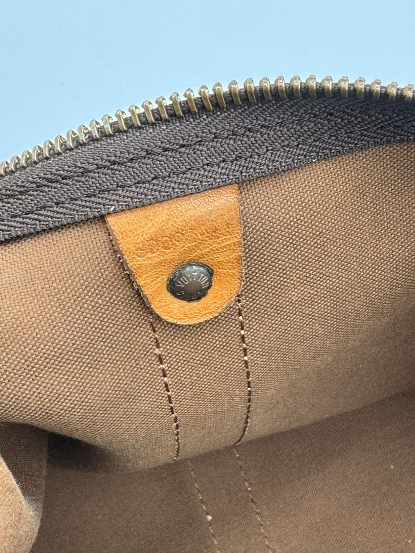 This vintage Louis Vuitton Keepall 50 Bandouliere is a travel bag made from brown Monogram Canvas with gold-tone hardware. The item is in very good condition, showing some user signs such as wear on the corners and scratches on the hardware. The interior shows some small stains. Dimensions are 50 x 29 x 22 cm. The datacode is SD0924, from the year 1994. This is a spacious travel bag in carry-on size and can be taken as hand luggage on an airplane.