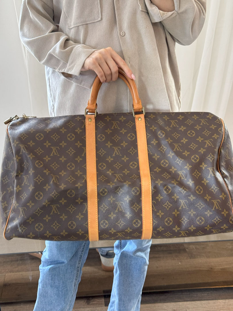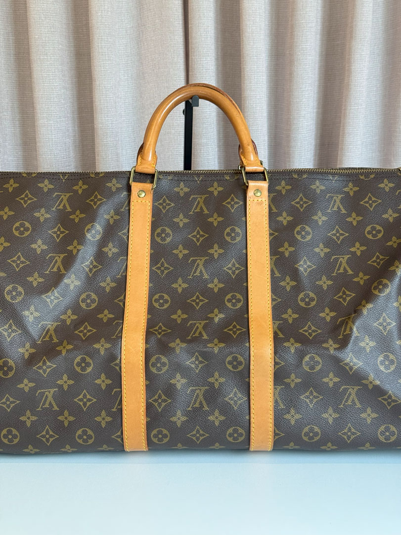 This vintage Louis Vuitton Keepall 55 is a travel bag crafted from brown Monogram canvas with vachetta leather details and gold-tone hardware. In very good condition, it has a clean interior, a smoothly working zipper, shiny hardware, and darker vachetta leather. Suitable as carry-on luggage and well-suited for travel. Dimensions: 55 x 31 x 24 cm. The datacode is MI 884.