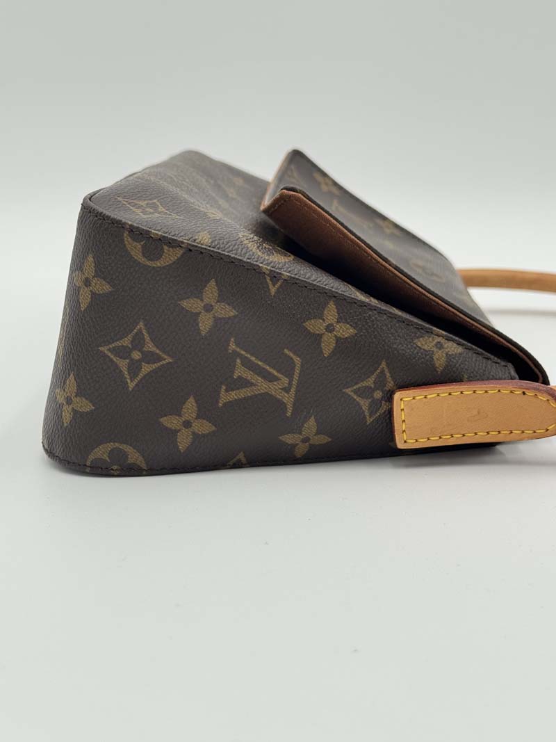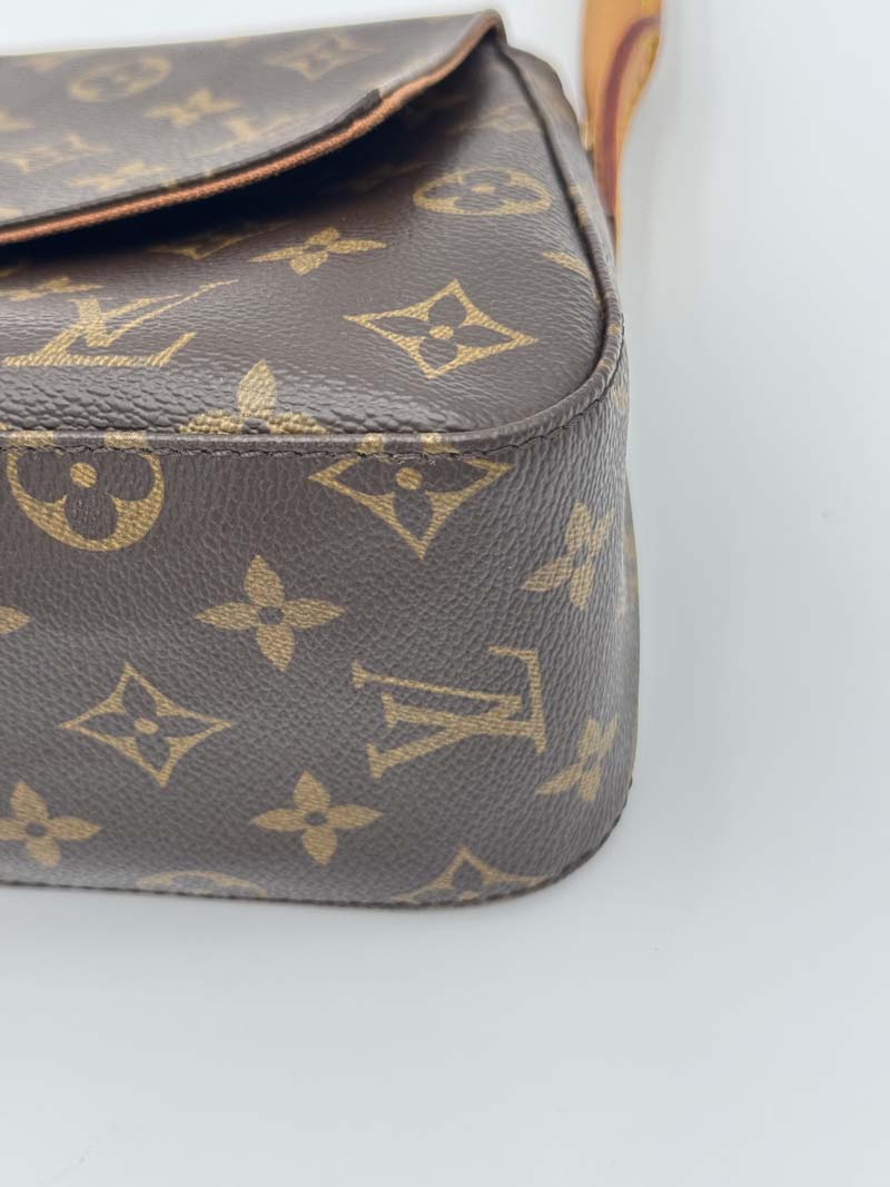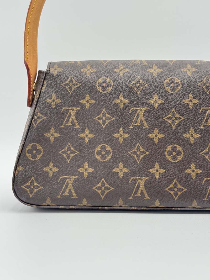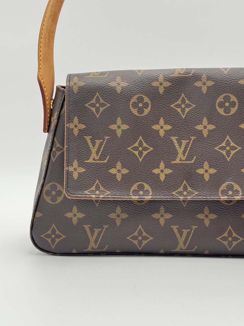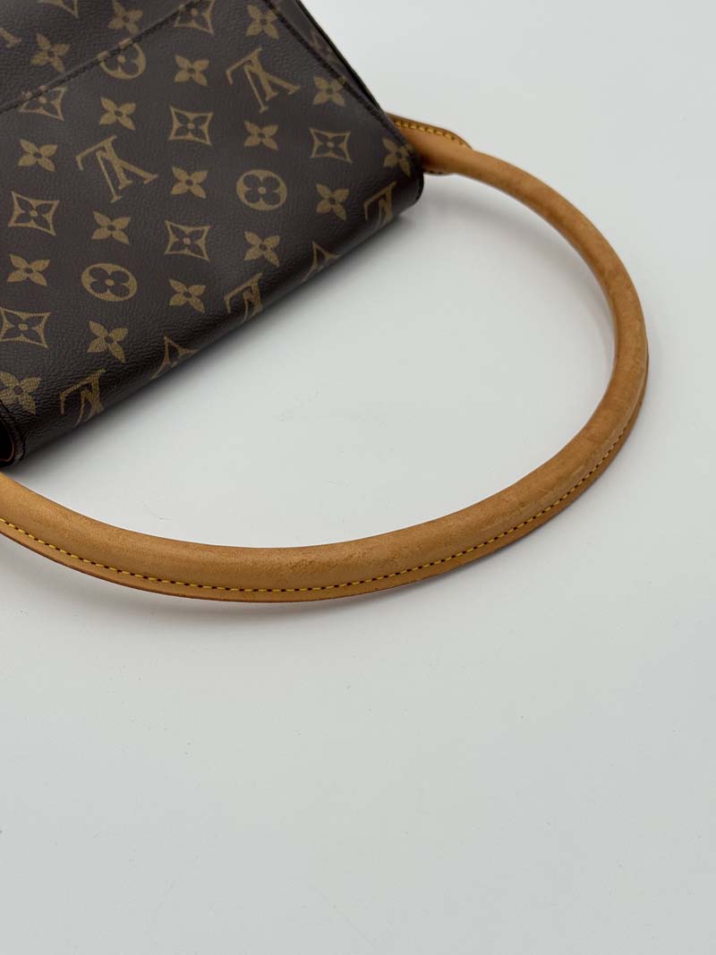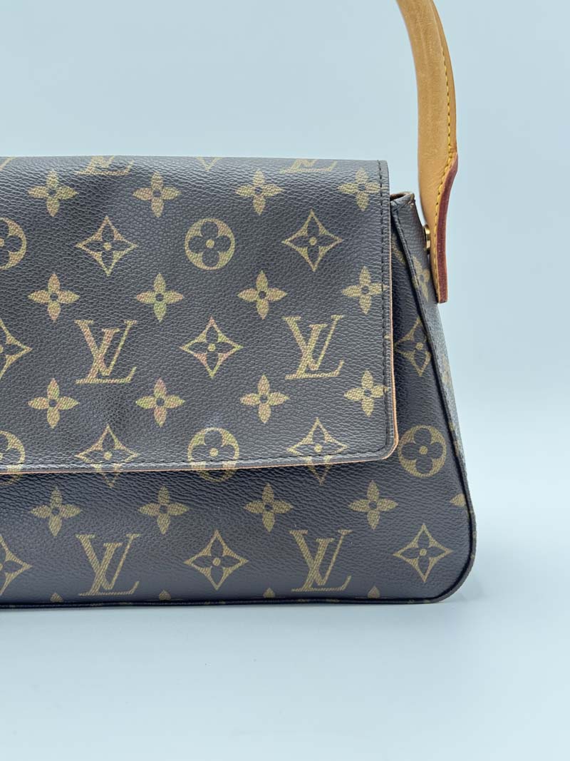 This vintage Louis Vuitton Mini Looping is a shoulder bag made from brown monogram canvas with gold-tone hardware. The item shows some user signs but is still in a very good condition, with wear on the corners. The interior is clean and features one extra clean compartment with a magnetic closure. Dimensions: 28 x 18 x 9 cm. The shoulder strap drop is 14 cm. The date code is DU0025 from 2005.