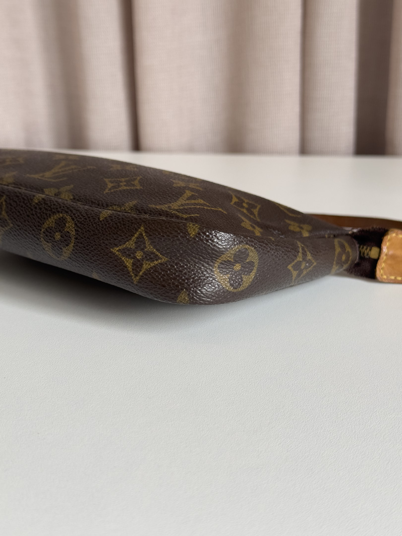 This vintage Louis Vuitton Monogram Pochette Accessoires is a compact and classic bag made from brown monogram canvas with vachetta leather and gold-tone hardware. It is in very good condition, with light discoloration on the hardware. The canvas is still firm, the zipper works well, and the interior is clean. Please note that this model may not always fit over the shoulder, but a longer strap can easily be attached. The datacode is AR1929 (1999). Dimensions: 21 x 13 x 3 cm.