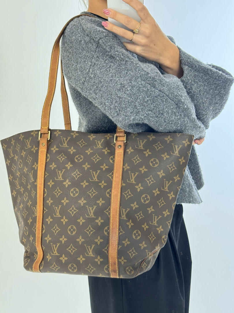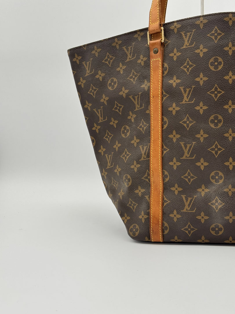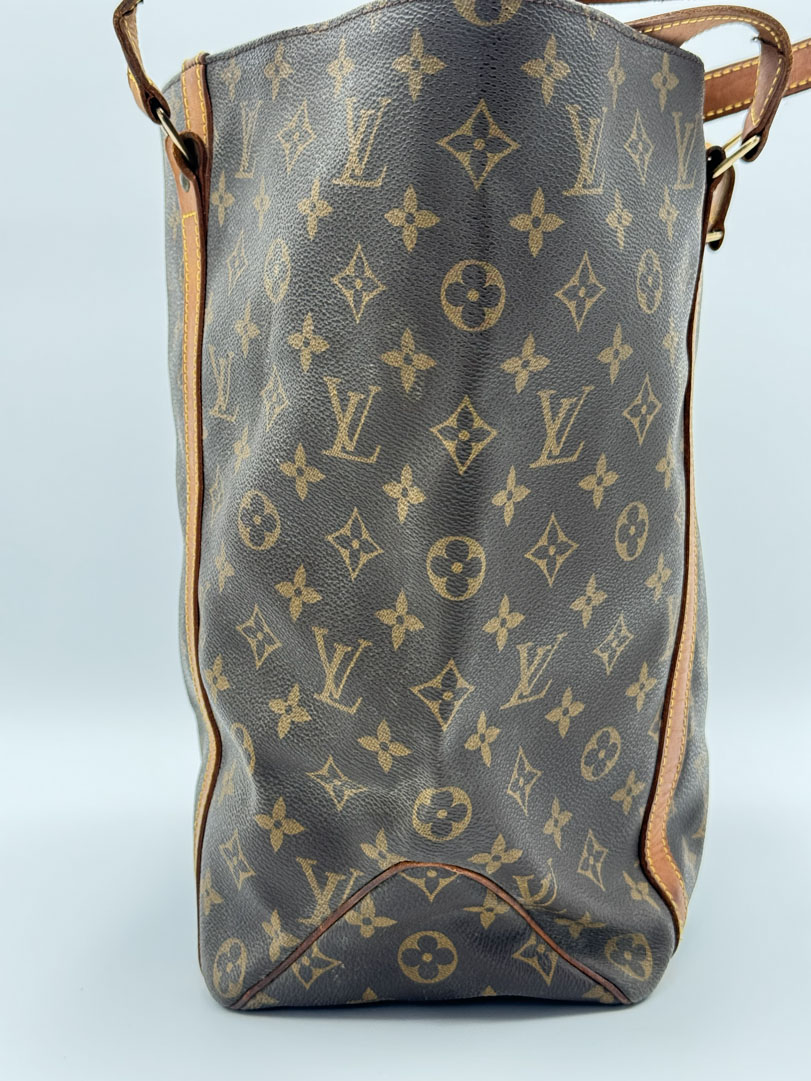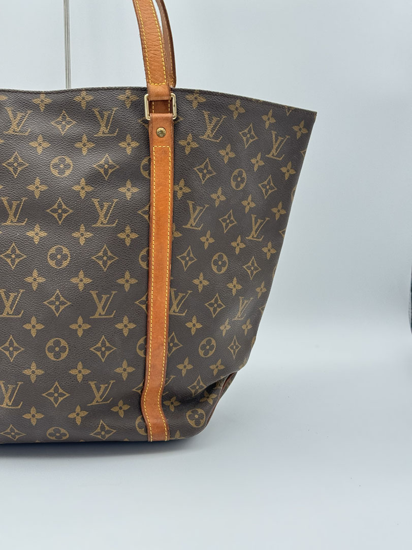 This vintage Louis Vuitton Monogram Sac Shopping Tote Bag is a shoulder bag made from brown Monogram canvas with gold-tone hardware. The item is in very good condition, showing some user signs such as wear on the corners. The interior is clean with an extra pocket. The bag has a vintage smell. The datacode is MB1907, from the year 1997, and the dimensions are 46 x 32 x 14 cm.