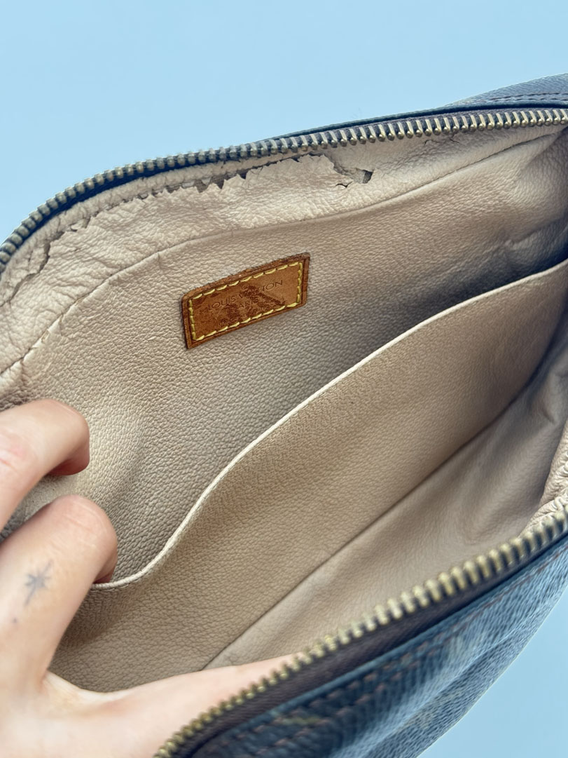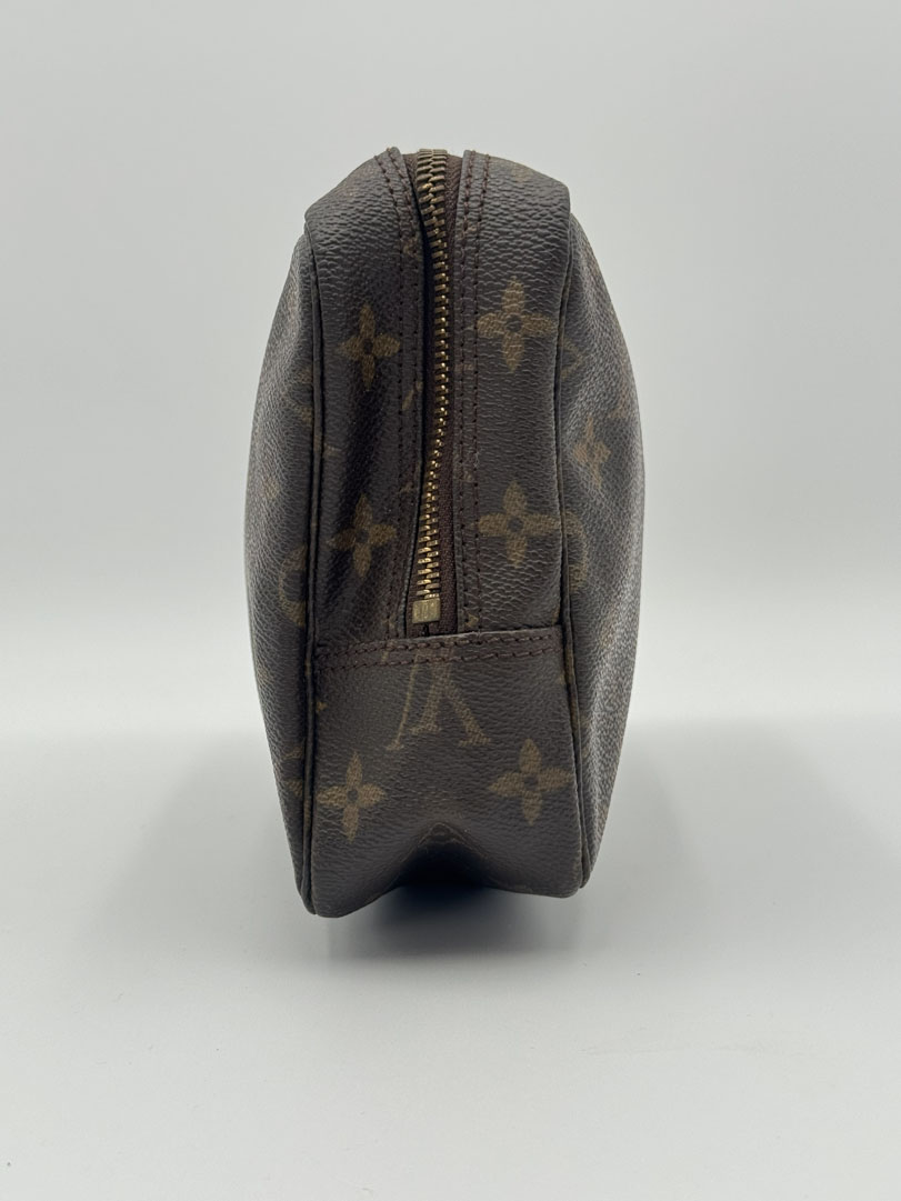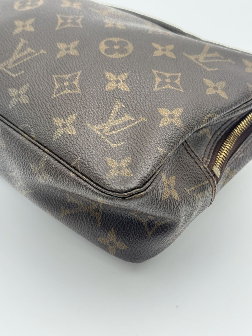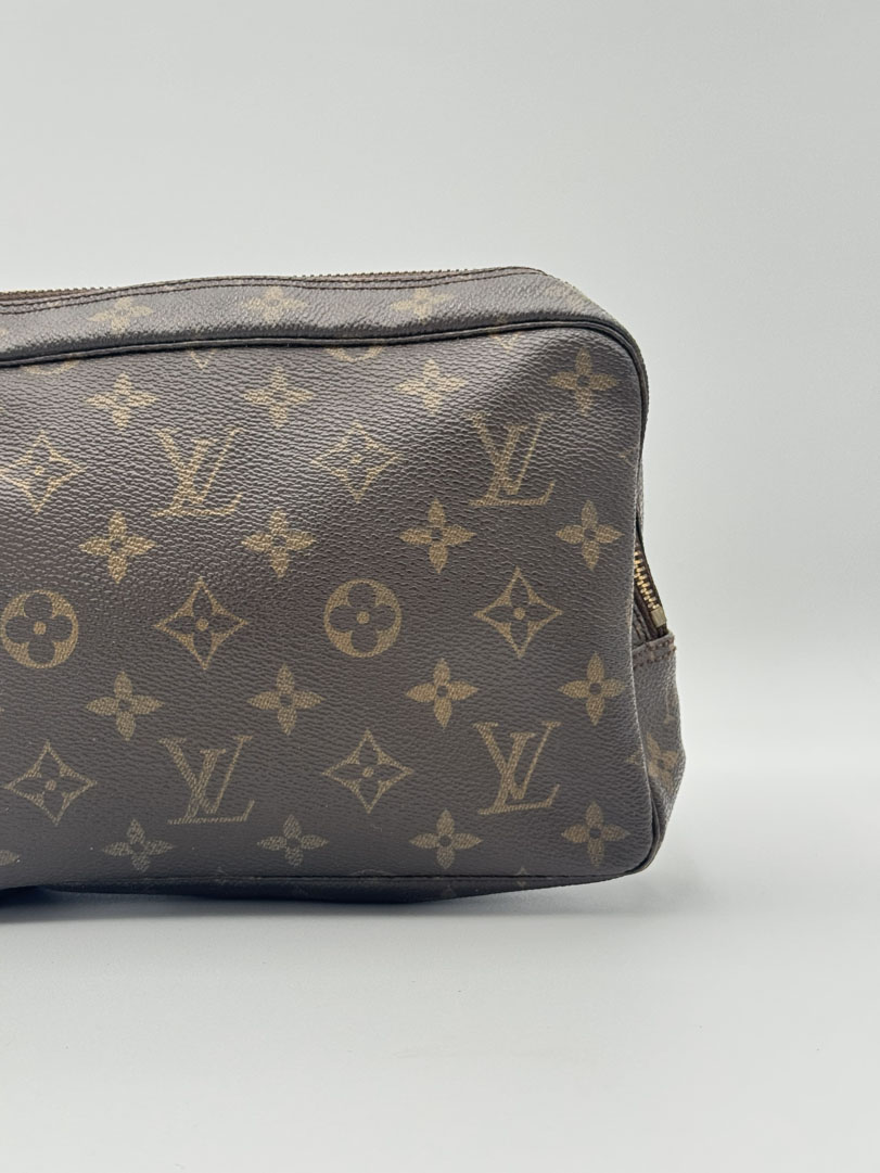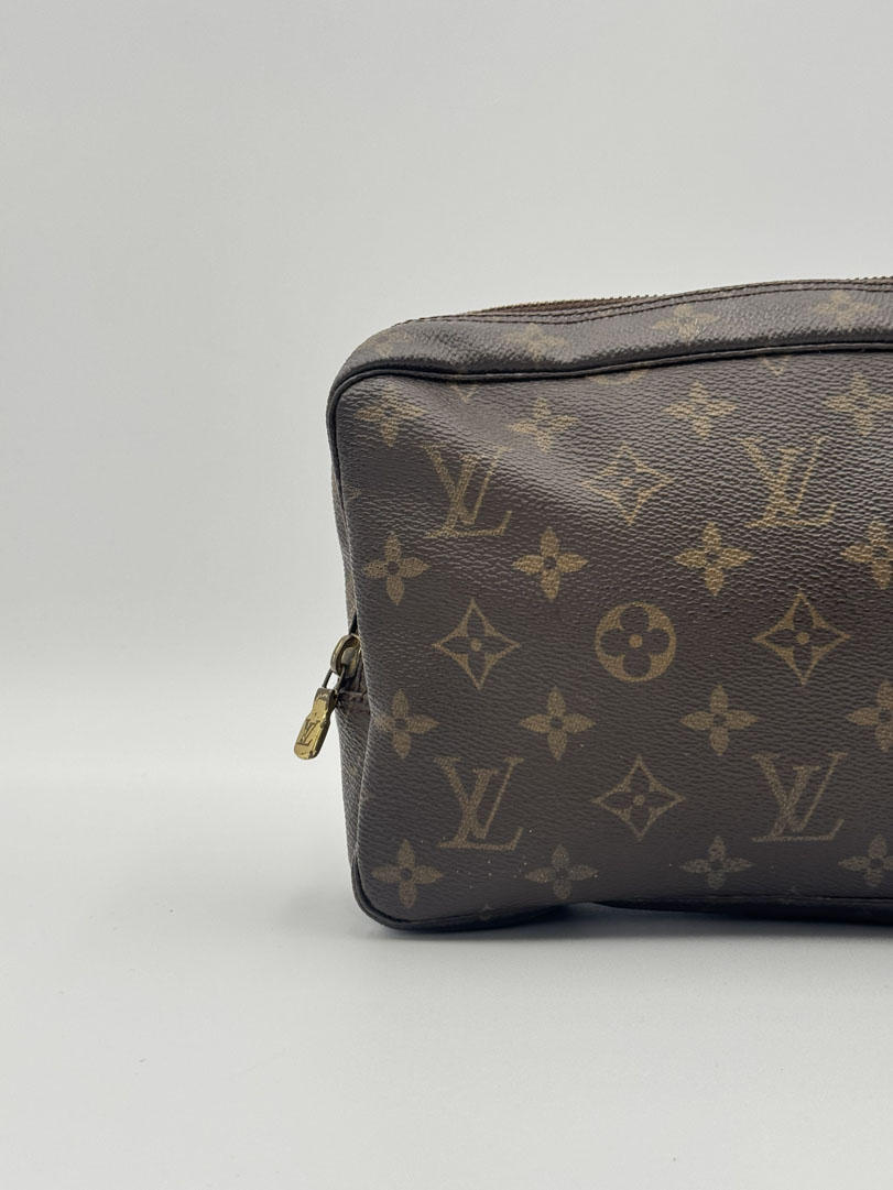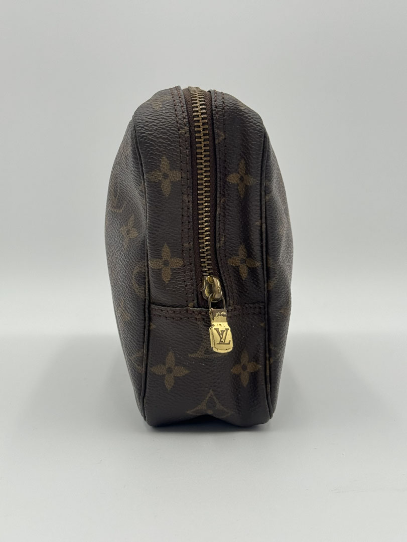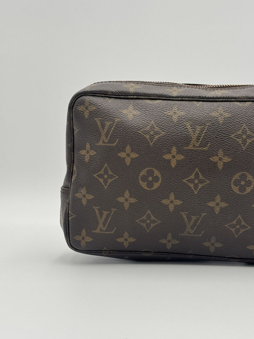 This vintage Louis Vuitton Monogram Trousse Toilette 23 is made from brown Monogram canvas. The item is in very good condition, showing some user signs such as wear on the corners and peeling on the interior. The dimensions are 23 x 16 x 6 cm.