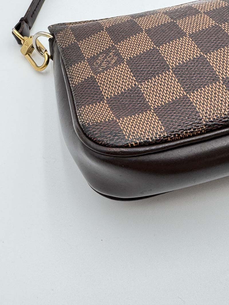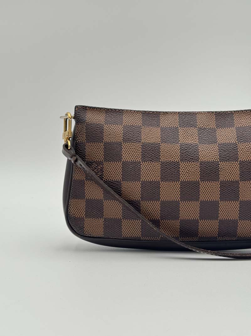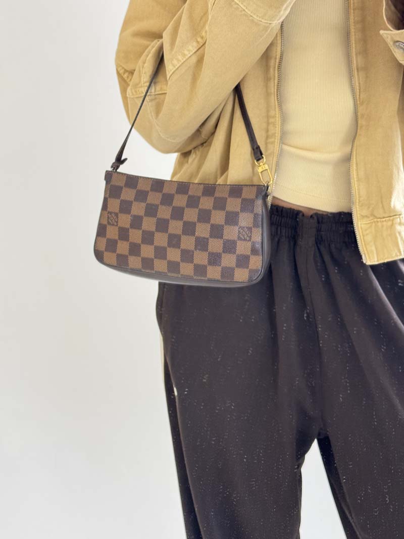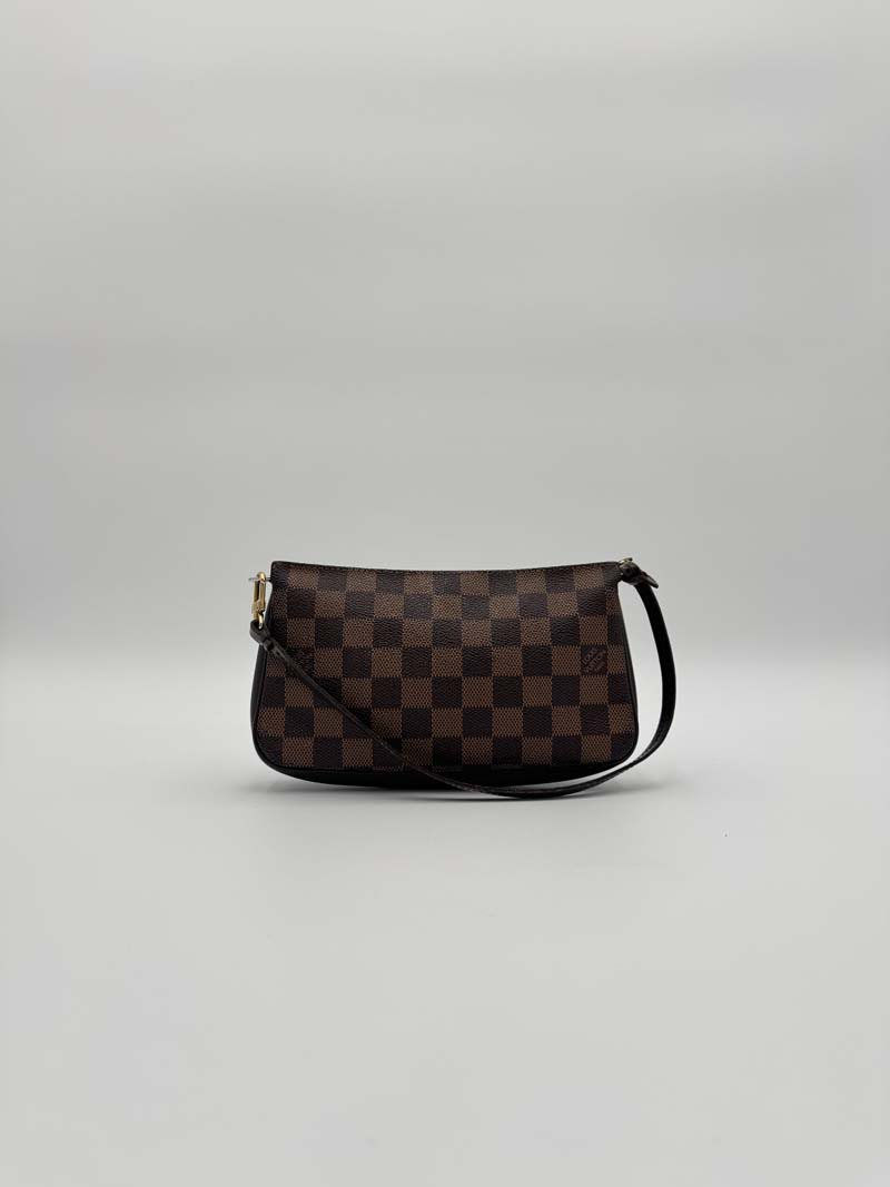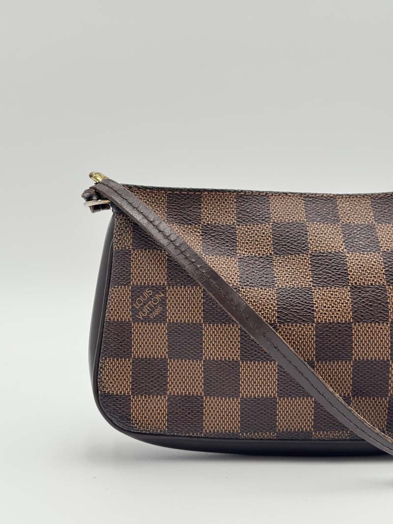 This vintage Louis Vuitton Navona Pochette is a shoulder bag made from brown Damier Ebene canvas with gold hardware. The item shows some user signs but is still in a very good condition, with light imperfections and signs of use such as small imperfections on the leather and hardware. The interior is clean, and the bag features a zipper closure. Dimensions: 21 x 12 x 2.5 cm. The date code is not readable. It is a small pochette with a removable wrist strap.