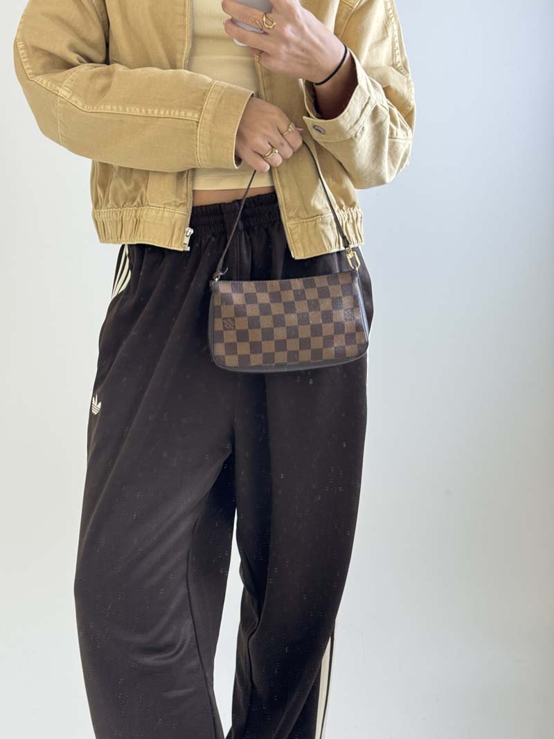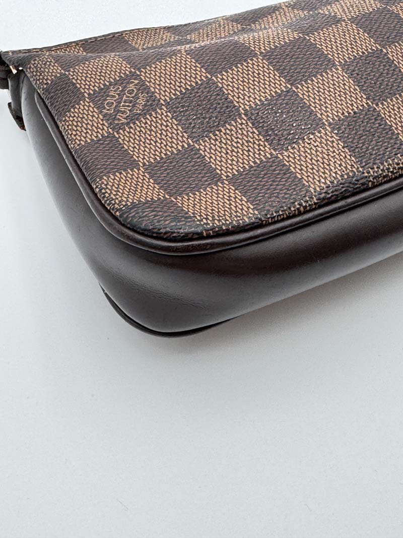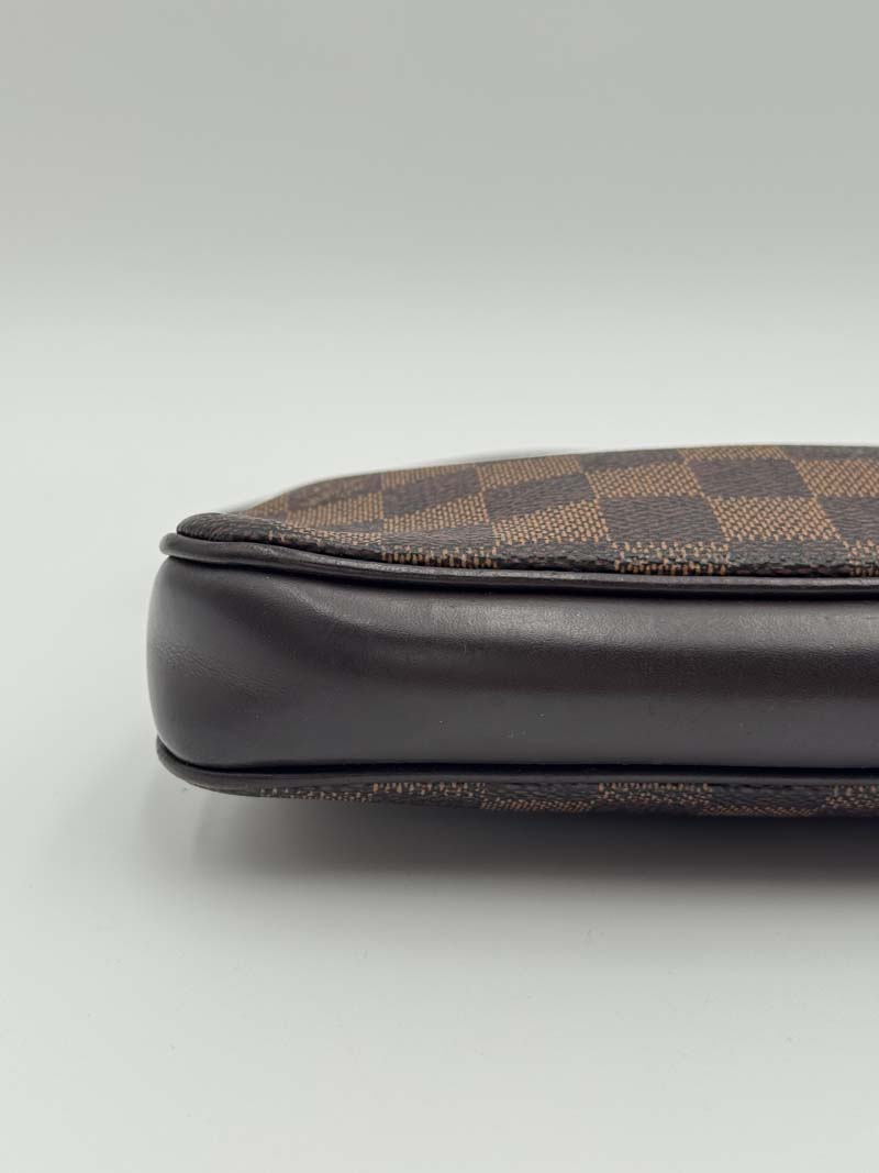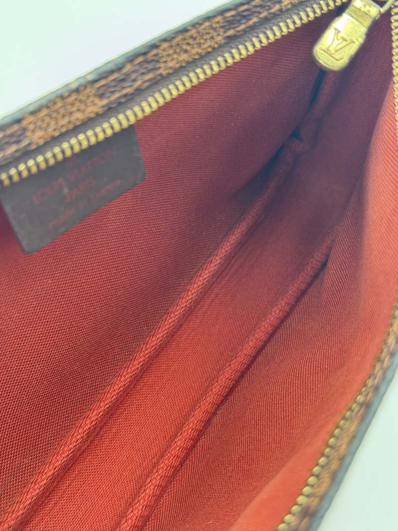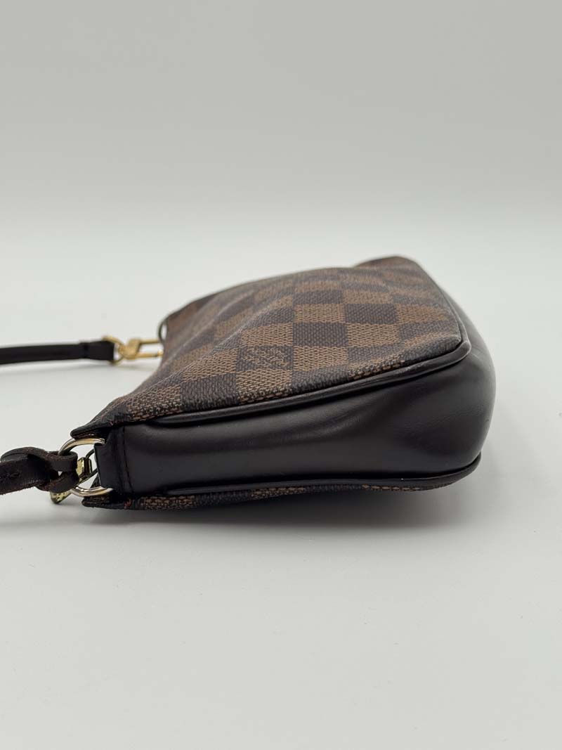 This vintage Louis Vuitton Navona Pochette is a shoulder bag made from brown Damier Ebene canvas with gold hardware. The item shows some user signs but is still in a very good condition, with light imperfections and signs of use such as small imperfections on the leather and hardware. The interior is clean, and the bag features a zipper closure. Dimensions: 21 x 12 x 2.5 cm. The date code is not readable. It is a small pochette with a removable wrist strap.