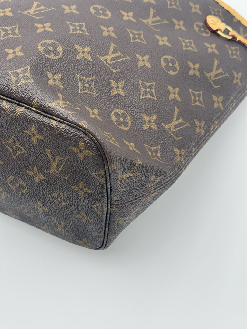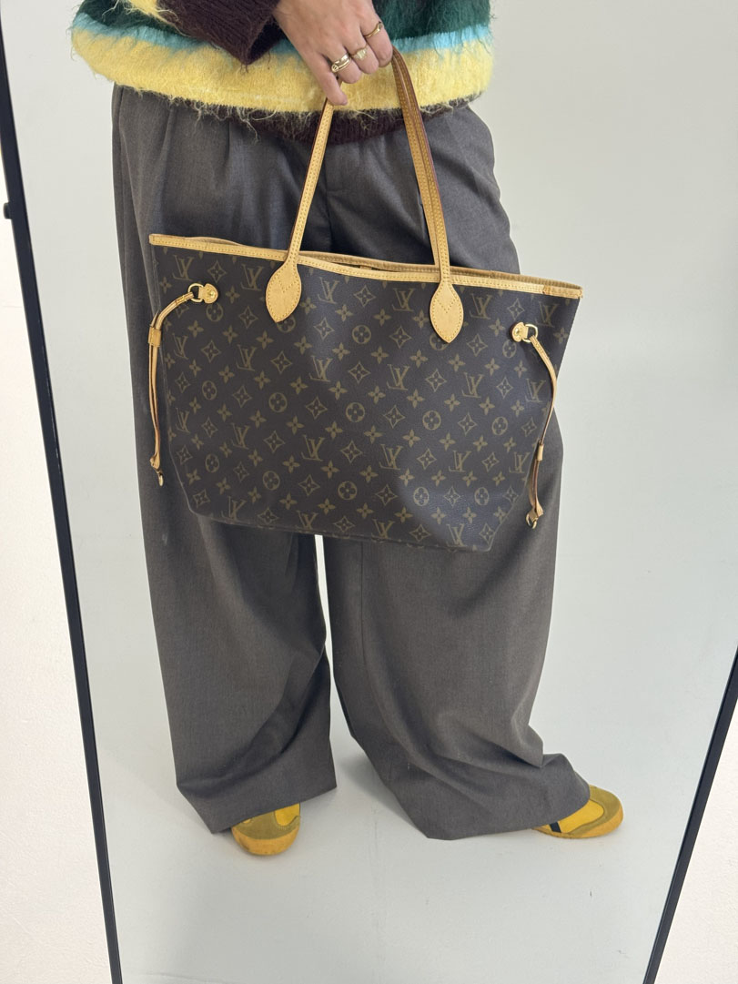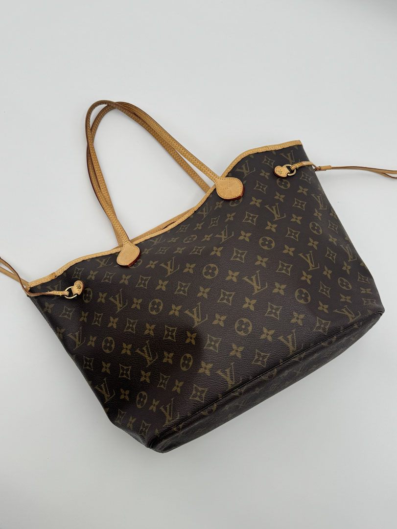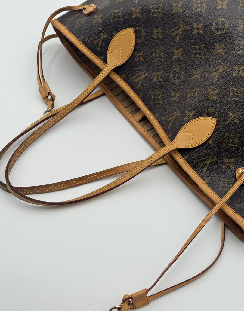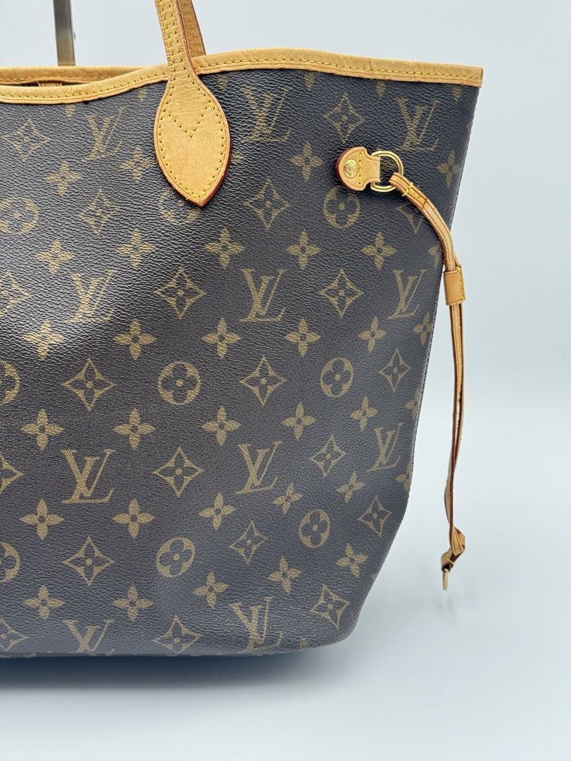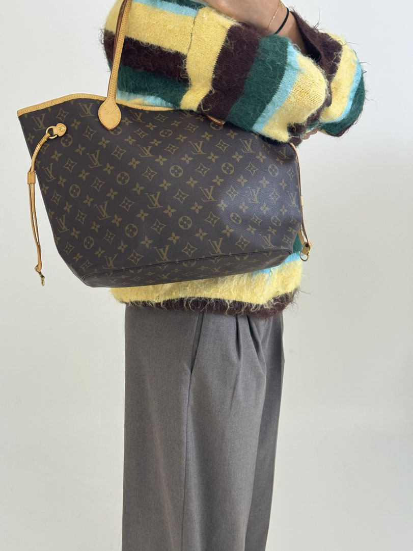 This vintage Louis Vuitton Neverfull MM is a shoulder bag crafted from brown Monogram canvas with gold-tone hardware. It is in good condition, showing flaws or signs of use such as small cracks in the vachetta leather. The interior is clean with an extra pocket, and the bag closes with a snap button on the inside. The datacode is SP2078, from 2008. Dimensions: 44 x 28 x 14 cm.