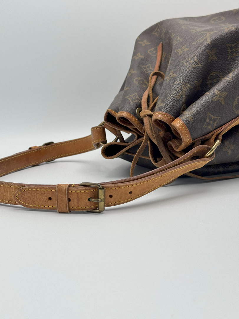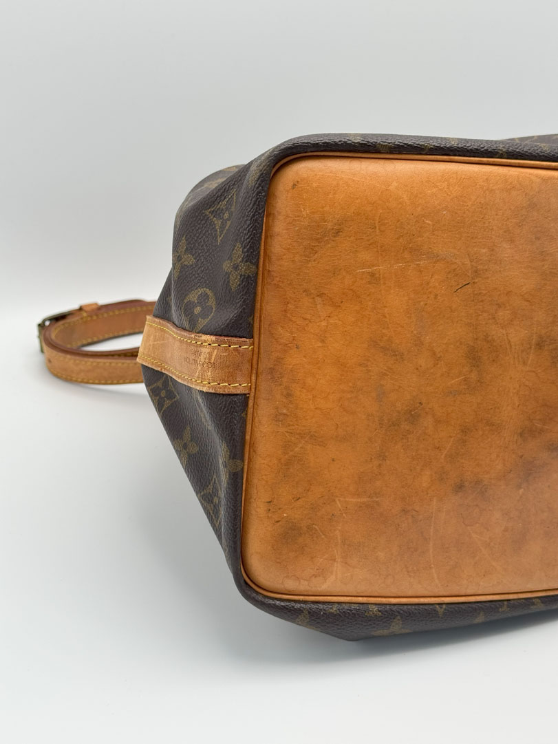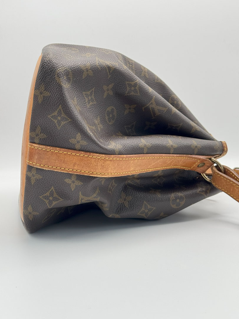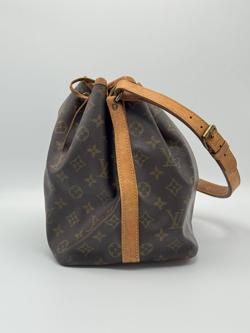 This vintage Louis Vuitton Petit Noé is a stylish shoulder bag made from monogram canvas with vachetta leather and gold-tone hardware. It is in very good condition, showing only light imperfections, scratches, and wear on the vachetta, which has a nice darker patina. The interior is clean except for a small mark. Year: 1992. Dimensions: 27 x 27 x 21 cm.
