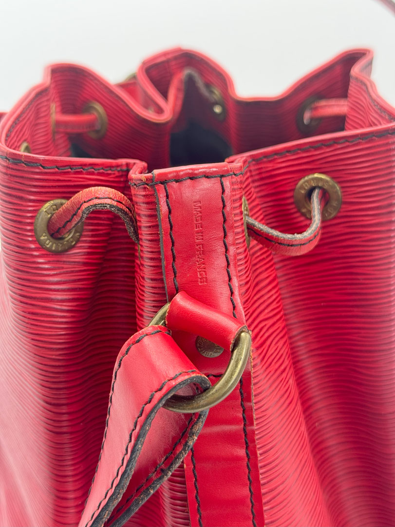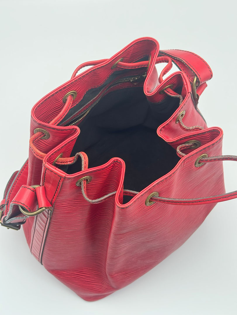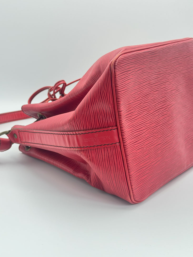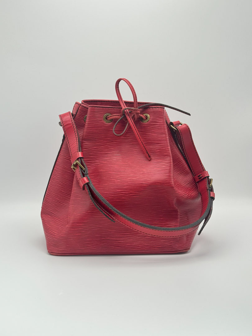 The Louis Vuitton Petit Noé in red Epi leather is a stunning vintage piece that combines practicality with a pop of color. This bag is in very good condition with light signs of use. The interior is clean and odor-free, with a spacious main compartment and a smaller zippered pocket for added organization. The hardware remains in good condition, adding to the overall charm of this beautiful vintage bag. The dimensions are 24 x 27 x 19 centimeters.