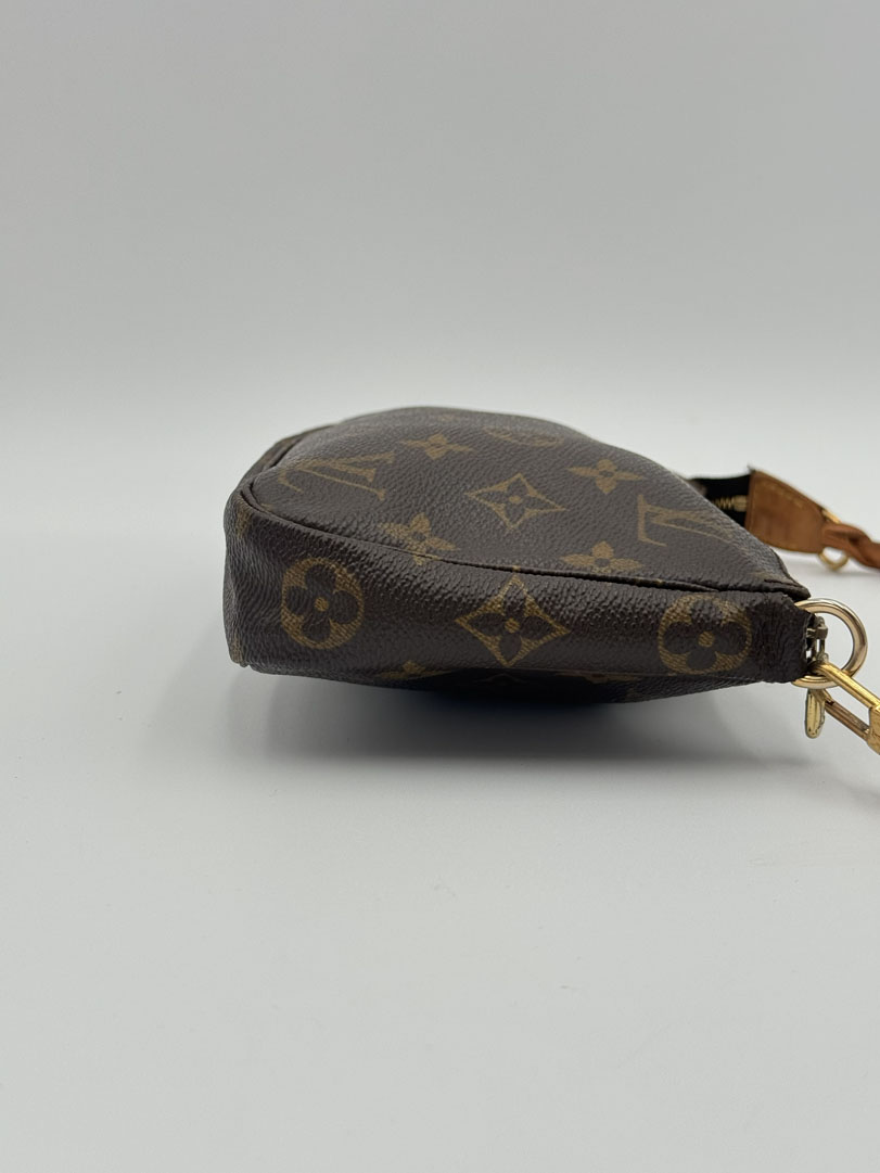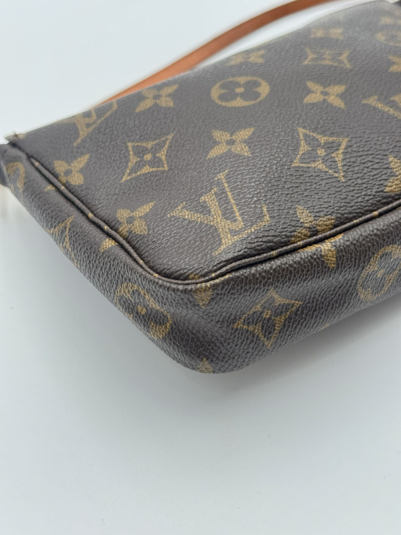 This vintage Louis Vuitton Pochette Accessoires is a handbag/clutch made from brown Monogram canvas with gold-tone hardware. The item is in very good condition, showing some user signs such as light discoloration of the vachetta leather. The interior is clean. This is a small pochette with a detachable wrist strap and can also be used as a clutch. The datacode is VI0020 from the year 2000, and the dimensions are 21 x 12 x 4 cm.