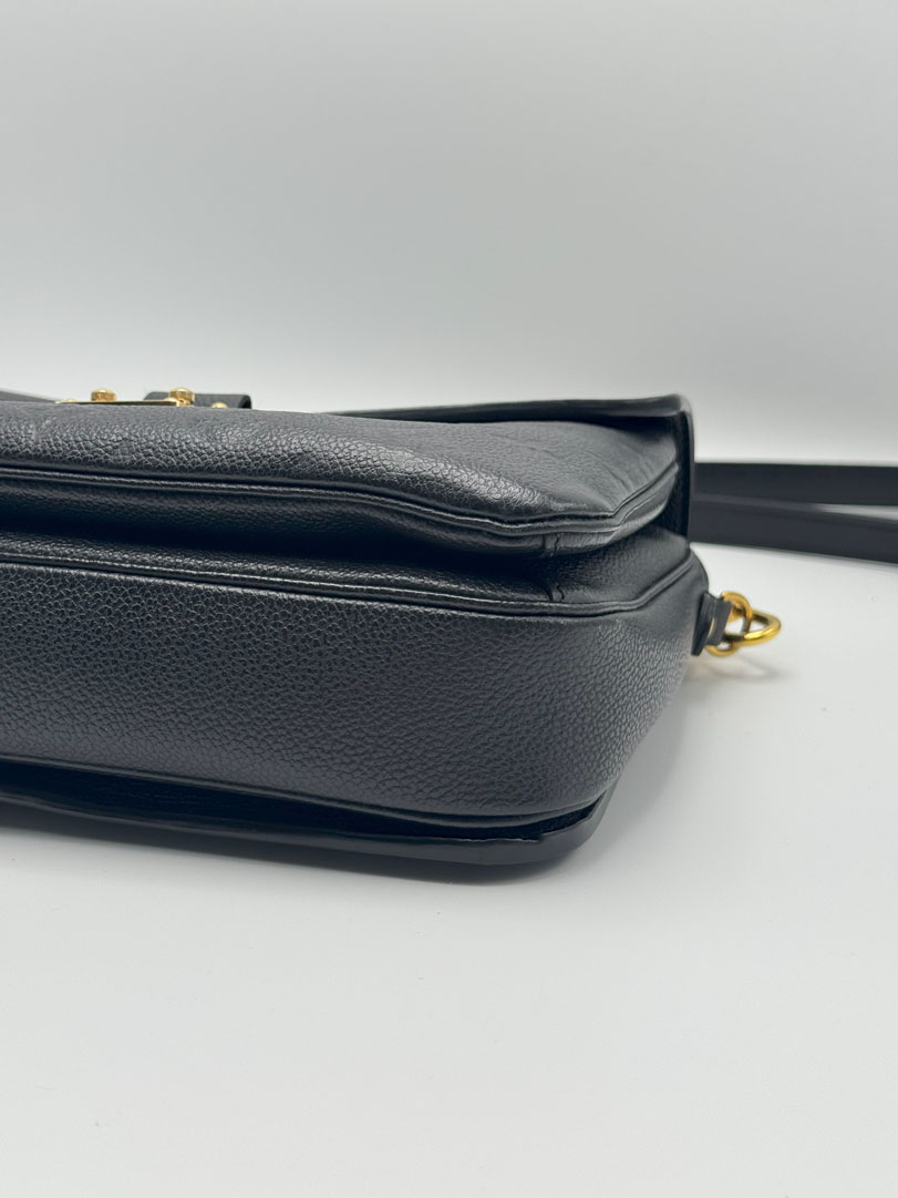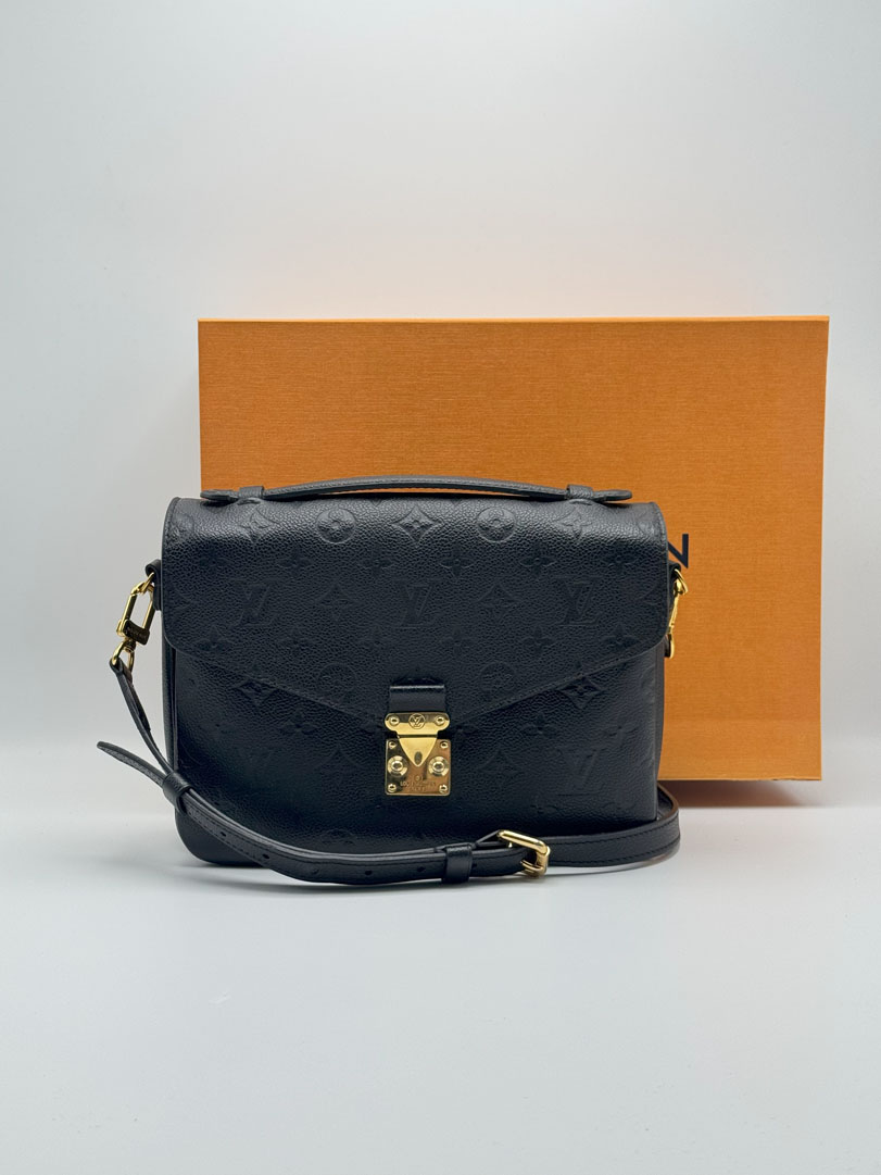 This preloved Louis Vuitton Pochette Métis is a crossbody bag crafted from black Monogram Empreinte canvas with gold-tone hardware. It is in excellent condition, clean with an extra zippered pocket inside, showing only minor scratches on the hardware and a small mark on the interior. It comes with a dustbag and box. The datacode is AR0149. Dimensions: 25 x 19 x 7 cm.