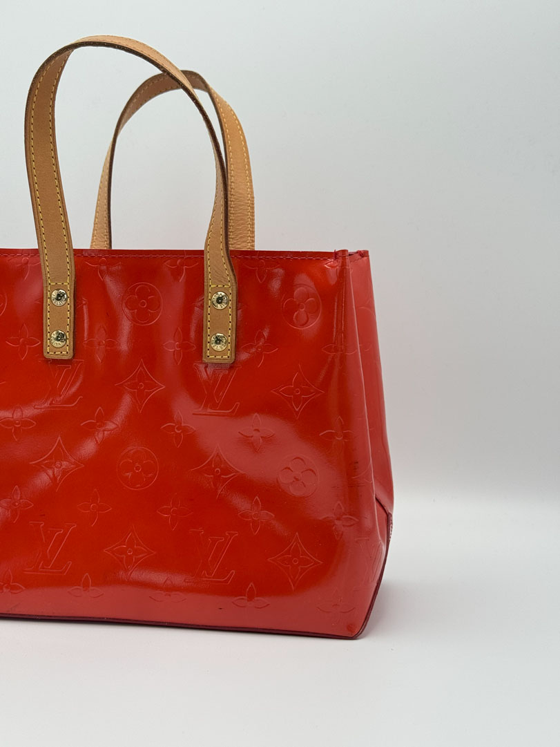 The Louis Vuitton Reade PM in red vernis leather is in very good vintage condition and features vachetta leather handles and gold-tone hardware. The interior is spotless, the hardware retains its shine, and the leather is beautifully preserved. A striking piece in fantastic shape. Measurements: 22 × 18 × 10 cm. Date code MI0092 (2002).