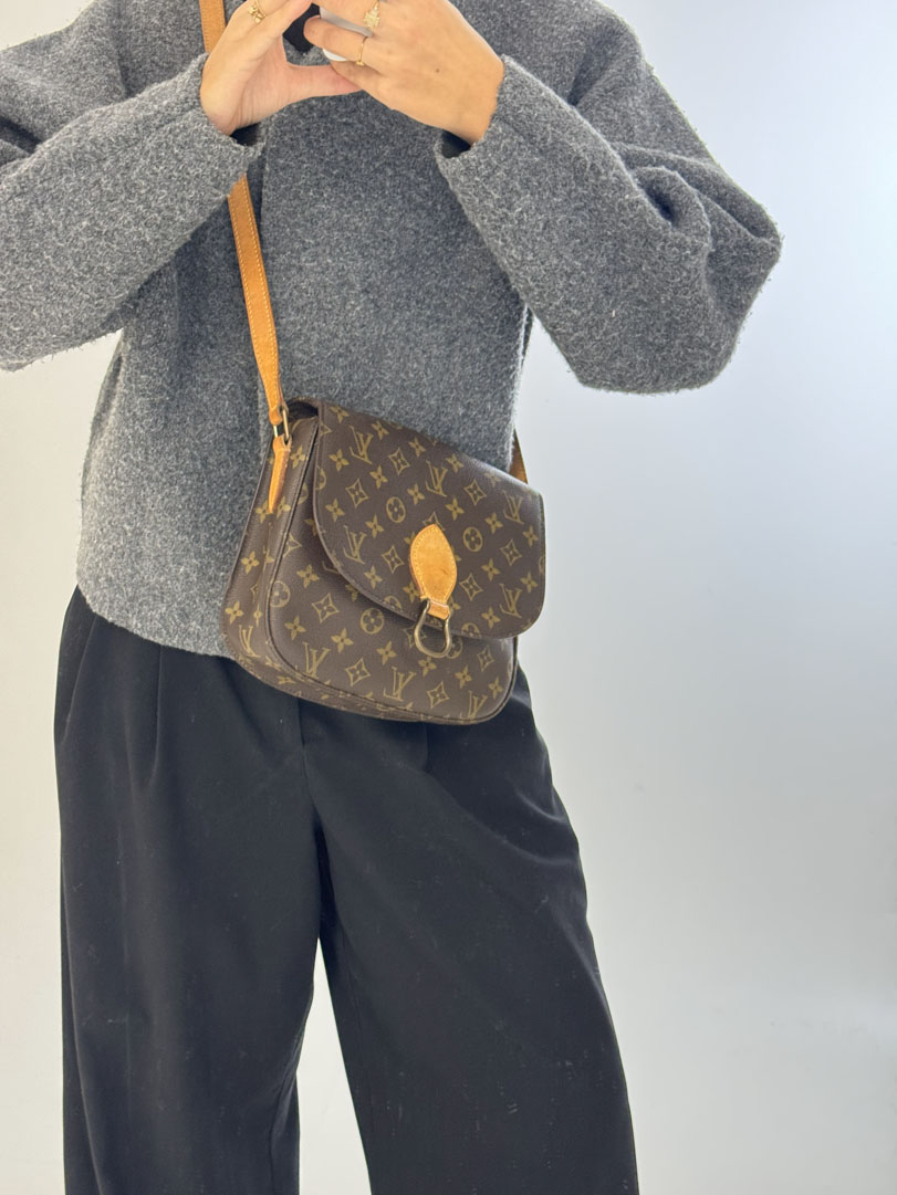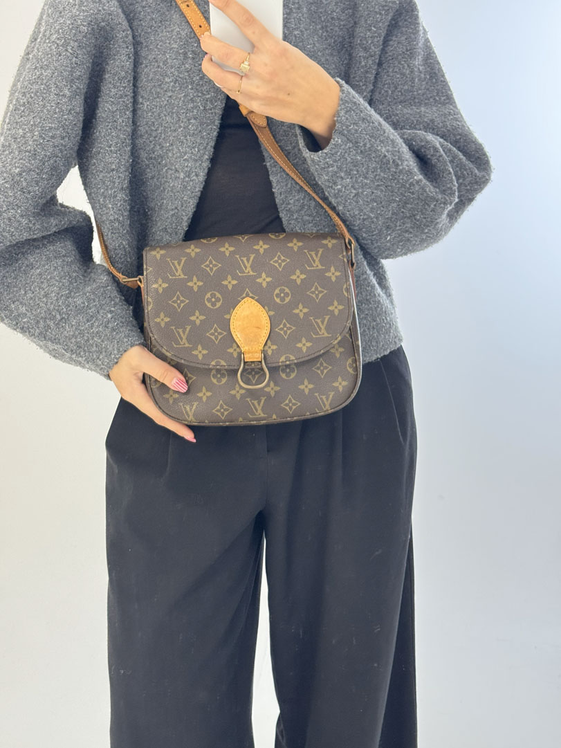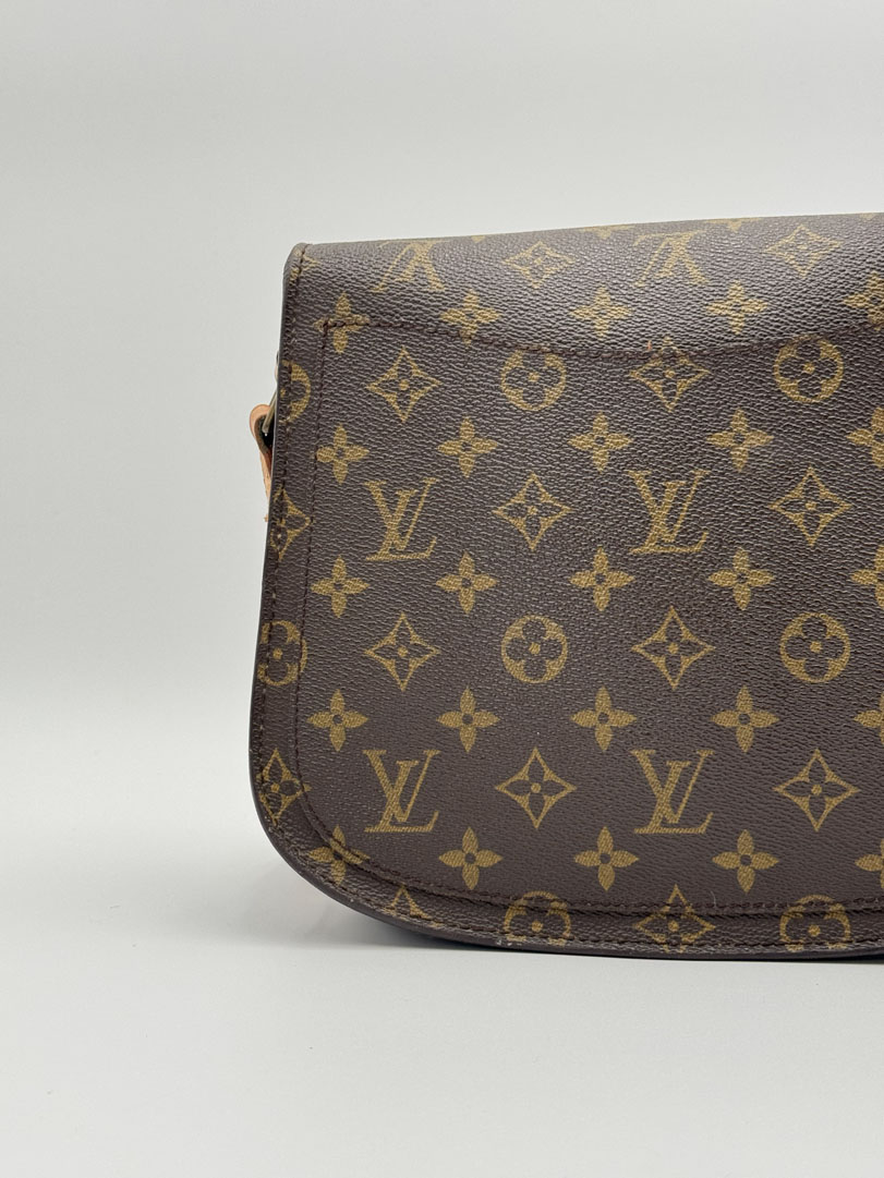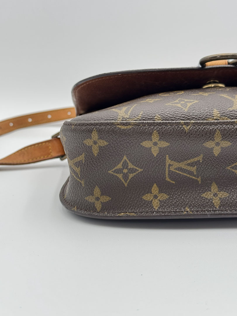 This vintage Louis Vuitton Saint Cloud GM is a crossbody bag made from brown Monogram canvas with gold-tone hardware. The item is in very good condition, showing some user signs such as discoloration of the hardware. The interior is clean with an extra pocket. This is the largest Saint Cloud size and features a characteristic flap with a buckle and snap button closure. The dimensions are 20 x 24 x 6 cm.