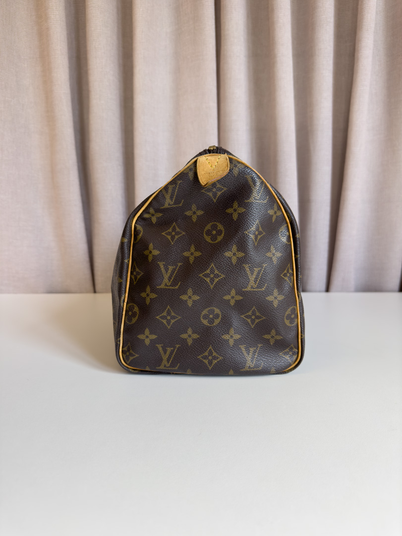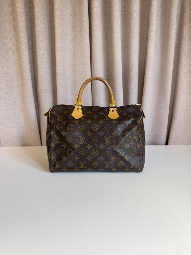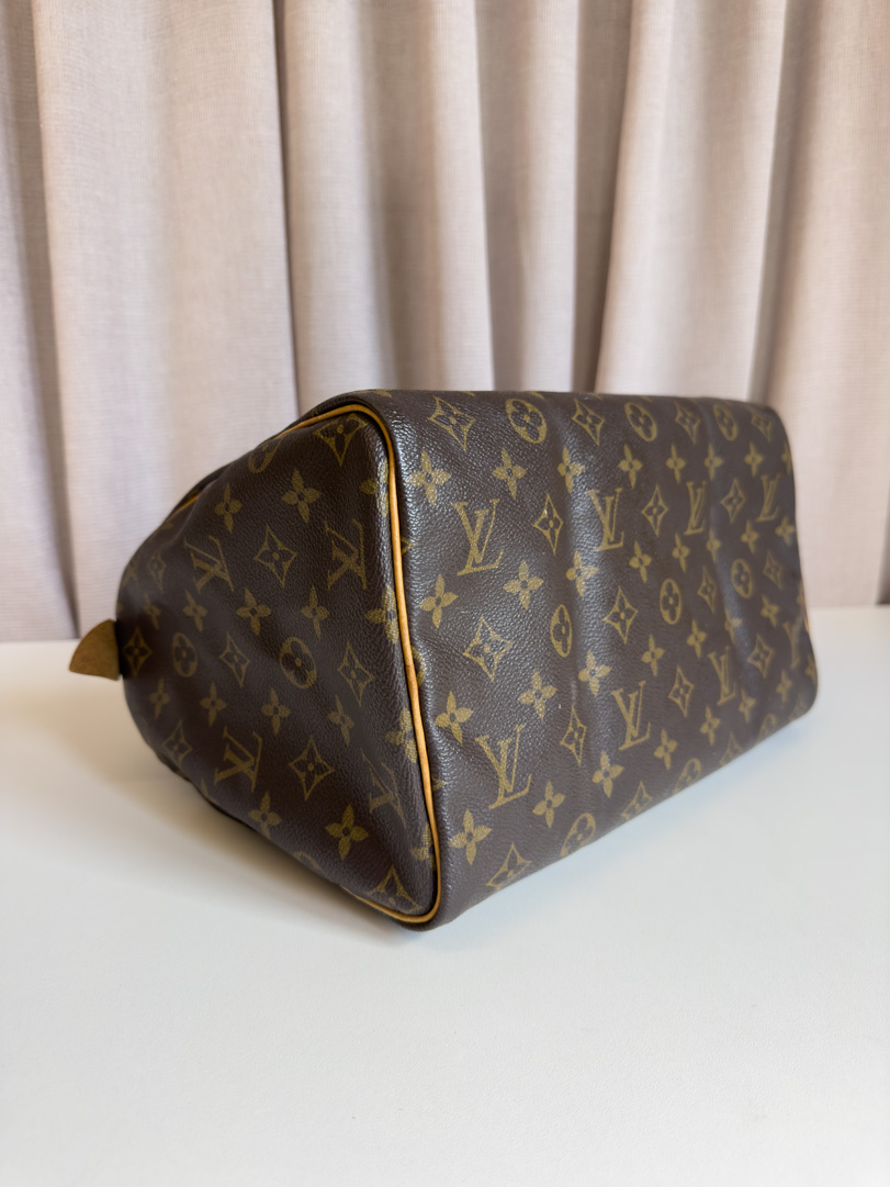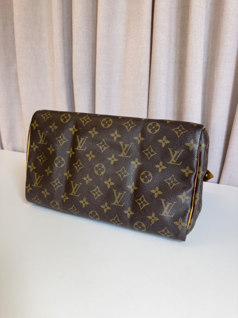This vintage Louis Vuitton Speedy 30 is a timeless handbag made from monogram canvas with vachetta leather and gold-tone hardware. It is in very good condition, with shiny hardware, a working zipper, and a clean interior. The zipper pull is missing, and one side tab has a small tear, but overall the bag remains in fantastic shape. Comes with a dustbag. The datacode is TH0947 and the dimensions are 30 x 21 x 17 cm.