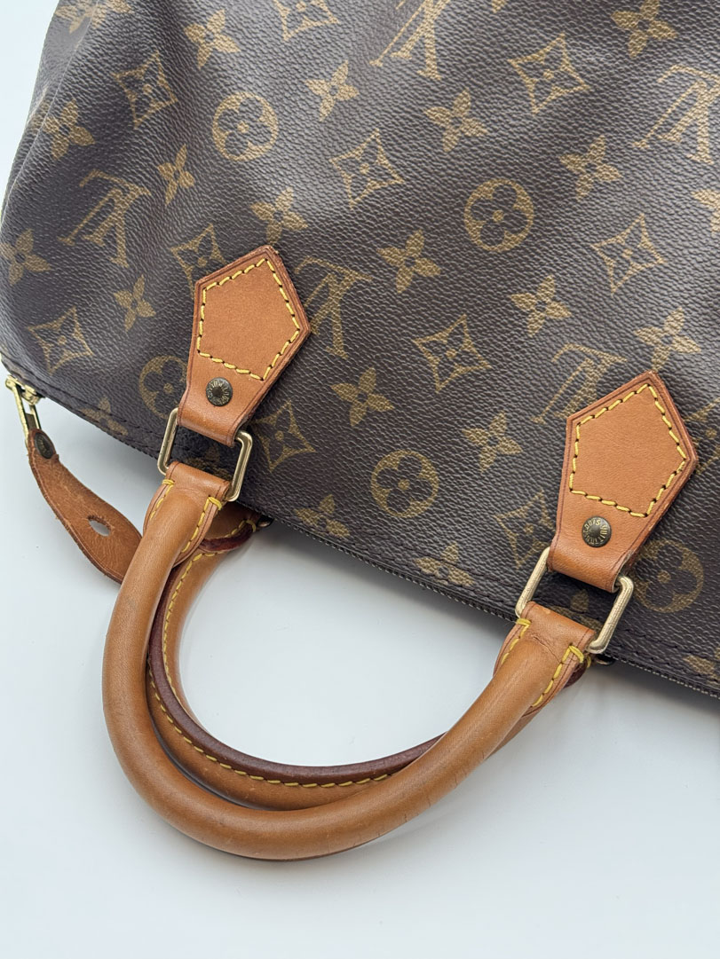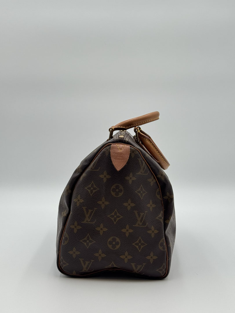 This vintage Louis Vuitton Speedy 30 is a handbag crafted from Monogram Canvas with gold-tone hardware. It is in beautiful condition with darker patina on the vachetta leather, adding to its vintage charm. The interior is clean with an extra pocket. Dimensions: 30 x 21 x 17 cm. Date code: SP0954. Year: 1994.
