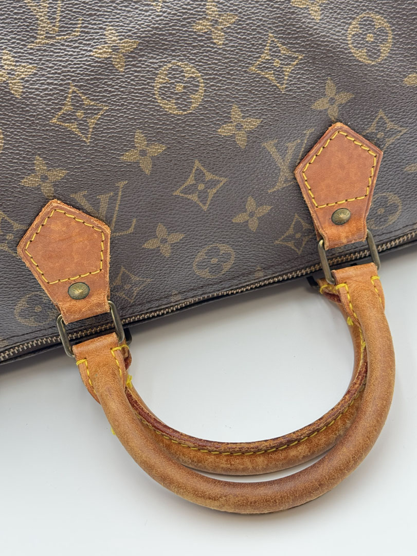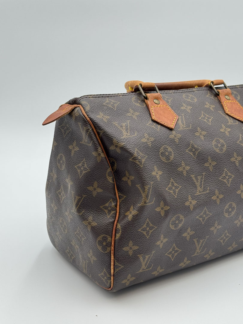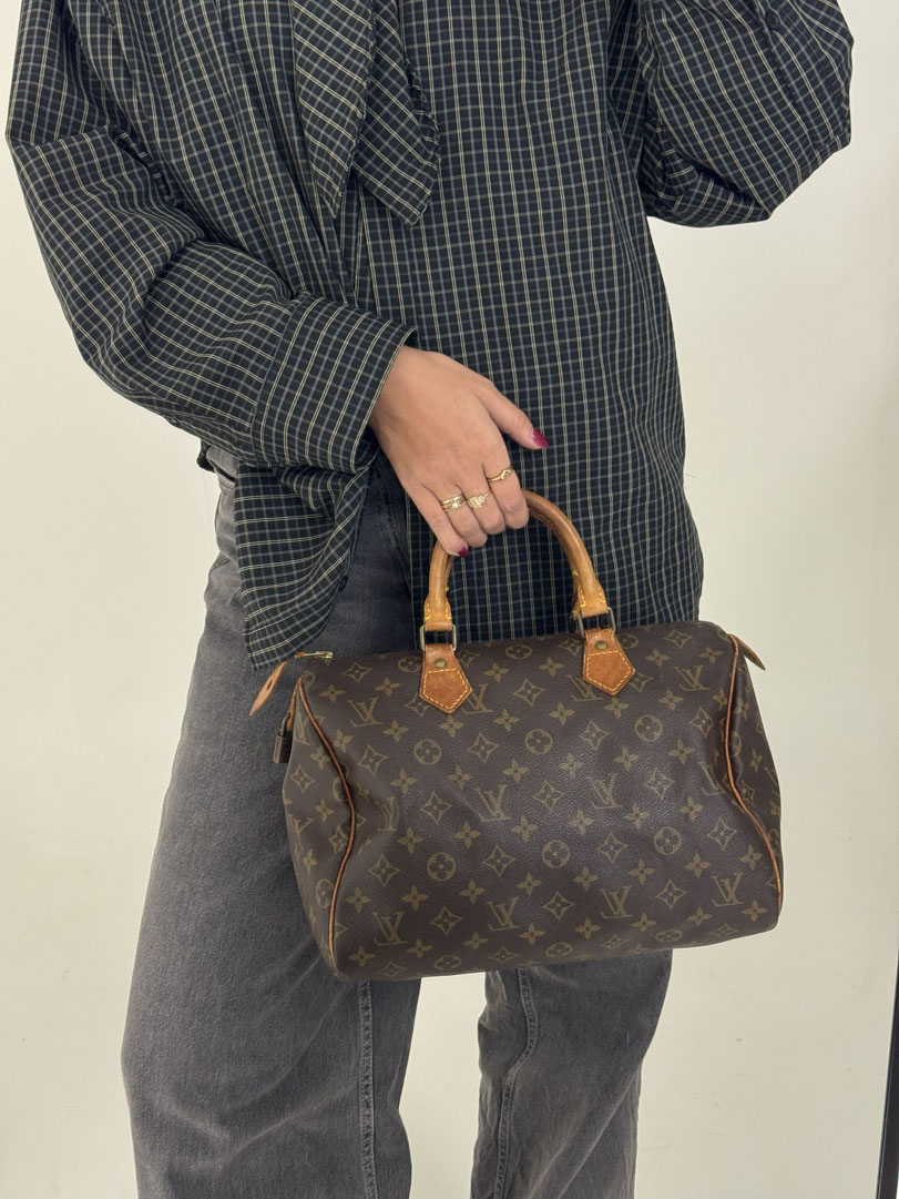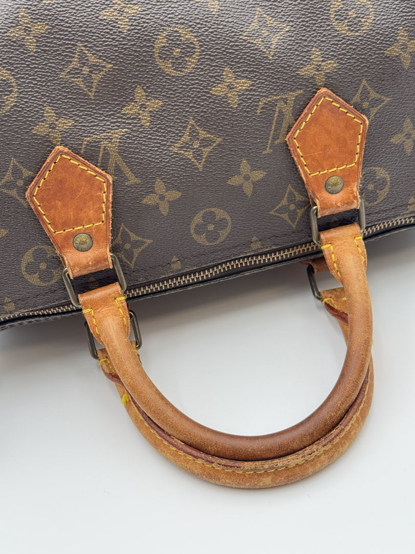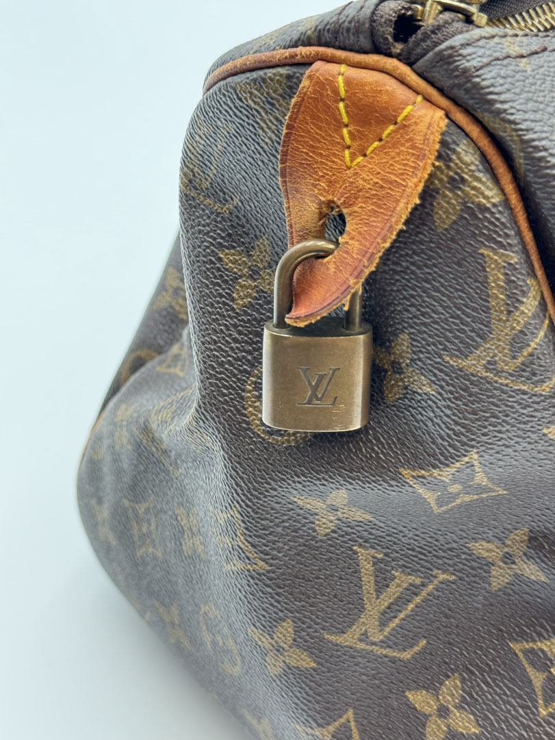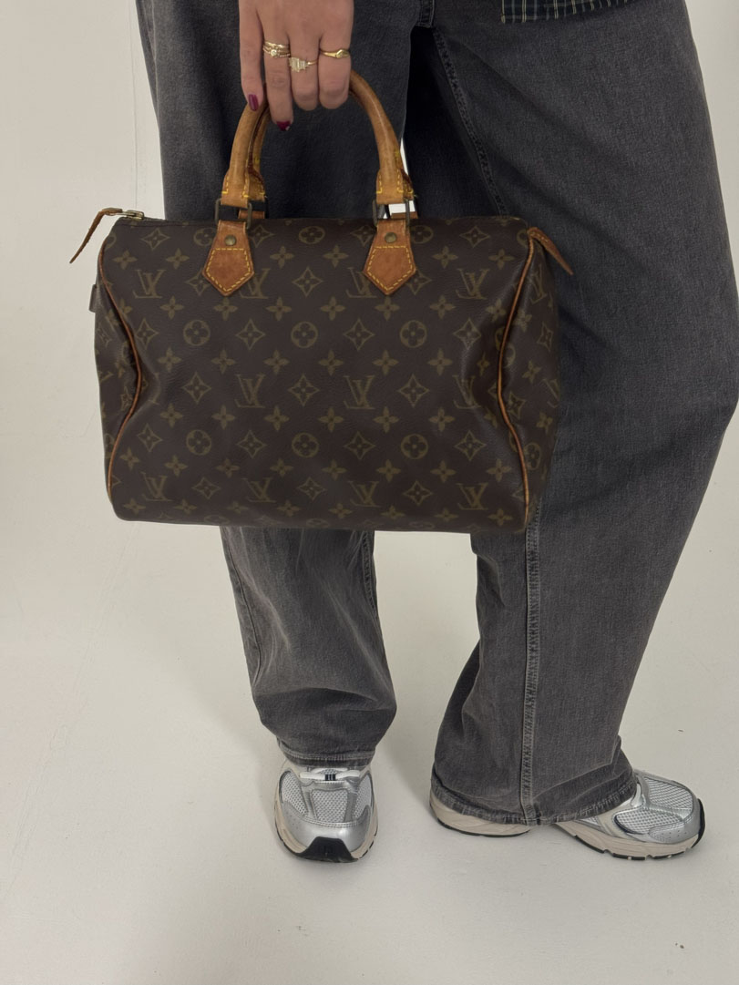 This vintage Louis Vuitton Speedy 30 is a handbag crafted from brown Monogram canvas with gold-tone hardware. It is in very good condition, showing minimal signs of use. The hardware is slightly discolored, and the vachetta leather shows small imperfections. The zipper functions well, and the interior is clean with an extra pocket. Dimensions: 30 x 21 x 17 cm. The datacode is VI0911, from 1991.