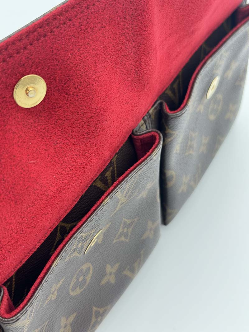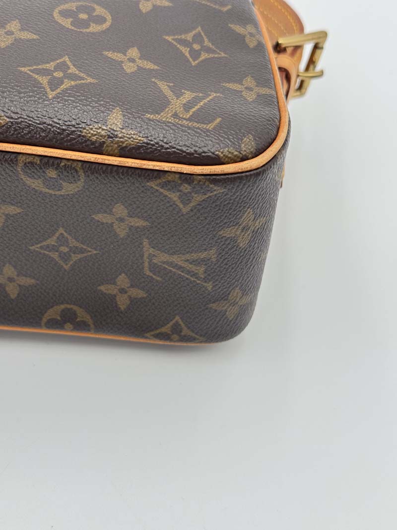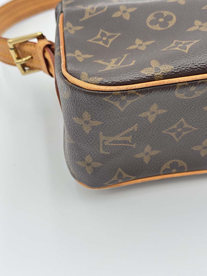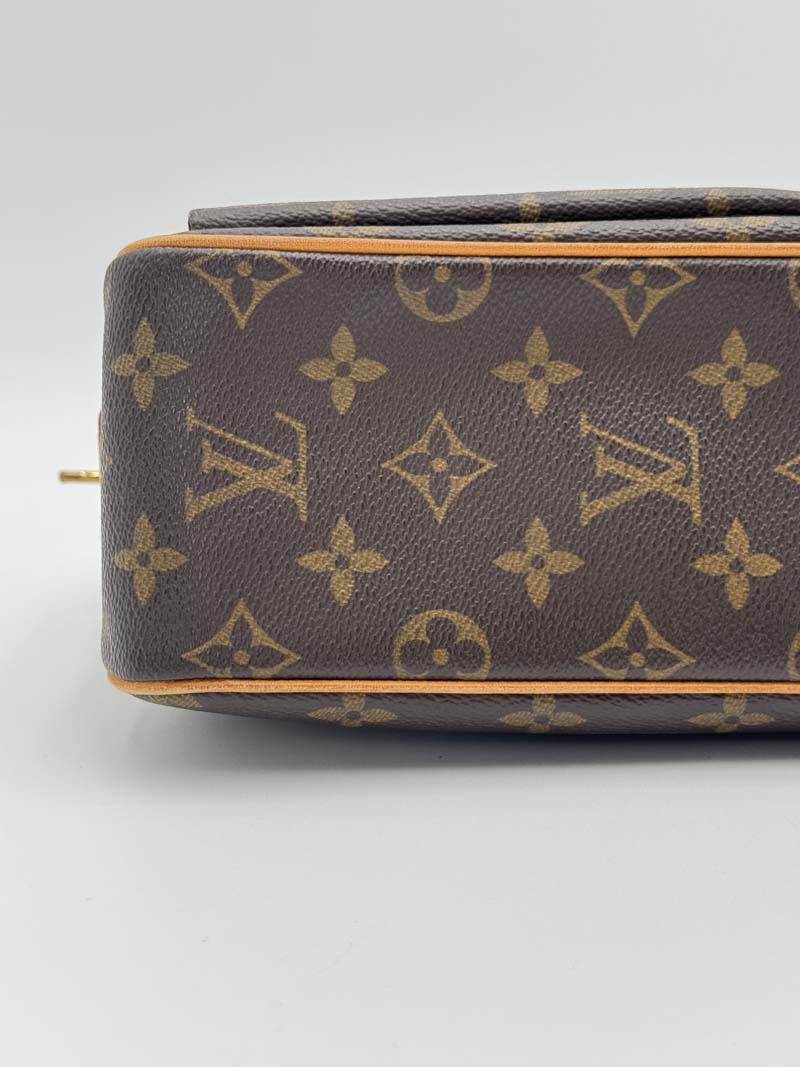 This vintage Louis Vuitton Viva Cite is a shoulder bag made from brown monogram canvas with gold-tone hardware. The item shows some user signs but is still in a very good condition, with light signs of use including discoloration on the hardware and general imperfections such as wear on the corners. The interior is clean and features one extra clean compartment with a zipper closure. Dimensions: 28 x 14 x 9 cm. The shoulder strap drop is 21 cm.