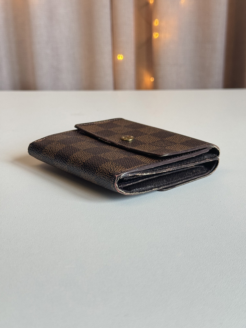The Louis Vuitton Damier Ebone Wallet is in good condition with light signs of use on the exterior. The sides show some wear, and the interior has peeling. There is space for cash, coins, and cards. The dimensions are 10.5 x 10 cm. This wallet comes with a Louis Vuitton dustbag.
