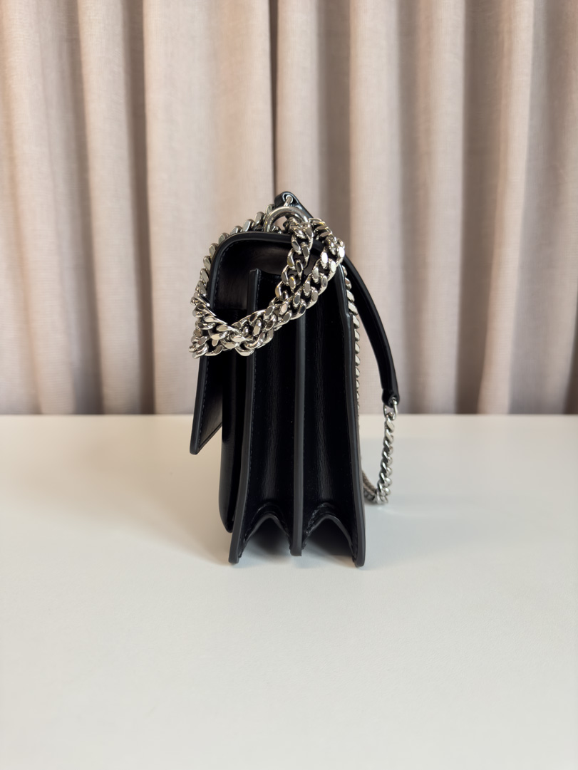 This pre-loved Saint Laurent Sunset bag in black leather is in excellent condition. It features silver-tone hardware, a structured shape, and a clean interior. Can be worn over the shoulder or crossbody thanks to the versatile chain strap. There are little to no visible signs of wear. Comes with dustbag and original receipt. Dimensions: 22 x 15 x 7 cm.